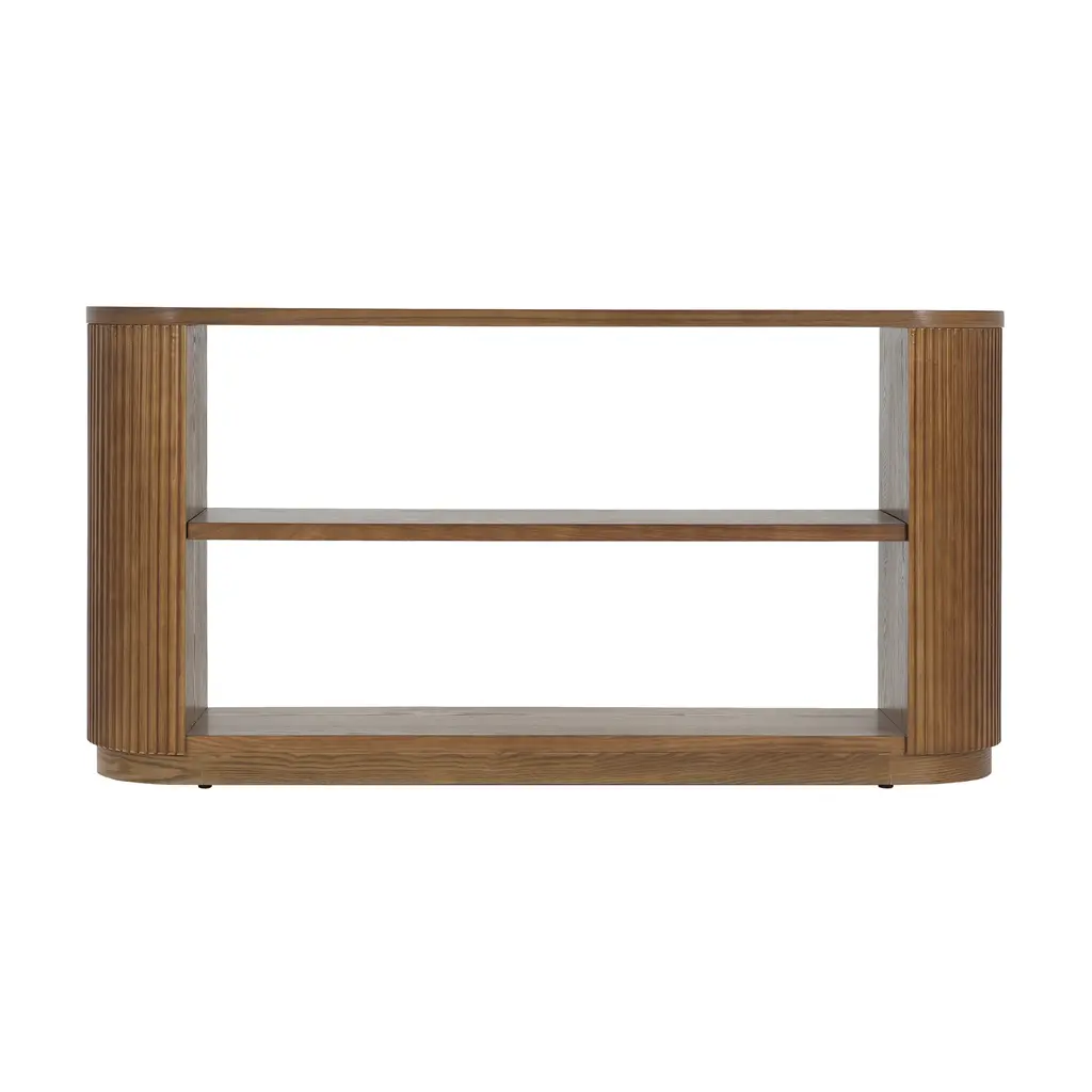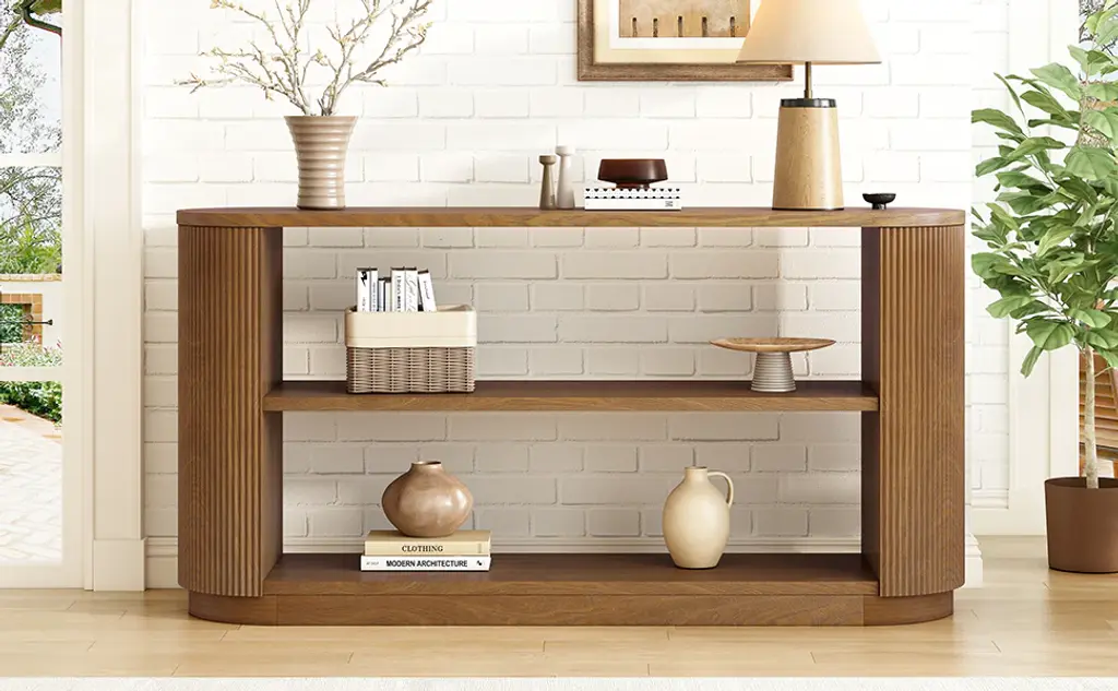 Versatile Entryway & Sofa Table:Designed for modern homes, this sleek console table works perfectly as an entryway organizer or behind-the-sofa accent piece. Its slim profile 14.17" deep fits effortlessly in tight spaces while adding stylish functionality to any room.; Triple-Tier Storage & Display Space:Features a spacious tabletop, middle shelf, and sturdy base - offering 3 generous surfaces to display decor, store baskets, or keep daily essentials organized. The open design creates an airy feel while providing practical storage.; Trendsetting Curved & Fluted Design:Crafted with elegant curved edges and contemporary vertical fluting (made with premium ash wood veneer), this table combines safety and style. The unique ribbed detailing adds visual interest to your modern interior.; Premium Wood Veneer Construction:Built with real wood veneer over engineered wood, this table showcases authentic wood grain patterns with a smooth, high-end finish. The durable construction ensures lasting beauty that elevates your home decor.