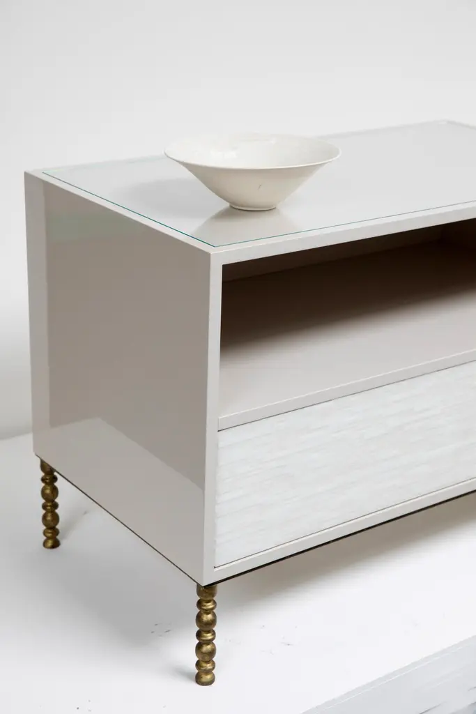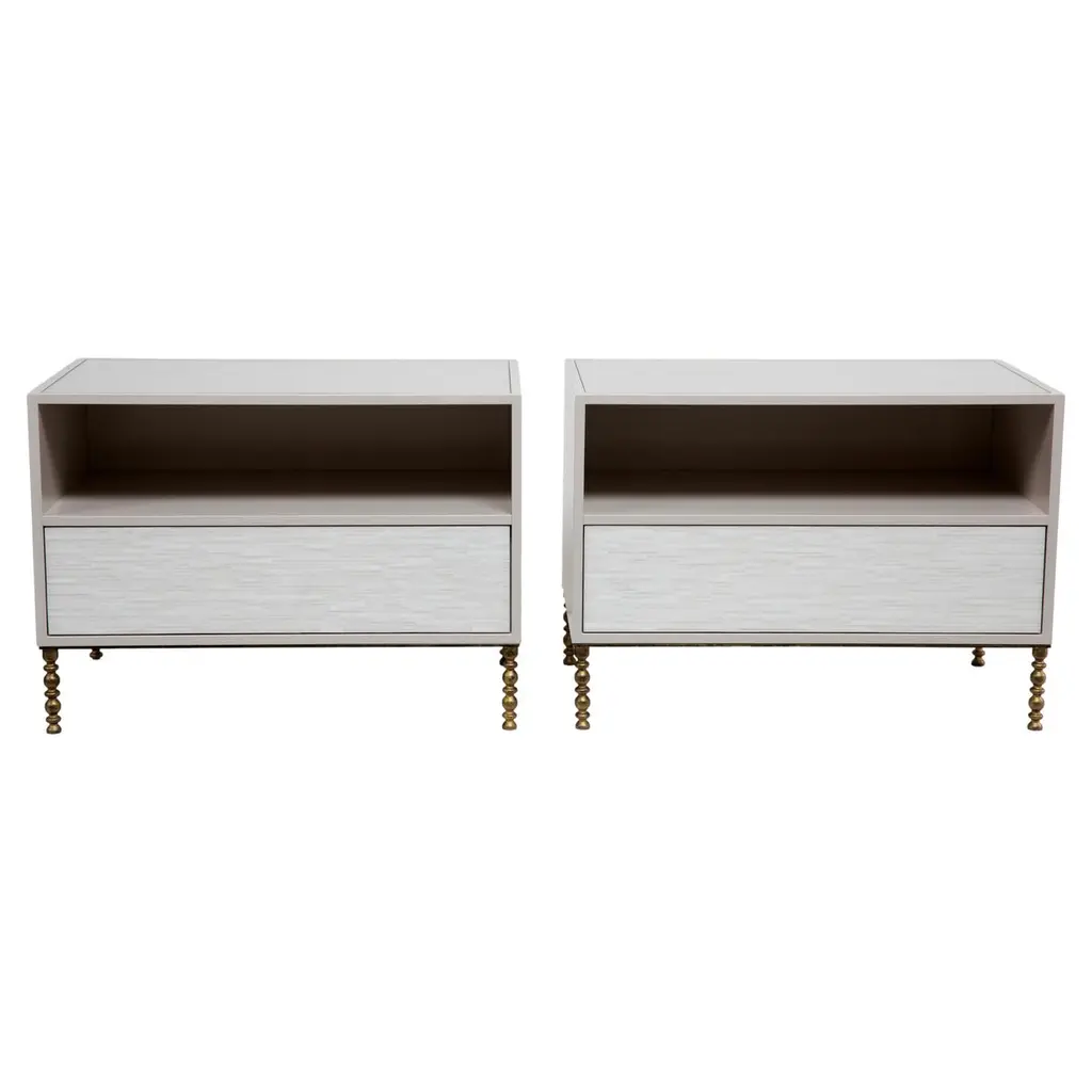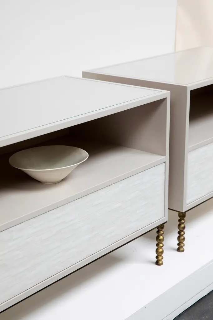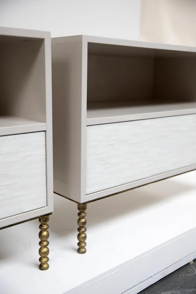 The Modern One-Drawer Mosaic Nightstands with Vintage Base feature a single touch-latch drawer with hand-cut Icy White glass stripe mosaic, an open top shelf, an inset glass top, Misty Grey Lacquer finish, and a gilded vintage style metal base. Custom sizes and finishes available. Made in Brooklyn.