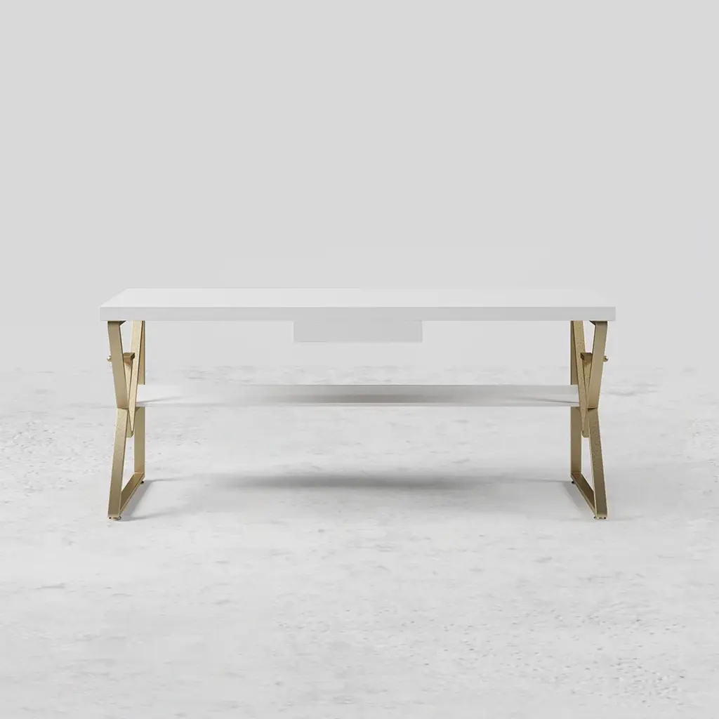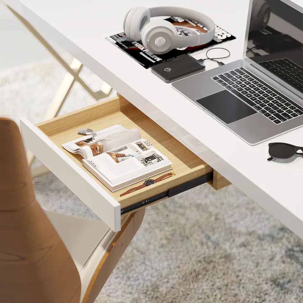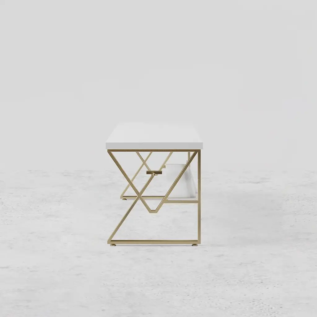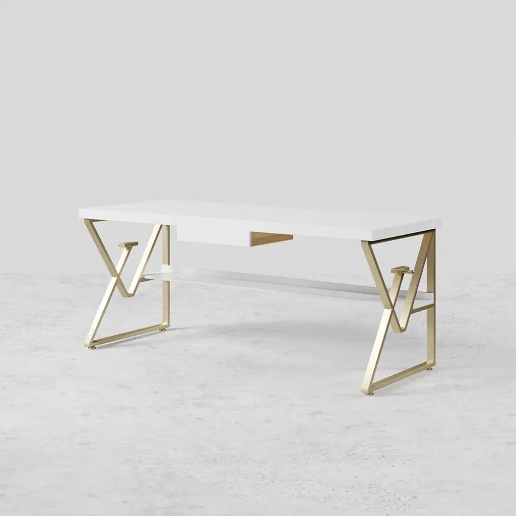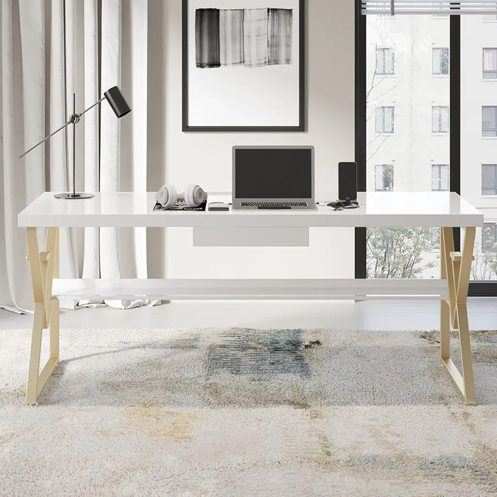 Modern White Writing Desk With Drawer & Shelf Wood Top & Metal Frame
