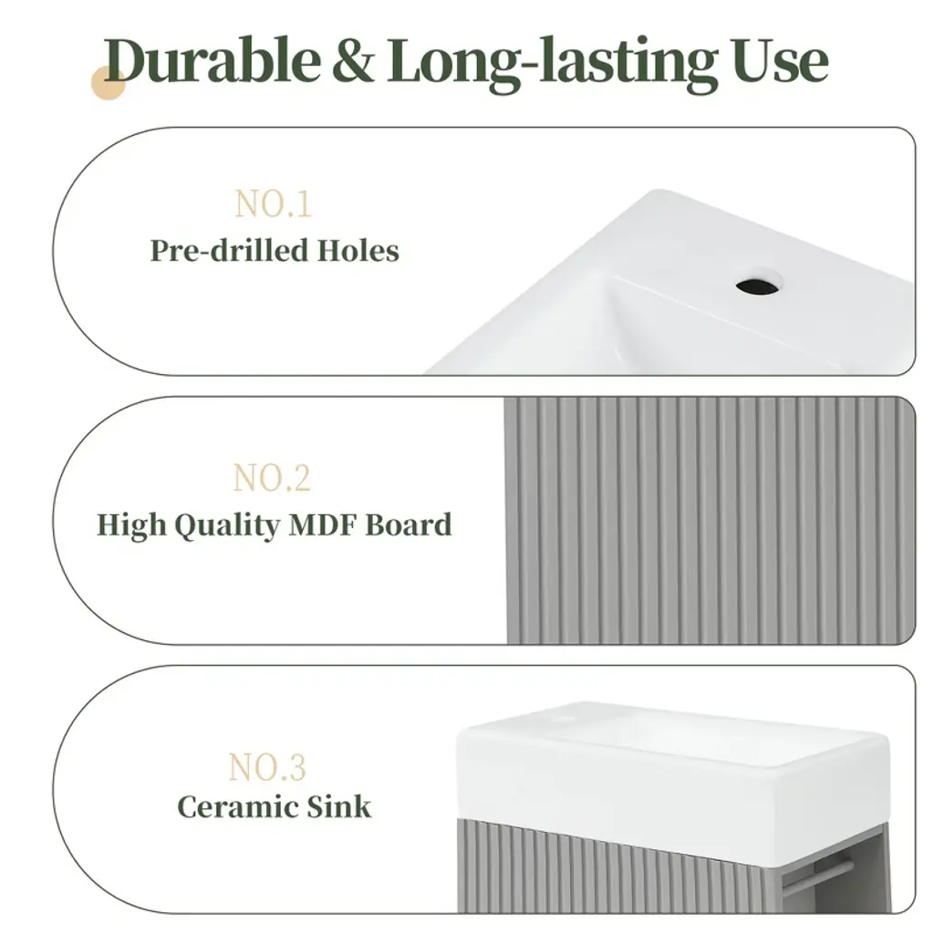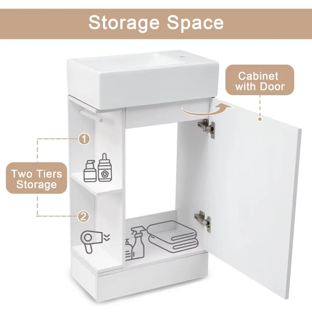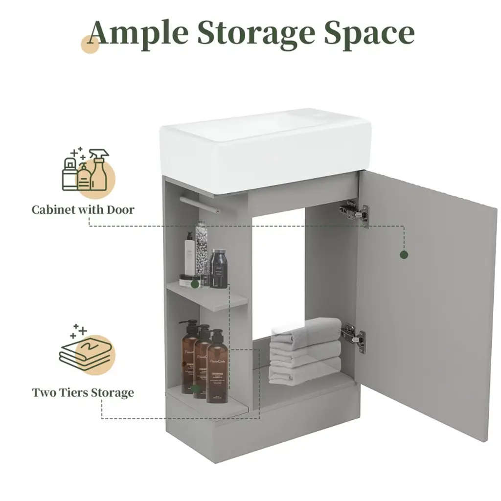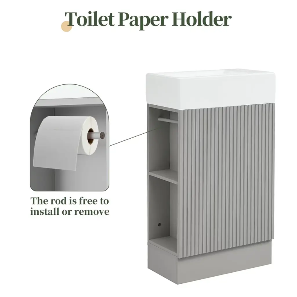 Product Introduction The 18.6" Mshliw Bathroom Vanity offers a practical and modern solution for smaller bathrooms. Designed with both style and function in mind, this vanity includes a durable ceramic sink, ample storage space, and flexible orientation for the shelf and toilet paper holder. Product Features - Sturdy and Durable Material: Constructed from MDF boards, this vanity is built for long-lasting durability. The water-resistant and stain-proof surface ensures that the vanity remains easy to clean and maintain over time. - Smooth Ceramic Sink: Featuring a ceramic sink with a single hole faucet mount, this vanity is designed for easy cleaning. The smooth surface ensures that water stains are easily wiped away. (Faucet not included.) - Versatile Storage Design: The vanity includes a cabinet with a door, a two-tier storage shelf on the side, and a toilet paper holder, providing ample space for all your bathroom essentials such as soaps, towels, shampoos, and tissue paper. - Flexible Orientation: This vanity can be installed with the shelf and toilet paper holder on either the left or right side, allowing for custom placement based on your space and preference. Specifications - Overall Dimensions: 18.6" L x 10.6" W x 33.2" H (44.10 lbs) - Cabinet Dimensions: 18.5" L x 10.6" W x 28.1" H (21.50 lbs) - Sink Dimensions: 18.6" L x 10.6" W x 5" H (22.60 lbs) - Material: MDF Board, Ceramic - Sink Type: Undermount; Drop-In - Faucet Mount: Single Hole (not included) - Storage Features: 1 Door, 2-Tier Shelf, Toilet Paper Holder - Assembly: Required - Capacity: 80 lbs Note Assembly required. All necessary hardware and instruction manual are included for easy installation.