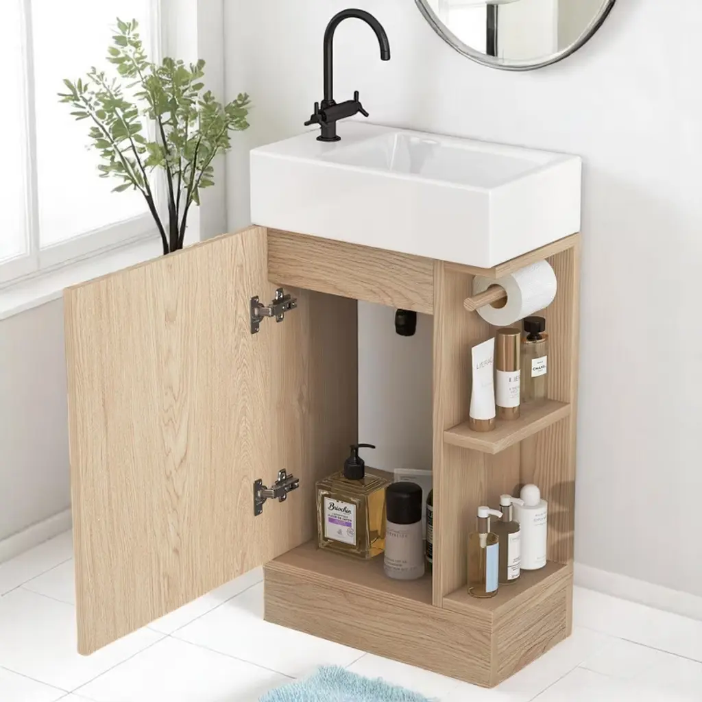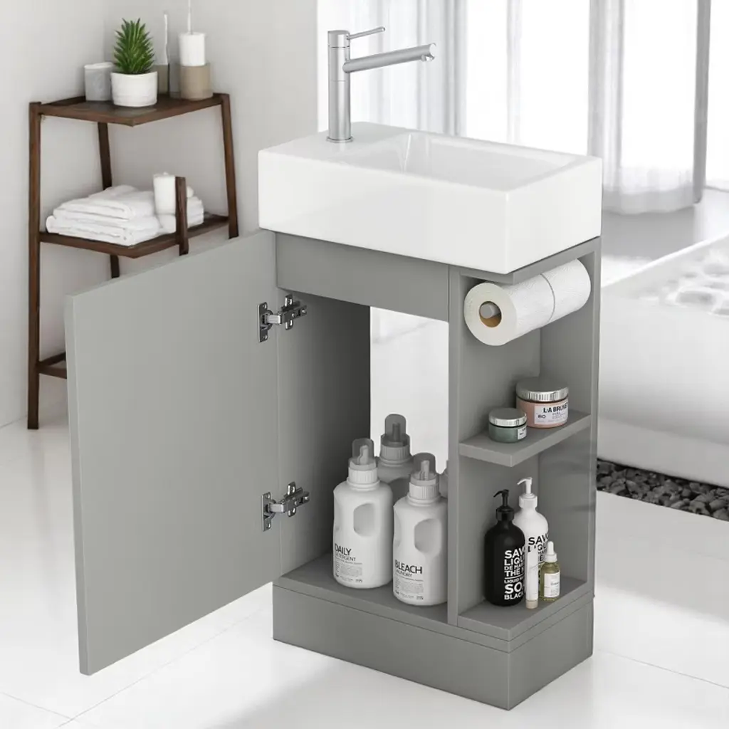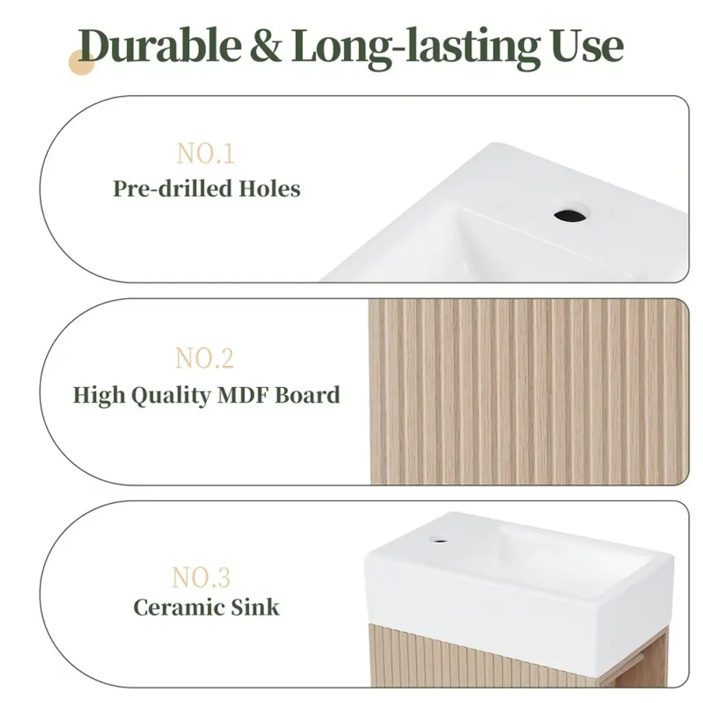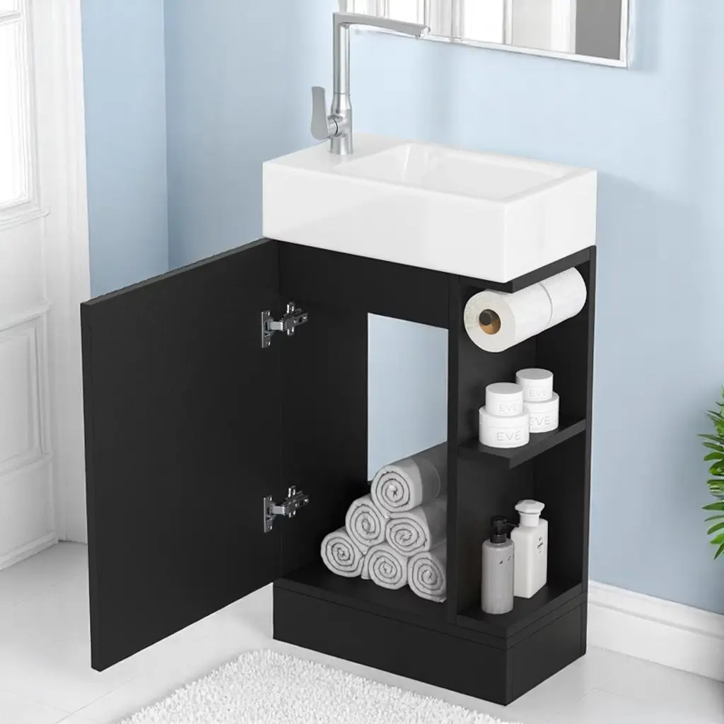 Product Introduction The 18.6" Mshliw Bathroom Vanity offers a practical and modern solution for smaller bathrooms. Designed with both style and function in mind, this vanity includes a durable ceramic sink, ample storage space, and flexible orientation for the shelf and toilet paper holder. Product Features - Sturdy and Durable Material: Constructed from MDF boards, this vanity is built for long-lasting durability. The water-resistant and stain-proof surface ensures that the vanity remains easy to clean and maintain over time. - Smooth Ceramic Sink: Featuring a ceramic sink with a single hole faucet mount, this vanity is designed for easy cleaning. The smooth surface ensures that water stains are easily wiped away. (Faucet not included.) - Versatile Storage Design: The vanity includes a cabinet with a door, a two-tier storage shelf on the side, and a toilet paper holder, providing ample space for all your bathroom essentials such as soaps, towels, shampoos, and tissue paper. - Flexible Orientation: This vanity can be installed with the shelf and toilet paper holder on either the left or right side, allowing for custom placement based on your space and preference. Specifications - Overall Dimensions: 18.6" L x 10.6" W x 33.2" H (44.10 lbs) - Cabinet Dimensions: 18.5" L x 10.6" W x 28.1" H (21.50 lbs) - Sink Dimensions: 18.6" L x 10.6" W x 5" H (22.60 lbs) - Material: MDF Board, Ceramic - Sink Type: Undermount; Drop-In - Faucet Mount: Single Hole (not included) - Storage Features: 1 Door, 2-Tier Shelf, Toilet Paper Holder - Assembly: Required - Capacity: 80 lbs Note Assembly required. All necessary hardware and instruction manual are included for easy installation.