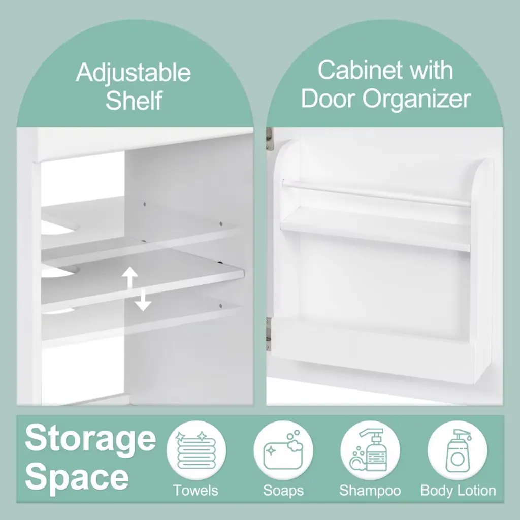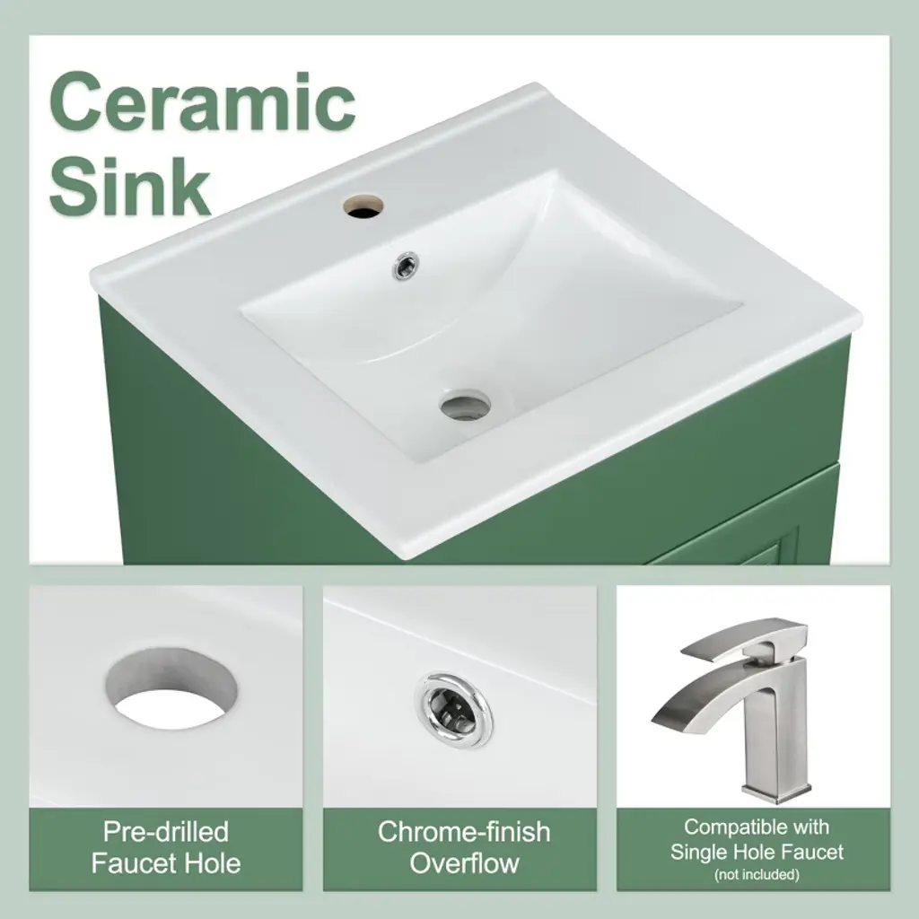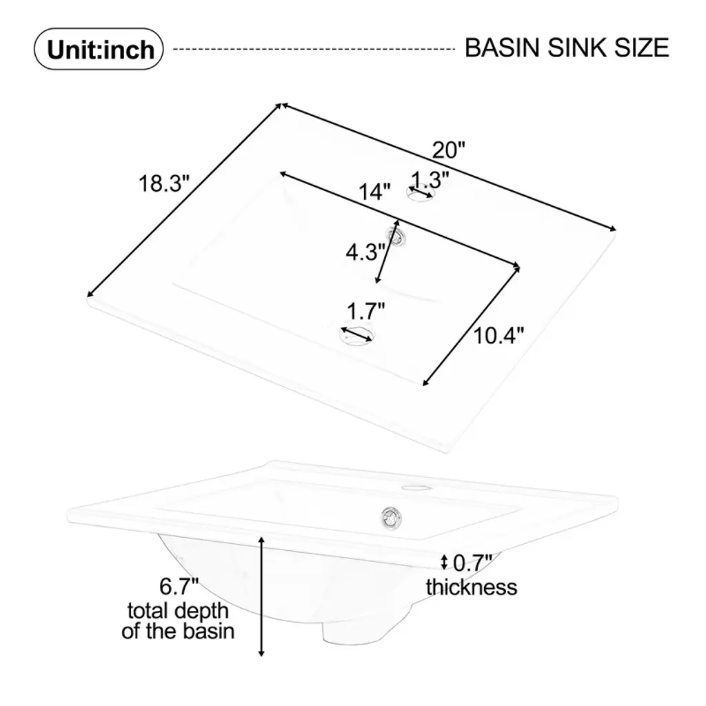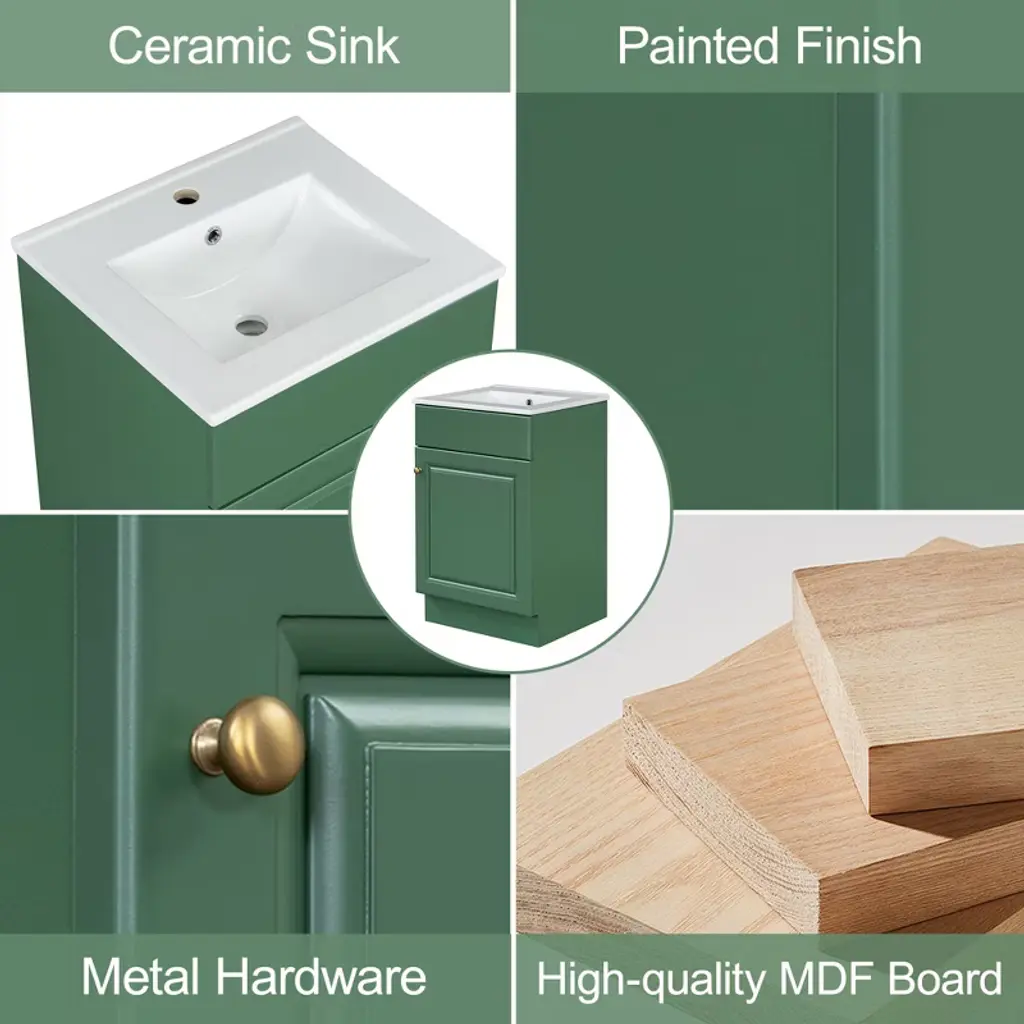 Product Introduction The Mshliw 20" bathroom vanity is the ideal choice for compact bathrooms or powder rooms. With its clean design, solid ceramic sink, and smart storage layout, this vanity provides modern convenience without sacrificing style. Product Features - Durable MDF Construction: Made of quality MDF board and finished with water-resistant paint, this vanity ensures stability and easy maintenance in humid environments. - Ceramic Sink with Overflow: The ceramic sink has a smooth, waterproof finish that resists stains. A pre-drilled hole fits a single-hole faucet (not included), and the metal-ring overflow prevents accidental water spills. - Soft-Closing Door: The metal hinges and handle are built to last, while the soft-close mechanism ensures quiet operation, reducing wear and extending cabinet life. - Functional Storage Design: Features a right-oriented door shelf for smaller items and an adjustable interior shelf that allows you to customize storage for various toiletries. - Quick Assembly: Ships in one box with all hardware and an instruction manual included. Assembly is simple and straightforward. Specifications - Overall Dimensions: 20"L x 18.3"W x 32.2"H - Cabinet Base: 19.5"L x 18"W x 31.5"H - Sink Top: 20"L x 18.3"W x 4.3"H - Edge Thickness: 0.7" - Material: MDF Board, Ceramic Sink - Mounting Type: Freestanding - Sink Type: Drop-In; Undermount - Sink Placement: Center - Faucet Mount: Single Hole (faucet not included) - Shape: Rectangular - Finish: Painted - Number of Sinks: 1 - Number of Doors: 1 - Number of Drawers: 0 - Weight Capacity: 150 lbs - Backsplash/Sidesplash: Not Included - Assembly Required: Yes - Hardware Included: Yes Note Faucet is not included. Please follow the included instructions for assembly. Keep surfaces dry to preserve the painted finish.