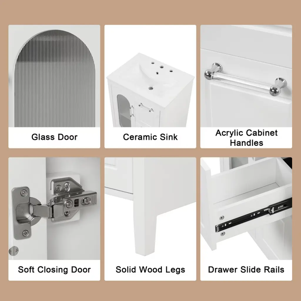 Product Introduction This 24" Mshliw Bathroom Vanity combines modern style and functionality. Designed for smaller bathrooms, it features a smooth ceramic sink, ample storage with two drawers and an adjustable shelf, and a sturdy base made from solid wood and MDF. This vanity offers both elegance and practicality. Product Features - Smooth Ceramic Sink: The durable ceramic sink features a sleek, waterproof finish that resists water stains. Pre-drilled holes are compatible with an 8" widespread faucet (sold separately), and the overflow with a metal circle prevents spills when the faucet is left on. - Quality Construction: The base of this vanity is crafted from solid rubber wood and durable MDF boards, ensuring strength and long-lasting performance. The cabinet door features moru glass, adding a unique, hazy aesthetic to your bathroom. - Spacious Storage: With a cabinet featuring an adjustable shelf and two smooth-gliding drawers, this vanity offers ample space for all your bathroom essentials, including towels, soap, and toiletries. - Adjustable Shelf: The shelf inside the cabinet can be adjusted to three different heights, allowing for versatile storage of items in various sizes, such as body lotion and shampoo. Specifications - Overall Dimensions: 24" L x 18.3" W x 33.2" H (83.61 lbs) - Cabinet Dimensions: 24" L x 18.3" W x 32.4" H (59.36 lbs) - Sink Top Dimensions: 24" L x 18.3" W x 4.7" H (24.25 lbs) - Material: Solid Rubber Wood, MDF Board, Moru Glass, Ceramic - Sink Depth: 4.7" - Faucet Mount: 8" (not included) - Storage: 1 Door, 2 Drawers, 1 Adjustable Shelf - Assembly: Required - Capacity: 150 lbs Note Assembly is required. All hardware and an instruction manual are included for easy installation.