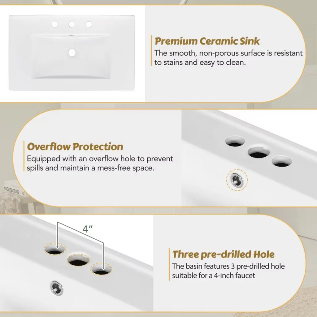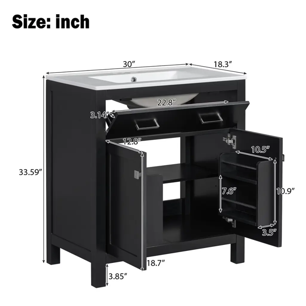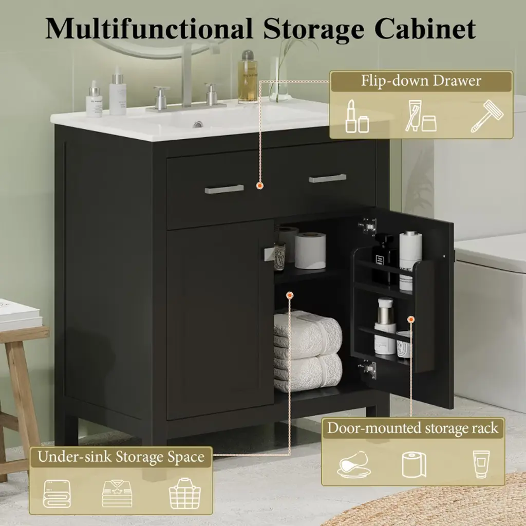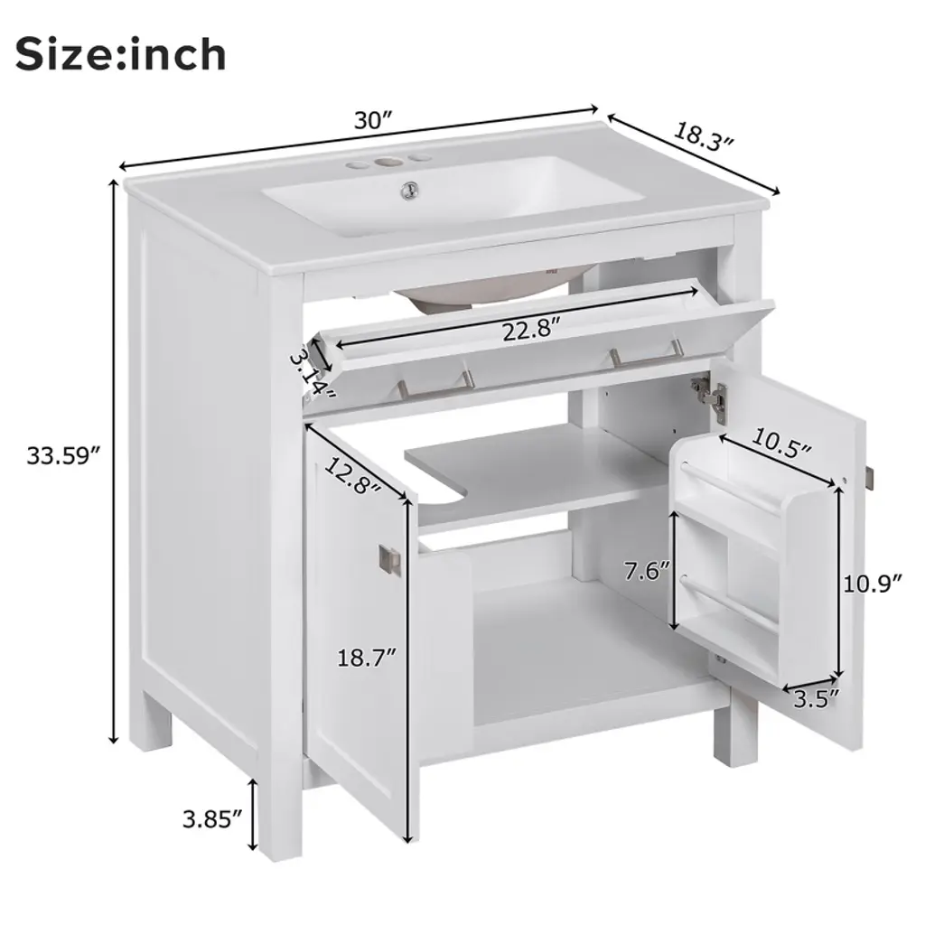 Product Introduction Upgrade your bathroom with this 30-inch modern vanity that perfectly blends space-saving functionality and elegant design. Ideal for small to medium-sized bathrooms, this freestanding unit features a durable ceramic sink, soft-close doors, adjustable U-shaped shelf, and a smart flip-out drawer for added convenience. Product Features Compact Yet Functional – Measuring 30"W x 18.3"D x 33.59"H, this vanity is perfect for maximizing storage in limited spaces. Multi-Level Storage – Includes a flip-out drawer with a 45° opening angle, two cabinet doors with inner storage racks, and a height-adjustable U-shaped shelf to fit around plumbing. Quiet Soft-Close Doors – High-quality hinges ensure smooth, silent closing to avoid slamming and extend the cabinet's lifespan. Sturdy & Reliable Build – Constructed with a solid wood frame and premium MDF panels for superior stability and durability. Glossy Ceramic Sink – The sink features a smooth, stain-resistant finish and rectangular design that adds elegance and ease of cleaning. Thoughtful Interior Design – Built with functionality in mind, the interior layout offers versatile storage while maintaining a clean, minimalist look. Easy Setup – Shipped in a single package with all hardware and a detailed instruction manual for simple, two-person assembly. Specifications Overall Dimensions: 30"W x 18.3"D x 33.59"H Sink Dimensions: 30"W x 18.3"D x 6.7"H Vanity Cabinet Dimensions: 29.5"W x 18"D x 33"H Sink Package Dimensions: 36.8"L x 23"W x 19.9"H Weight: Total 94.84 lbs (Sink: 32.45 lbs, Cabinet: 62.39 lbs) Weight Capacity: Overall: 220 lbs; Drawer: 50 lbs; Shelf: 50 lbs Style: Modern Mounting Type: Free-standing Sink Material: Ceramic Cabinet Material: Solid Wood + MDF Finish Type: Painted Finish Sink Type: Undermount/Drop-in Sink Shape: Rectangular Faucet Mount Type: 4" Centerset (Faucet Not Included) Overflow Hole: Yes Vanity Top Edge Type: Flat, Edge Thickness: 0.59" Number of Doors: 2 Number of Drawers: 1 Flip-Out Drawer Soft Close Hinges: Yes Assembly: Required Number of Packages: 1 Backsplash Included: No Note This bathroom vanity ships in one box and includes all necessary hardware and a paper instruction manual. Faucet and drain not included. Assembly required. For best results, we recommend two people for setup.