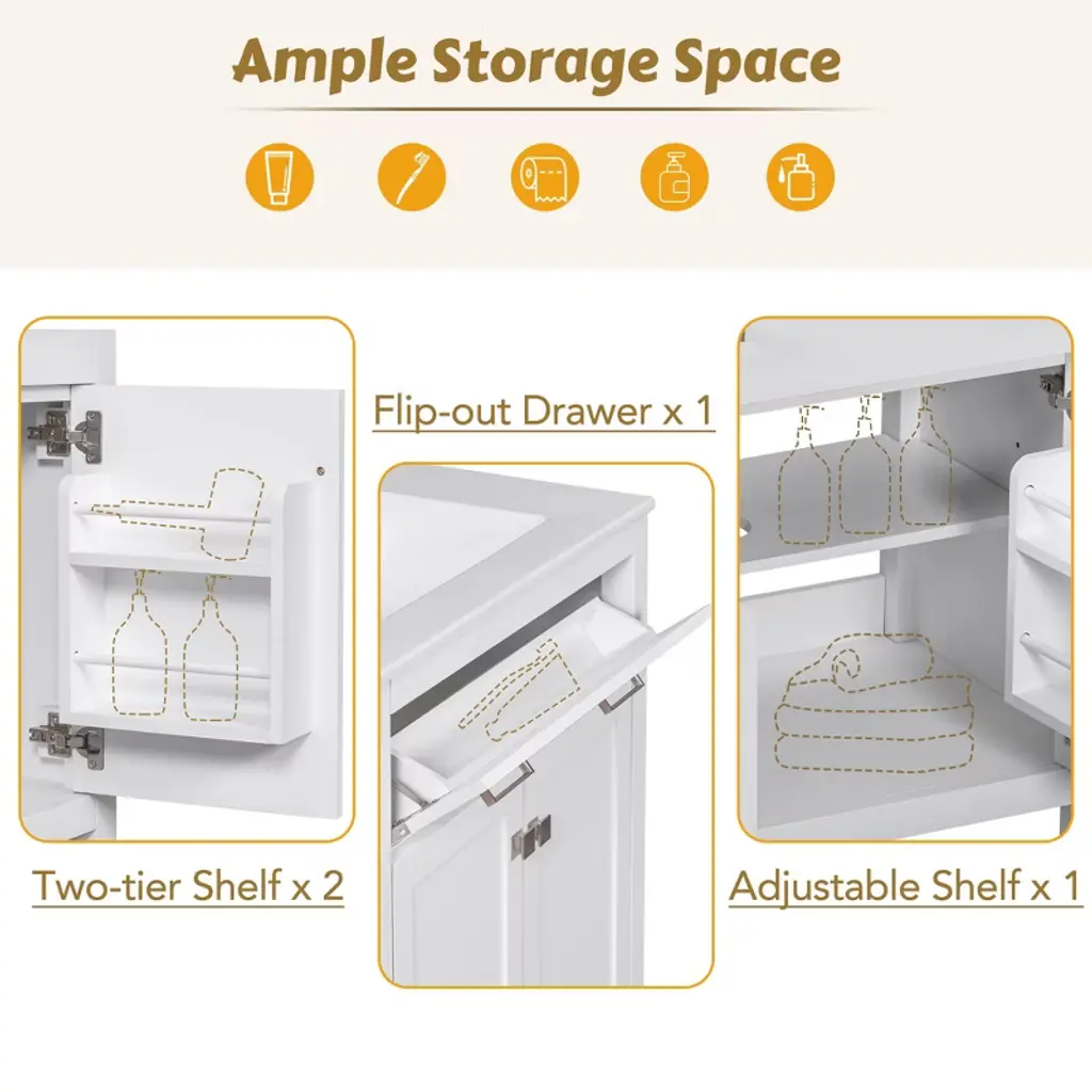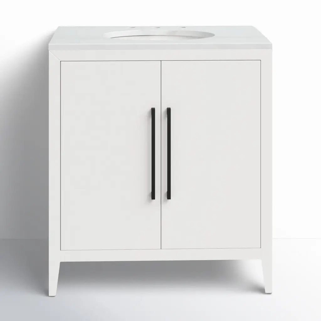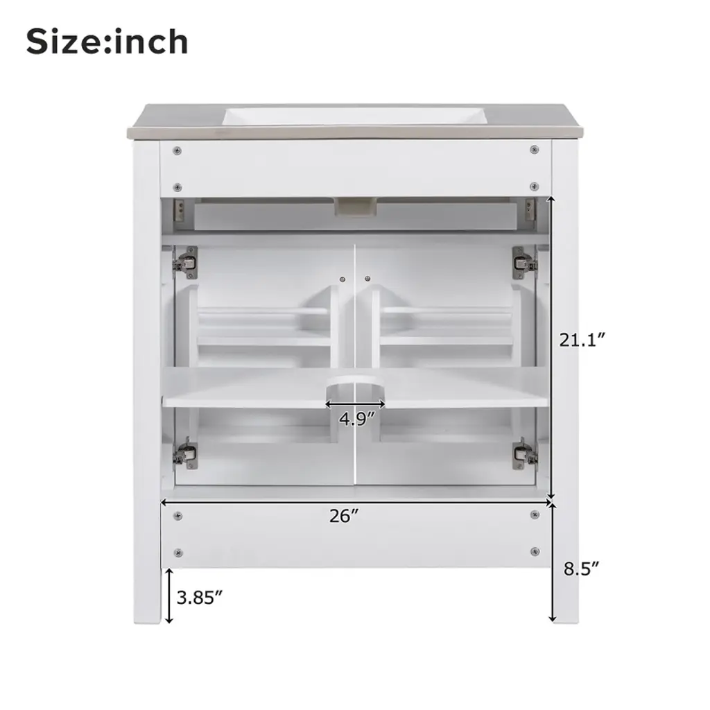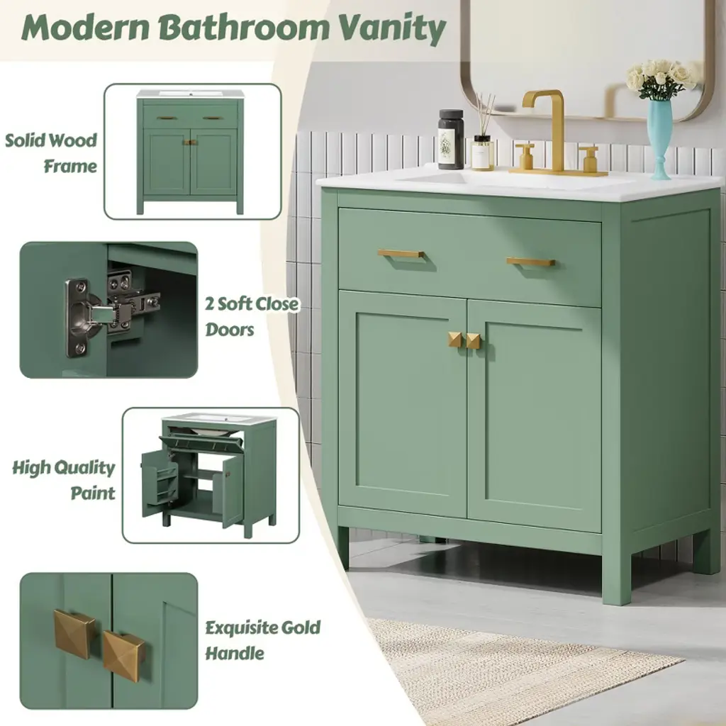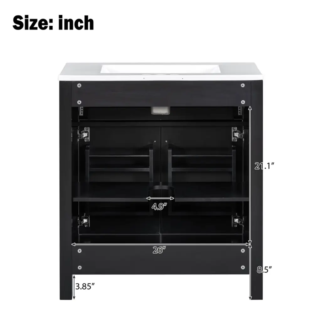Product Introduction Upgrade your bathroom with this 30-inch modern vanity that perfectly blends space-saving functionality and elegant design. Ideal for small to medium-sized bathrooms, this freestanding unit features a durable ceramic sink, soft-close doors, adjustable U-shaped shelf, and a smart flip-out drawer for added convenience. Product Features Compact Yet Functional – Measuring 30"W x 18.3"D x 33.59"H, this vanity is perfect for maximizing storage in limited spaces. Multi-Level Storage – Includes a flip-out drawer with a 45° opening angle, two cabinet doors with inner storage racks, and a height-adjustable U-shaped shelf to fit around plumbing. Quiet Soft-Close Doors – High-quality hinges ensure smooth, silent closing to avoid slamming and extend the cabinet's lifespan. Sturdy & Reliable Build – Constructed with a solid wood frame and premium MDF panels for superior stability and durability. Glossy Ceramic Sink – The sink features a smooth, stain-resistant finish and rectangular design that adds elegance and ease of cleaning. Thoughtful Interior Design – Built with functionality in mind, the interior layout offers versatile storage while maintaining a clean, minimalist look. Easy Setup – Shipped in a single package with all hardware and a detailed instruction manual for simple, two-person assembly. Specifications Overall Dimensions: 30"W x 18.3"D x 33.59"H Sink Dimensions: 30"W x 18.3"D x 6.7"H Vanity Cabinet Dimensions: 29.5"W x 18"D x 33"H Sink Package Dimensions: 36.8"L x 23"W x 19.9"H Weight: Total 94.84 lbs (Sink: 32.45 lbs, Cabinet: 62.39 lbs) Weight Capacity: Overall: 220 lbs; Drawer: 50 lbs; Shelf: 50 lbs Style: Modern Mounting Type: Free-standing Sink Material: Ceramic Cabinet Material: Solid Wood + MDF Finish Type: Painted Finish Sink Type: Undermount/Drop-in Sink Shape: Rectangular Faucet Mount Type: 4" Centerset (Faucet Not Included) Overflow Hole: Yes Vanity Top Edge Type: Flat, Edge Thickness: 0.59" Number of Doors: 2 Number of Drawers: 1 Flip-Out Drawer Soft Close Hinges: Yes Assembly: Required Number of Packages: 1 Backsplash Included: No Note This bathroom vanity ships in one box and includes all necessary hardware and a paper instruction manual. Faucet and drain not included. Assembly required. For best results, we recommend two people for setup.