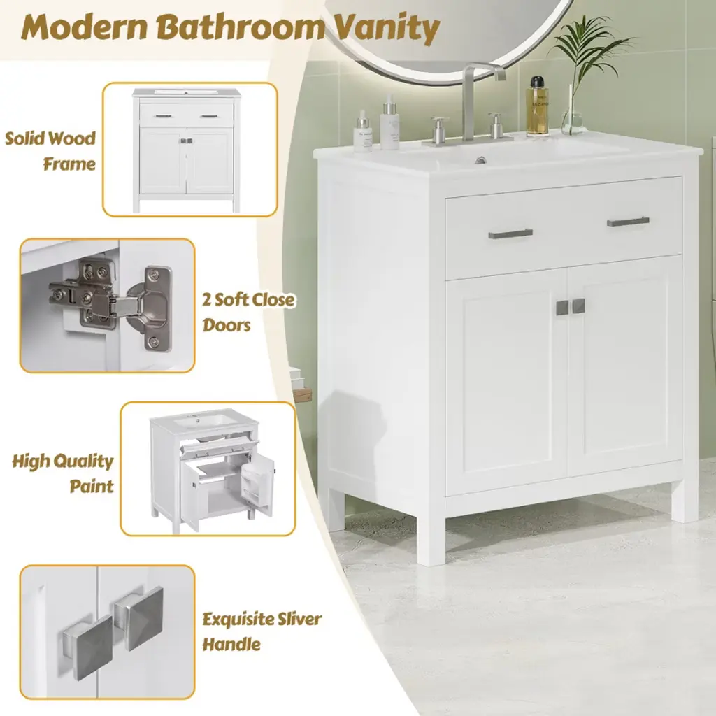 Mshliw 30" Modern Bathroom Vanity With Ceramic Sink, Soft-close Doors, Flip-out Drawer & Adjustable U-shaped Shelf(white)