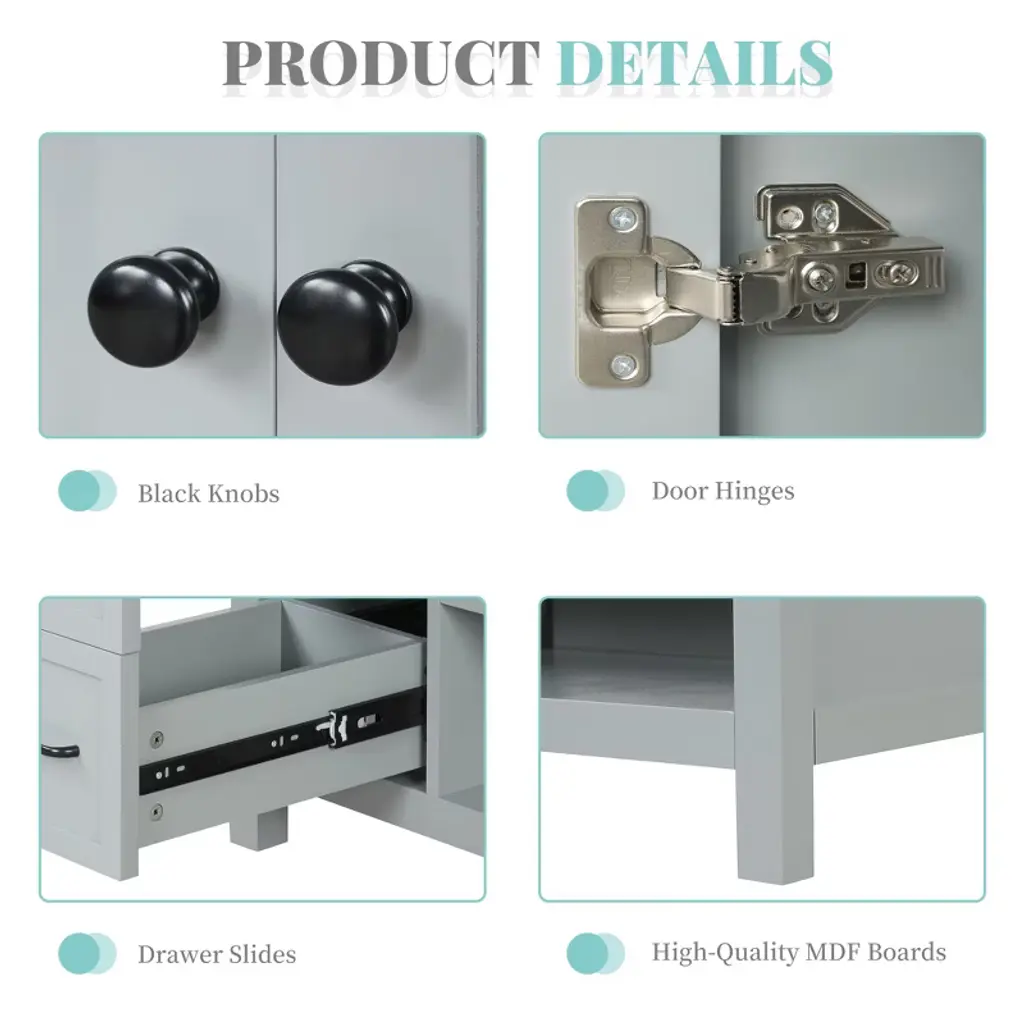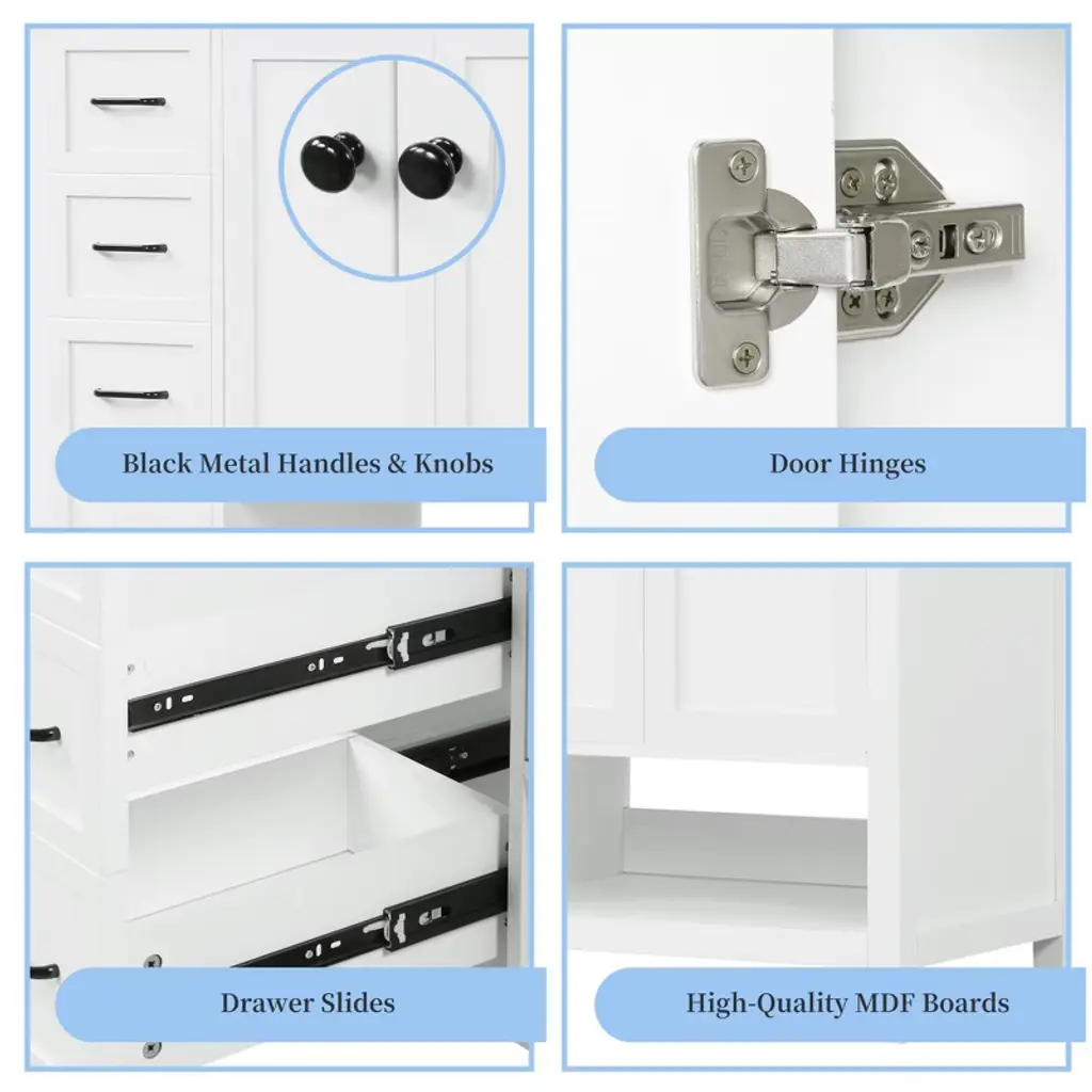 Product Introduction Elevate your bathroom with the Mshliw 36-inch freestanding vanity, designed to deliver both refined style and efficient storage. Built with a sturdy combination of solid wood and MDF boards, this vanity features a glossy ceramic sink and a spacious cabinet that fits seamlessly into any modern space. Product Features Durable & Easy to Maintain: Crafted from a solid wood frame and premium MDF, the vanity boasts excellent water resistance and long-term durability. Its painted finish resists moisture and stains, making it ideal for everyday use. Premium Ceramic Sink: The integrated white ceramic sink includes overflow protection and three pre-drilled holes for an 8" widespread faucet (not included). Positioned on the right side, its smooth surface is easy to clean and maintain. Smart Storage Configuration: Features a 2-door cabinet and 2 functional drawers with smooth slide rails, plus an open shelf for extra storage. Keep all your toiletries and essentials neatly organized and dust-free. Single-Package Shipping & Quick Assembly: Delivered in one convenient box, the vanity includes all hardware and a clear instruction manual for a hassle-free setup process. Specifications Overall Dimensions: 36"L x 18"W x 34"H Sink Depth: 6.82" Top Weight: 40.5 lbs Product Weight: 127.87 lbs Mounting Type: Freestanding Material: MDF Board & Ceramic Sink Sink Position: Right Sink Type: Undermount / Drop-In Faucet Mount: 8" Centerset (faucet not included) Style: Modern Storage: 2 Doors, 2 Drawers, 1 Open Shelf Weight Capacity: 200 lbs Assembly: Required Note This vanity set includes the ceramic sink and storage cabinet. Faucet and drain are not included. Assembly is required, and all hardware is included for a smooth installation. Two-person assembly is recommended for best results.