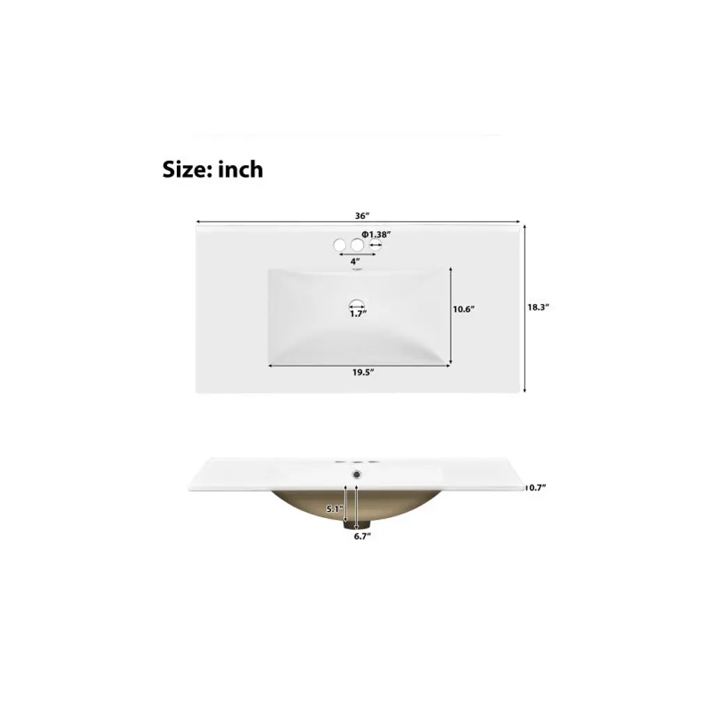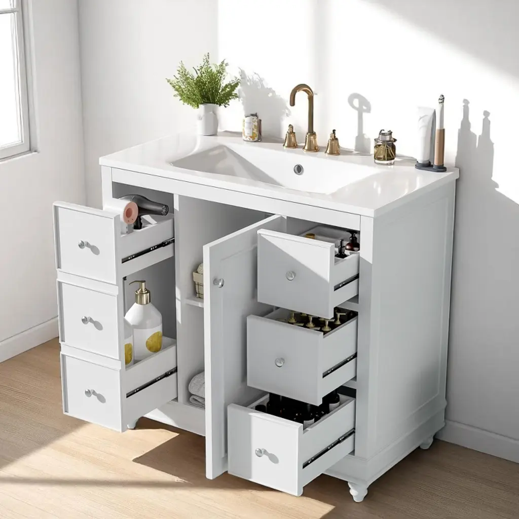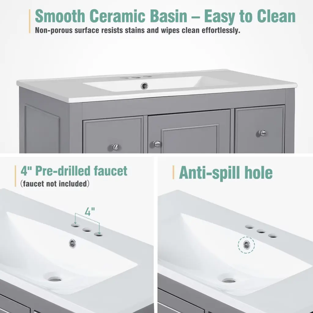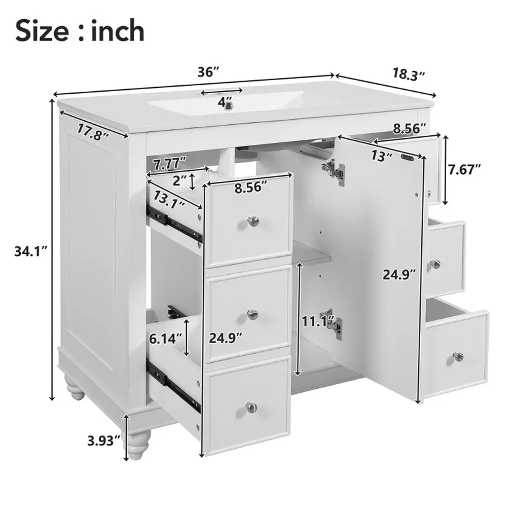 Product Introduction This 36-inch freestanding bathroom vanity combines elegance with practical functionality. With a ceramic sink, four drawers, and one door with adjustable shelving, it delivers organized storage while enhancing the look of any bathroom. Product Features • Space-Efficient Design – 36"W size offers generous counter and storage space, ideal for medium to large bathrooms. • Durable Ceramic Sink – Smooth, stain-resistant surface with overflow hole for added safety and easy maintenance. • Premium Build – Constructed with a solid wood frame and sturdy MDF boards, ensuring strength and long-lasting performance. • Moisture-Resistant Finish – Painted finish resists daily wear, extending the vanity’s durability. • Soft-Close Hinges – Prevents slamming, ensuring quiet operation and improved longevity. • Adjustable U-Shaped Shelf – Designed to clear plumbing while providing customizable storage for larger items. • Stylish Zinc Alloy Handles – Round silver knobs enhance usability while adding a modern touch. • Stable and Floor-Friendly – Equipped with protective leg pads to prevent scratches and moisture damage. • Multi-Drawer Storage – Includes a divided drawer, two shallow drawers, and one deep drawer for versatile organization. • Easy Assembly – Ships with hardware kit and manual for straightforward two-person installation. Specifications • Overall Product: 36"W x 18.3"D x 34.1"H, 129.41 lbs • Cabinet: 35.43"W x 17.8"D x 33.4"H, 93.25 lbs • Basin Sink: 36"W x 18.3"D x 6.7"H, 36.16 lbs • Inner Basin: 18"L x 10.5"W • Weight Capacity: Shelf 50 lbs / Drawer 10 lbs / Overall 200 lbs • Product Name: Bathroom Vanity • Style: Transitional • Mounting Type: Freestanding • Materials: Solid Wood + MDF Cabinet / Ceramic Sink / Zinc Alloy Handles • Finish Type: Painted • Sink Type: Undermount / Drop-in • Sink Shape: Rectangular • Faucet Mount: 4" Centerset (faucet not included) • Overflow Hole: Yes • Edge Thickness: 0.7" • Storage: 1 Door / 4 Drawers • Soft-Close Hinges: Yes • Assembly: Assembly Required, 1–2 people Note Measurements are approximate and may vary slightly. Product color may differ due to lighting or monitor settings.