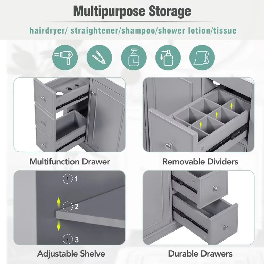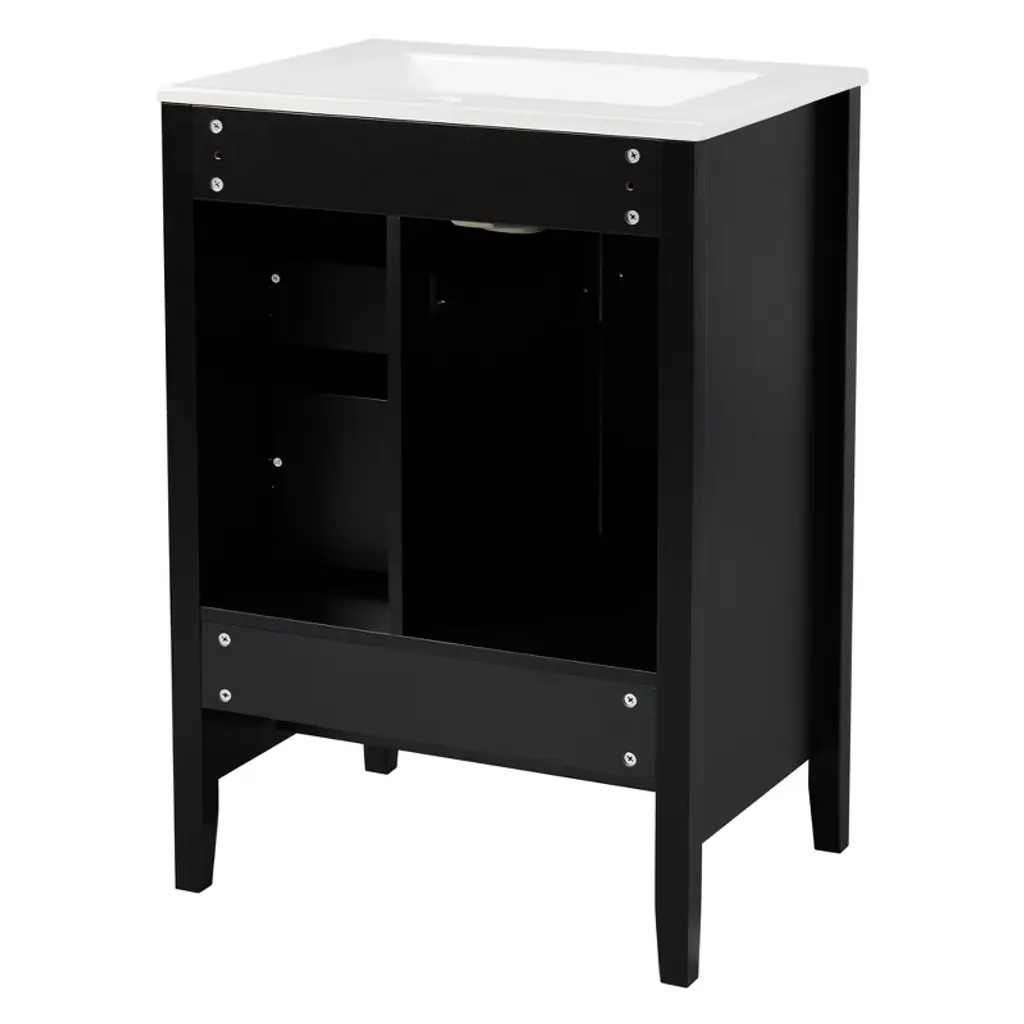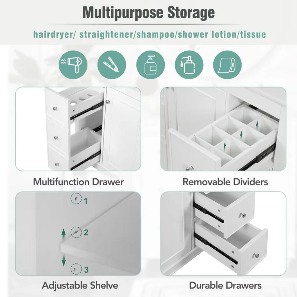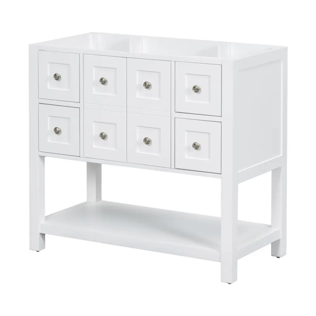 Product Introduction This 36-inch freestanding bathroom vanity combines elegance with practical functionality. With a ceramic sink, four drawers, and one door with adjustable shelving, it delivers organized storage while enhancing the look of any bathroom. Product Features • Space-Efficient Design – 36"W size offers generous counter and storage space, ideal for medium to large bathrooms. • Durable Ceramic Sink – Smooth, stain-resistant surface with overflow hole for added safety and easy maintenance. • Premium Build – Constructed with a solid wood frame and sturdy MDF boards, ensuring strength and long-lasting performance. • Moisture-Resistant Finish – Painted finish resists daily wear, extending the vanity’s durability. • Soft-Close Hinges – Prevents slamming, ensuring quiet operation and improved longevity. • Adjustable U-Shaped Shelf – Designed to clear plumbing while providing customizable storage for larger items. • Stylish Zinc Alloy Handles – Round silver knobs enhance usability while adding a modern touch. • Stable and Floor-Friendly – Equipped with protective leg pads to prevent scratches and moisture damage. • Multi-Drawer Storage – Includes a divided drawer, two shallow drawers, and one deep drawer for versatile organization. • Easy Assembly – Ships with hardware kit and manual for straightforward two-person installation. Specifications • Overall Product: 36"W x 18.3"D x 34.1"H, 129.41 lbs • Cabinet: 35.43"W x 17.8"D x 33.4"H, 93.25 lbs • Basin Sink: 36"W x 18.3"D x 6.7"H, 36.16 lbs • Inner Basin: 18"L x 10.5"W • Weight Capacity: Shelf 50 lbs / Drawer 10 lbs / Overall 200 lbs • Product Name: Bathroom Vanity • Style: Transitional • Mounting Type: Freestanding • Materials: Solid Wood + MDF Cabinet / Ceramic Sink / Zinc Alloy Handles • Finish Type: Painted • Sink Type: Undermount / Drop-in • Sink Shape: Rectangular • Faucet Mount: 4" Centerset (faucet not included) • Overflow Hole: Yes • Edge Thickness: 0.7" • Storage: 1 Door / 4 Drawers • Soft-Close Hinges: Yes • Assembly: Assembly Required, 1–2 people Note Measurements are approximate and may vary slightly. Product color may differ due to lighting or monitor settings.