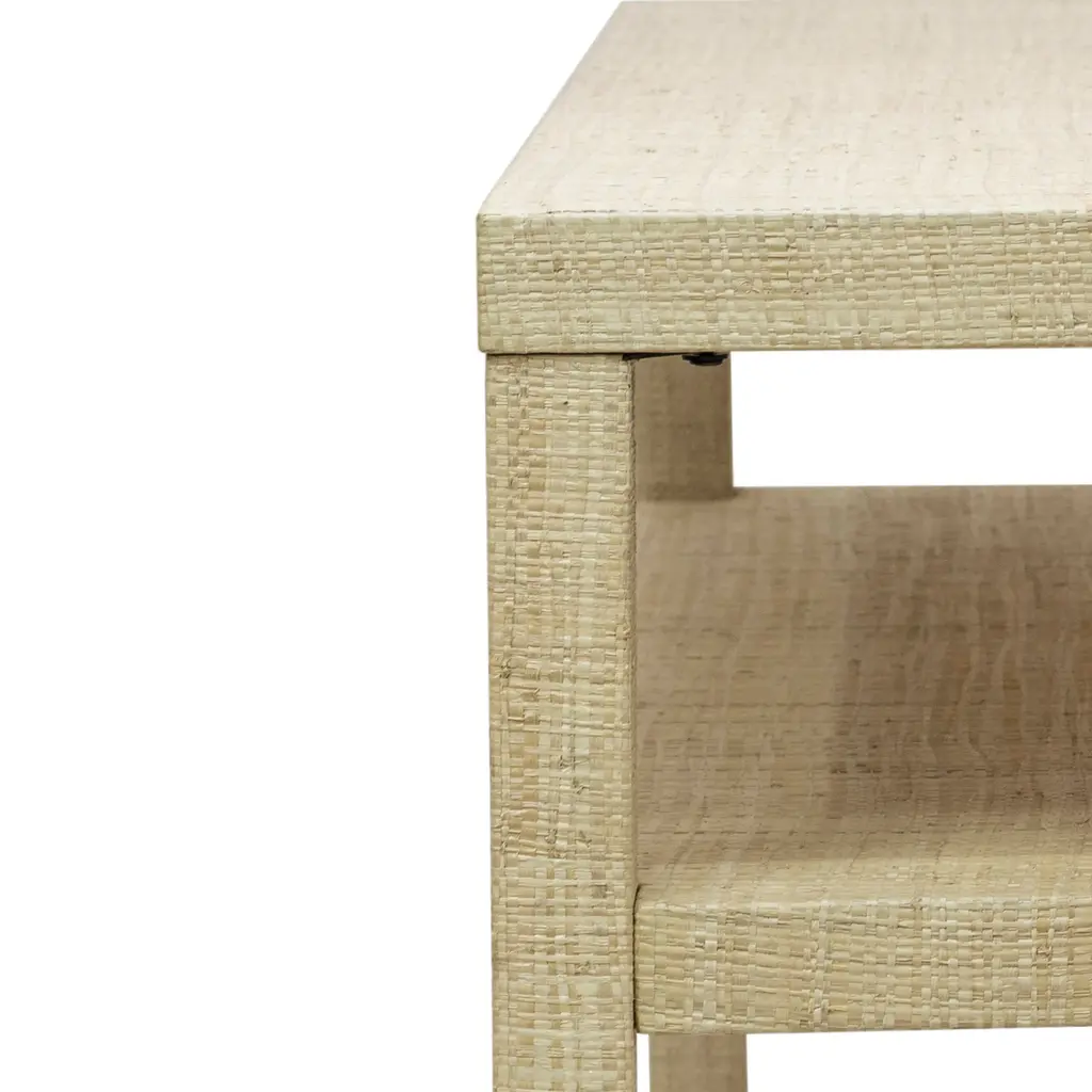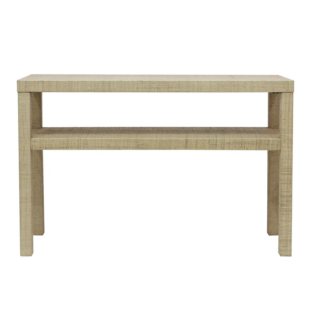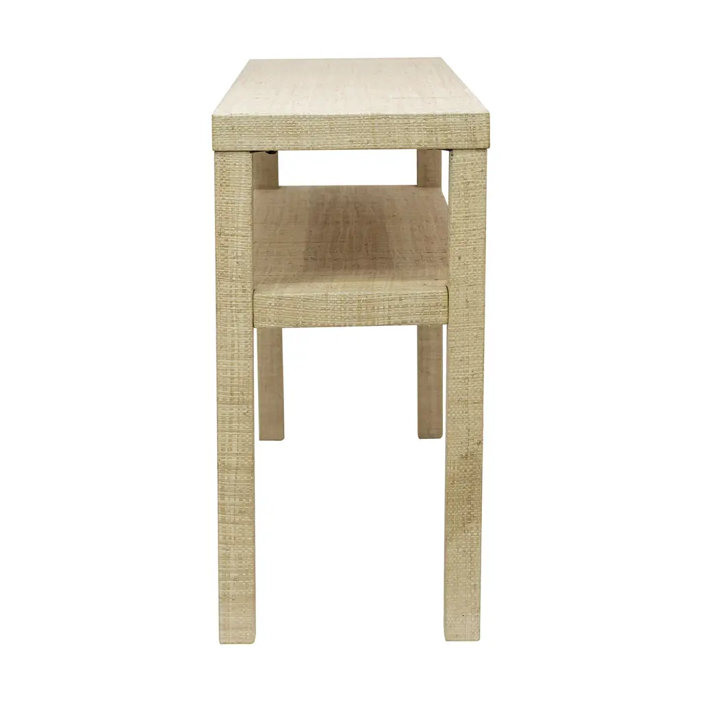 Bring natural textures and a relaxed, organic feel to your living room or entryway with this raffia-wrapped console table. Its solid wood frame is beautifully encased in raffia, offering a unique texture that evokes coastal charm. Two open shelves provide generous storage, perfect for displaying art books or vases filled with fresh blooms. Standing at 30†tall, it's a versatile piece that fits effortlessly behind your sofa or along any wall.