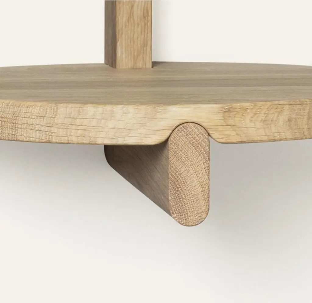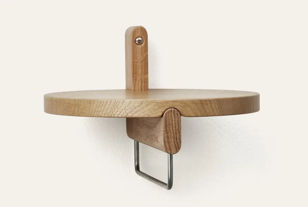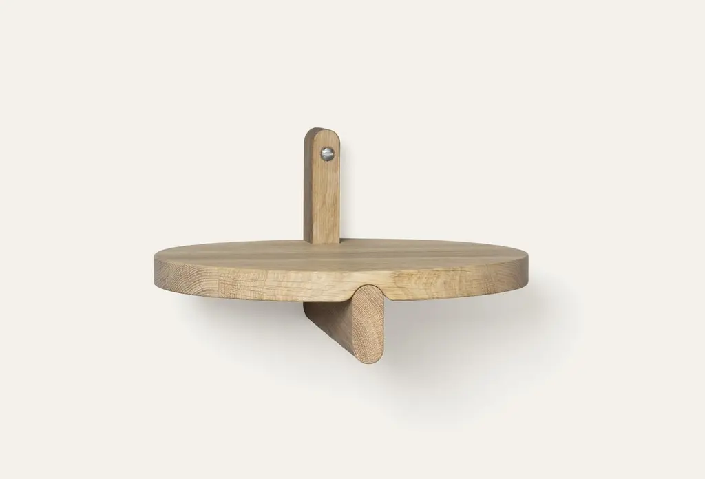 Natural Rondelle round shelf by Storängen DesignDimensions: D 25 x H 14 cmMaterials: oak wood.Available in other colors and with or without steel hanger.Rondelle can be a shelf or a small table depending on your needs. It shares the same characteristic meeting between top and console as Rond. This shelf made of solid oak suits fine in hallways or next to a bed, for your favourite book, plant or a special item. Singular or arranged together, the variations never stop.Storängen DesignIn early 2017 Mårten Cyrén and Torbjörn Källberg established Storängen Company – an idea 15 years in the making.In the fall of 2020 Mårtens son Carl replaced Torbjörn as CEO and co-owner. Together they continue to collaborate with a well-established network of designers, craftsmen and makers, and further develop a portfolio of furniture based on timeless ideals and modern Scandinavian design.Such as Storängen. A bold and charismatic offspring of the classic Windsor chair with uncompromising functionality and craftsmanship. The product that gave the company its name and with it came a simple idea: creating a direct and honest link between the craftsmen making the furniture, and the professional and private buyers they were intended for.Storängen furniture is sustainably sourced, classically designed and manufactured with a combination of traditional skills and modern techniques. It is furniture to last a life-time.