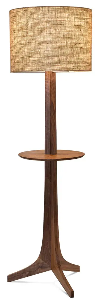 Nauta Floor Lamp, Brushed Brass, Walnut, Burlap, Matching Wood Shelf With Exposed Top Surface