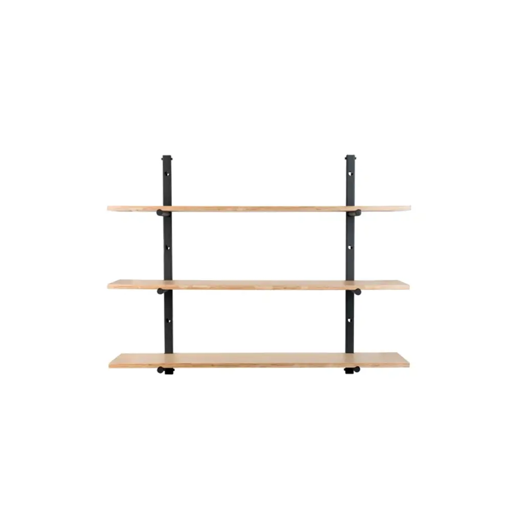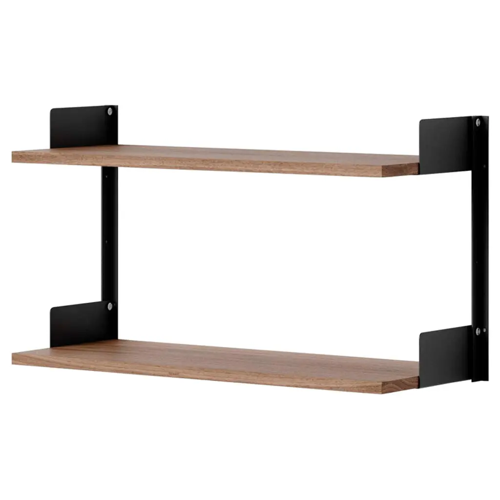 In a double-bay design with 2 shelves, creative director Knut Bendik Humlevik illustrates the versatility of New Works’ eponymous wall system that also offers room to grow as storage needs expand. Effortless blending into a variety of spaces, it hones in on essentials like the angular profiles of the steel support bars and the integrated bookends that keep belongings in place—the lacquered or woodgrain veneer shelves neatly assembled with flat knurled screws in stainless steel.