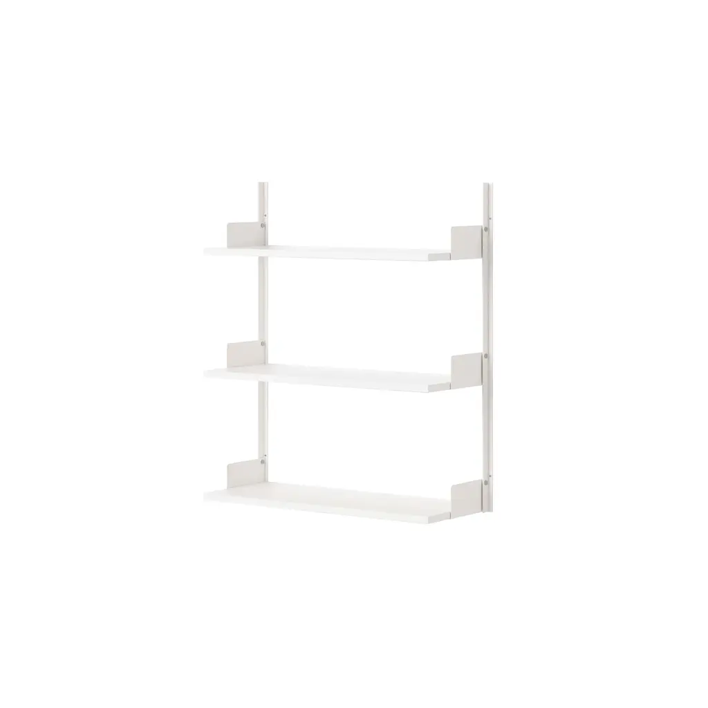 In a simple mid-height configuration that leaves wall space above the bookcase, New Works offers a versatile single unit—or a starting point for further additions—from the quintessential storage system by creative director Knut Bendik Humlevik. Effortlessly blending into a range of spaces, the wall-mounted triple shelf features squared-off steel support bars and integrated bookends that keep items in place, with lacquered or woodgrain veneer shelves attached with flat knurled screws in stainless steel.