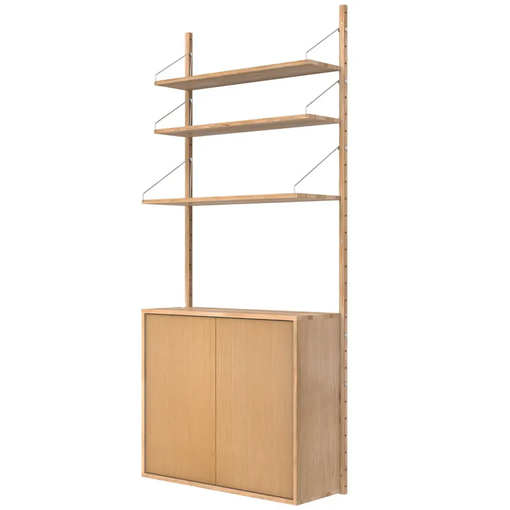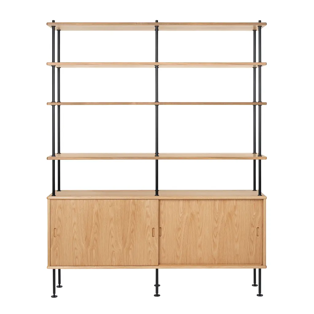 The New Works Wall Shelf Cabinet with Doors offers a sleek and functional storage solution. Available in finishes such as white, oak, black-stained ash, and walnut, this cabinet integrates seamlessly with existing shelving systems or stands alone as a refined feature. It comes in both low and tall versions, each featuring doors that conceal your essentials while maintaining a clean and modern look.