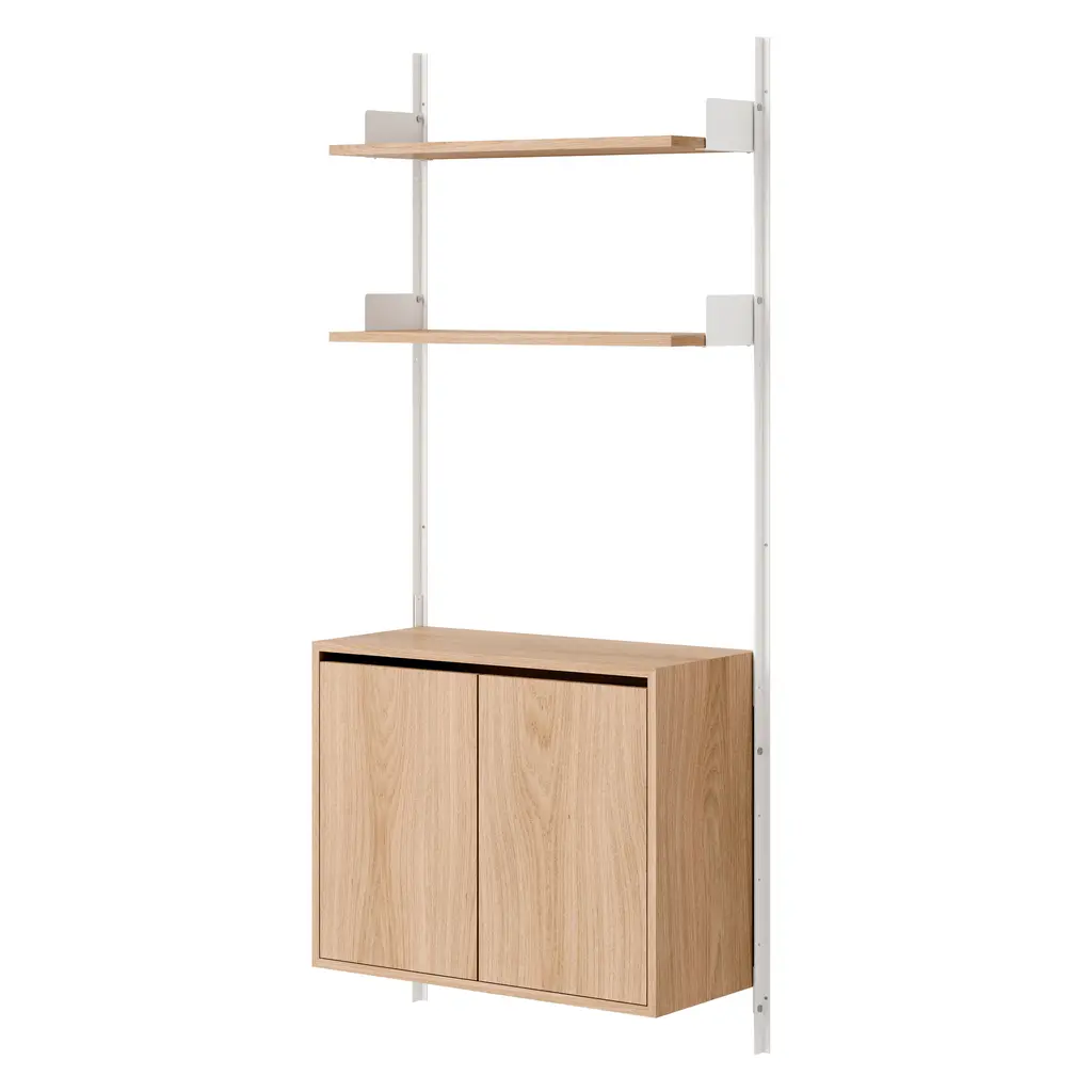 The New Works Wall Shelf Cabinet with Doors offers a sleek and functional storage solution. Available in finishes such as white, oak, black-stained ash, and walnut, this cabinet integrates seamlessly with existing shelving systems or stands alone as a refined feature. It comes in both low and tall versions, each featuring doors that conceal your essentials while maintaining a clean and modern look.