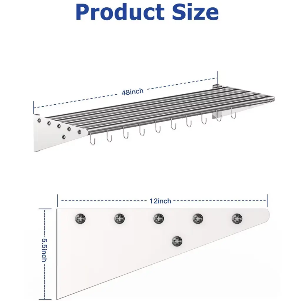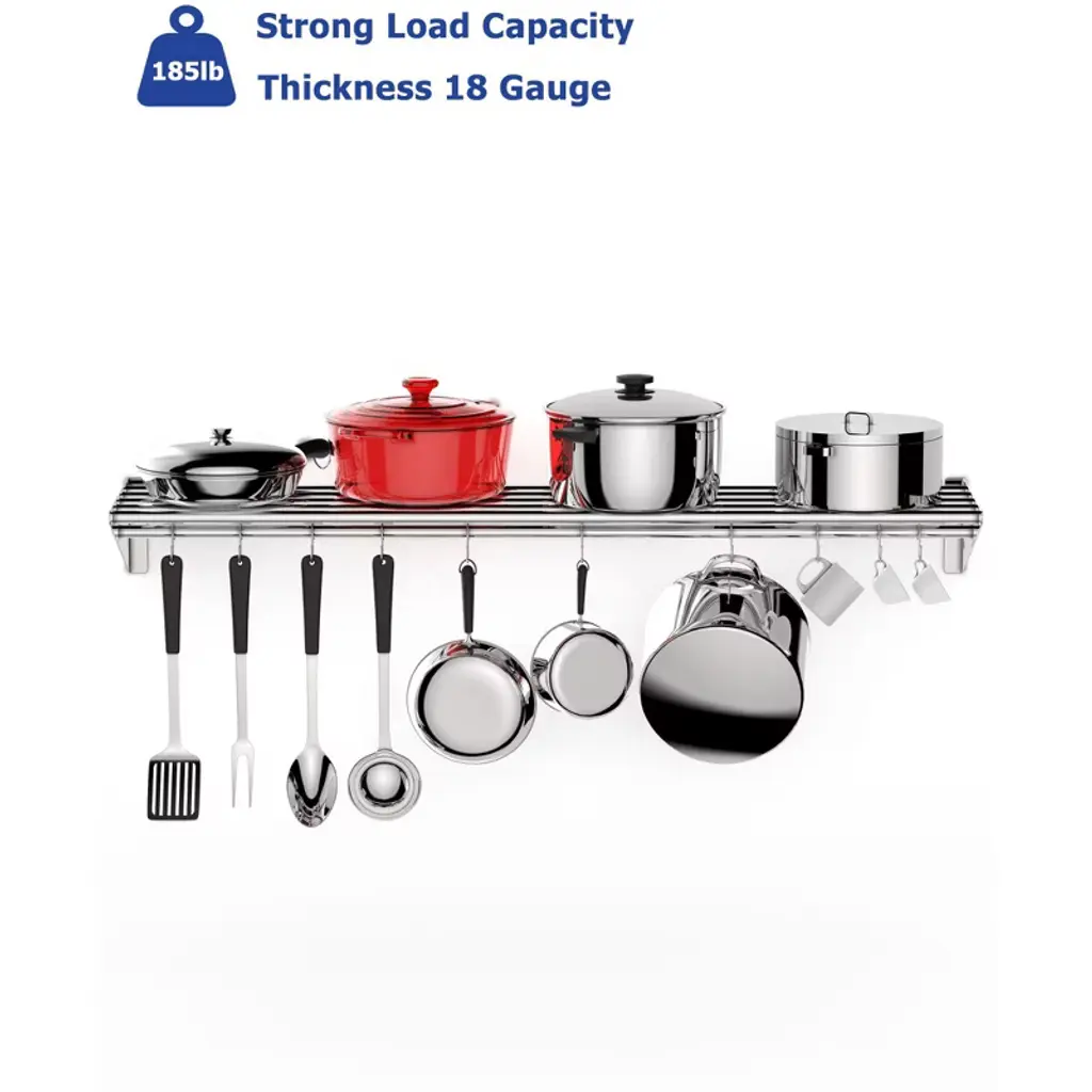 Maximize your kitchen efficiency with this NSF-certified wall shelf that combines professional durability with smart organization. The commercial-grade 304 stainless steel construction boasts an impressive 165lb weight capacity, while the included 10 S-hooks keep pots, pans and utensils perfectly organized.