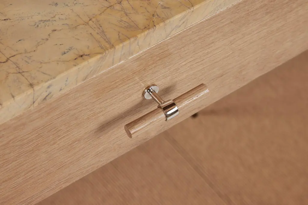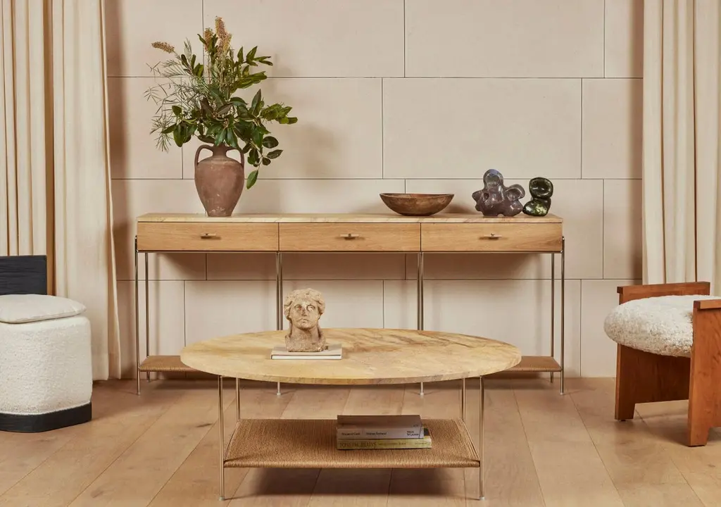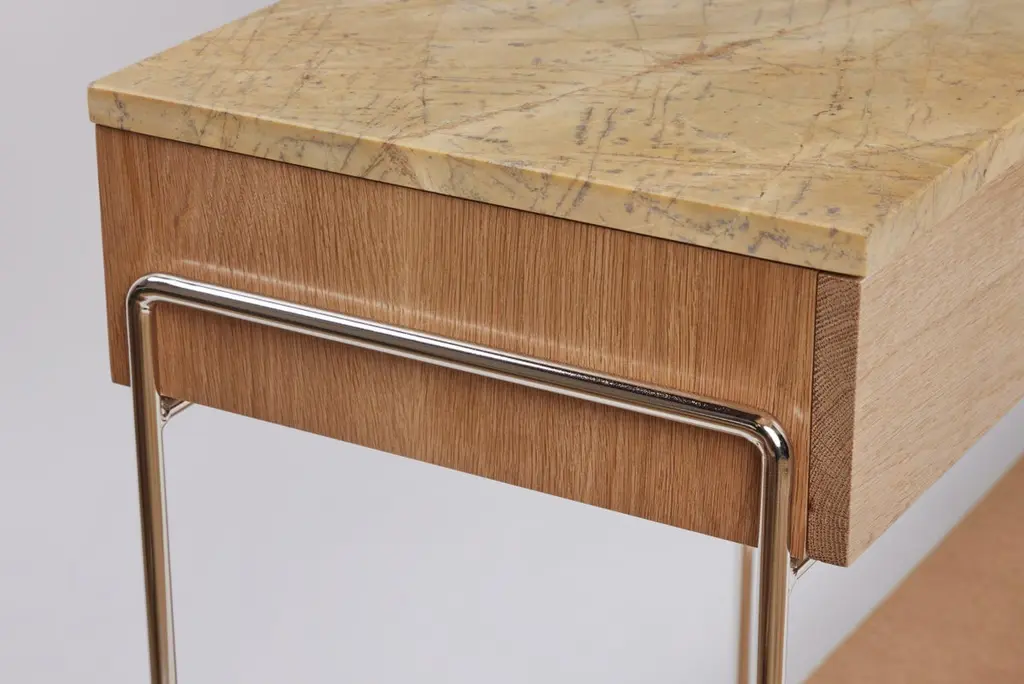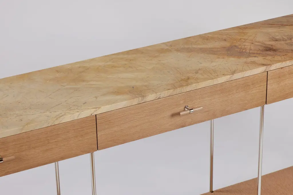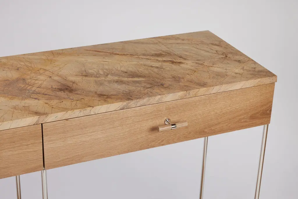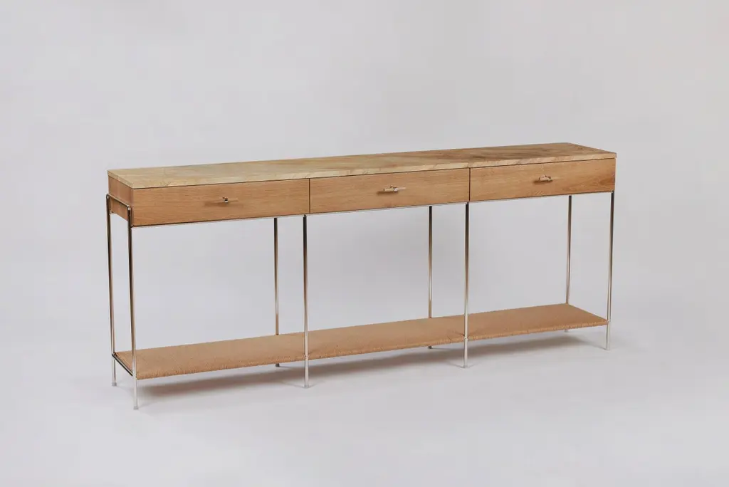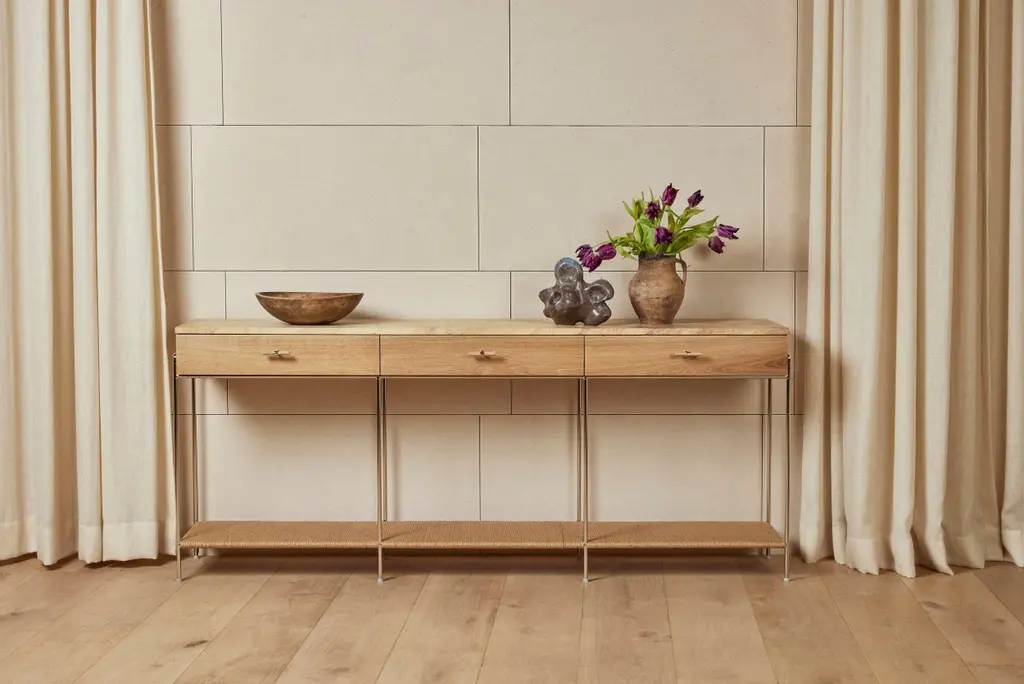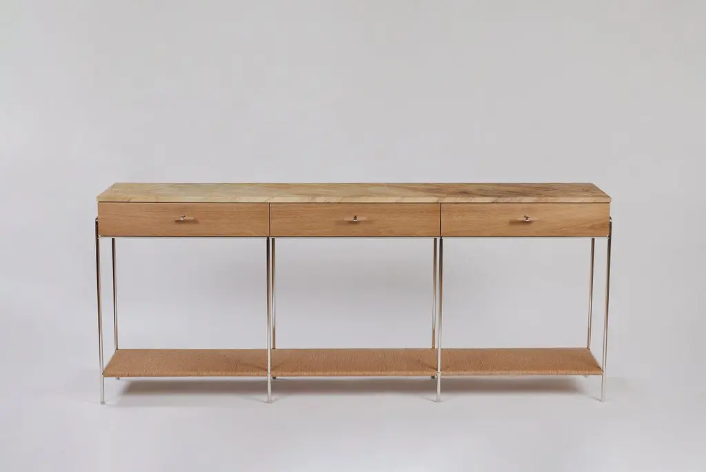 The oak console is made from a single hand selected solid white oak board, ensuring consistent coloring and matching grain patterns throughout. It is fabricated by an artisan who has been building fine furniture for almost a half century. The rush shelf is woven by a master weaver with over 40 years experience. We use 70% recycled steel for the frame. Each marble top is selected for its unique qualities. Designed by a former art dealer who represented contemporary artists for over 30 years including some of the giants of minimalist art. The inspiration the designer took from working with minimalist artists over decades is realized in the principles of simplicity, honesty, utility at the heart of MIlwood Design. Hand made locally in Venice, California.