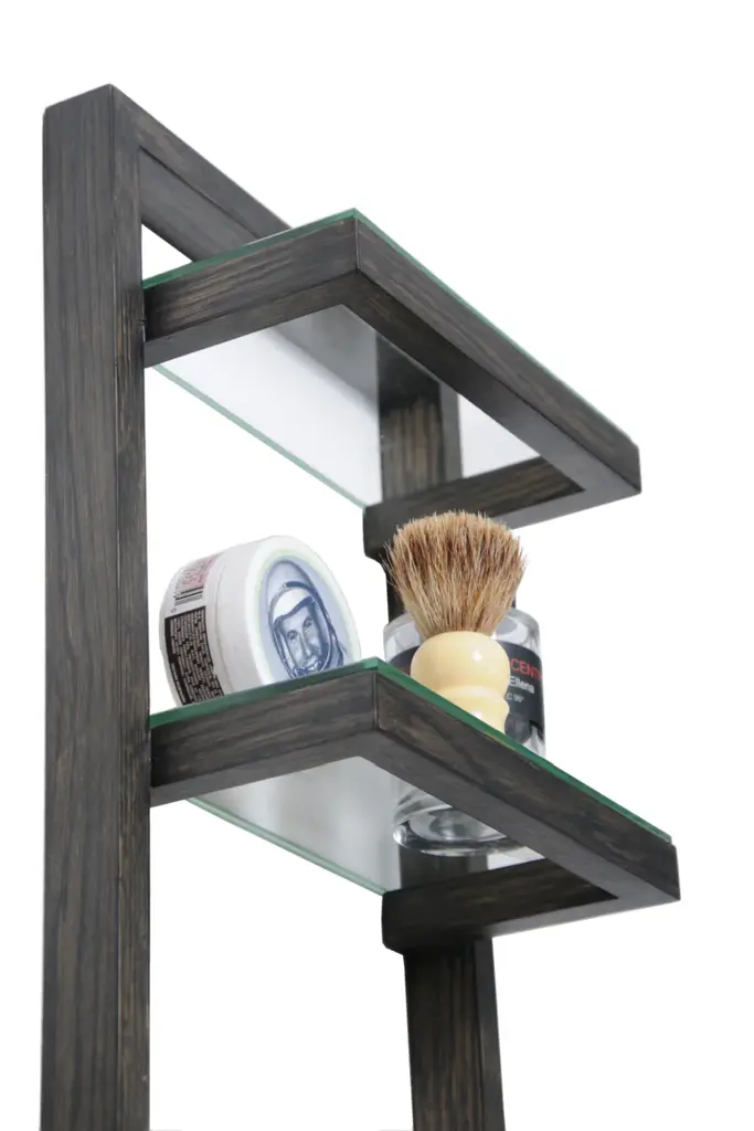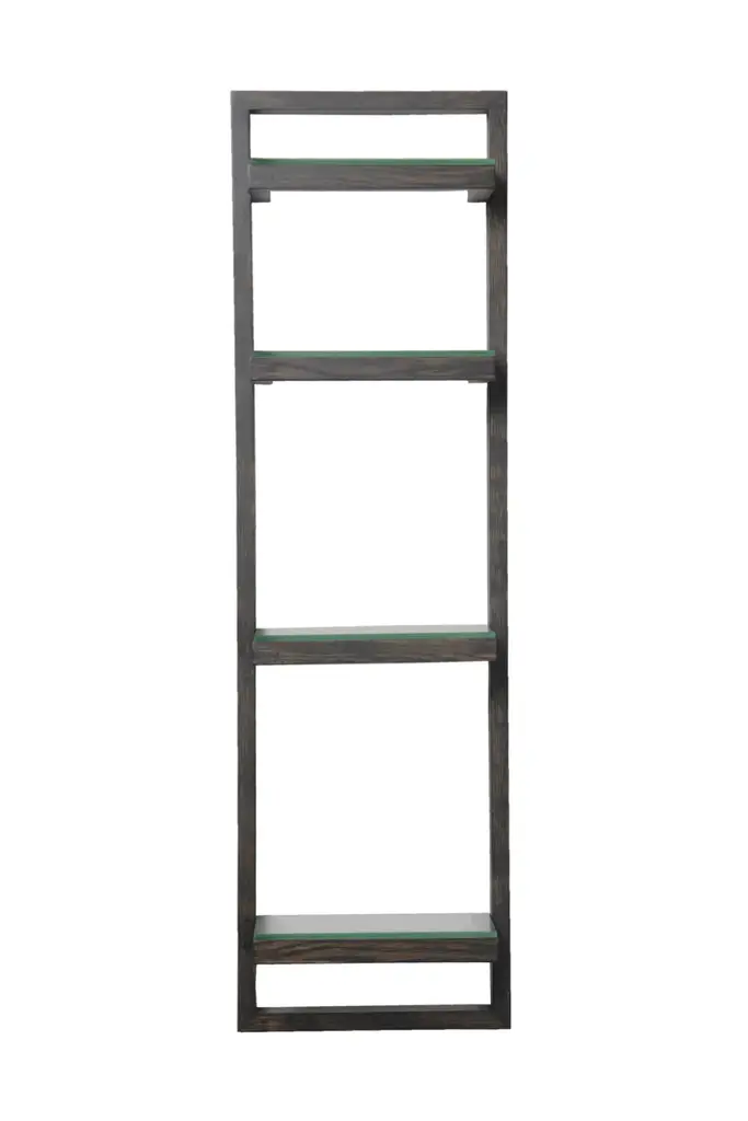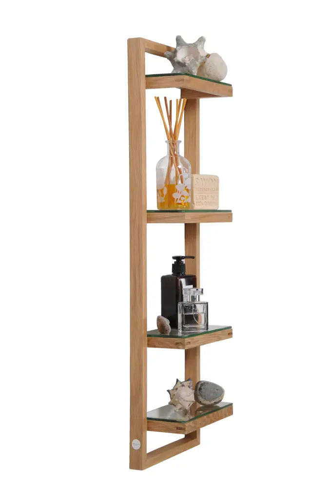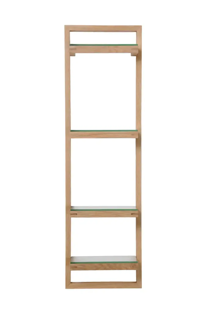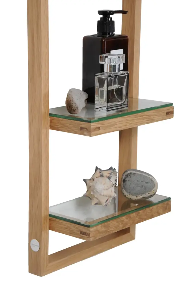 Zone wall shelf has four glass shelves. The glass sits proud on the frame supports making a feature of the polished edges. Shelf spacing is graduated to make it easy for storing both tall and short items. Adhesive silicone pads hold the shelves in place. The solid oak frame is assembled using fillet joints for strength and rigidity. Simple keyhole installation with hidden fixings gives a seamless look. Zone wall shelf is the same height as the Zone 800 mirror cabinet. Positioned together they make a complementary pairing. Made from sustainably harvested natural American white oak, selected for its warm color, beautiful grain pattern and traditional hardwood durability. All edges look crisp but are carefully hand sanded to make them soft to the touch. Finished with a matt, water resistant lacquer. Design by Lincoln Rivers.