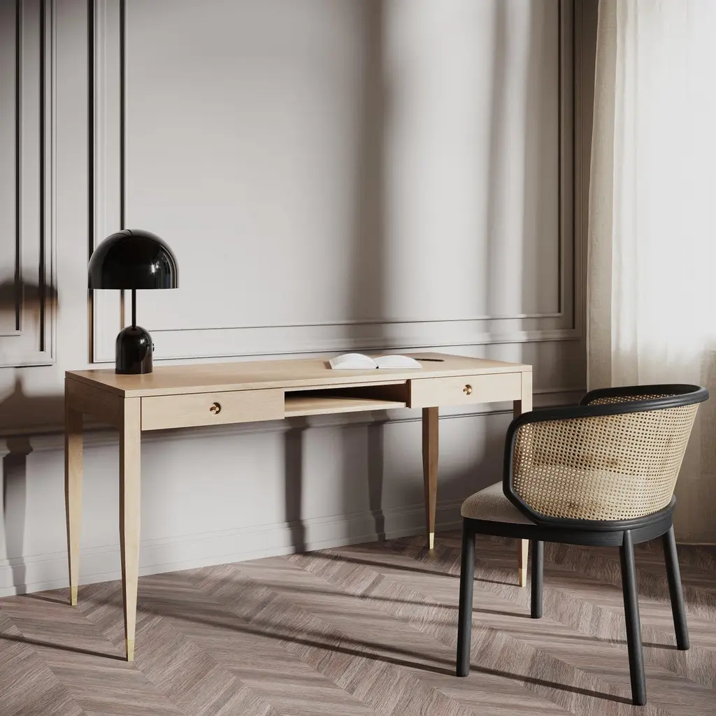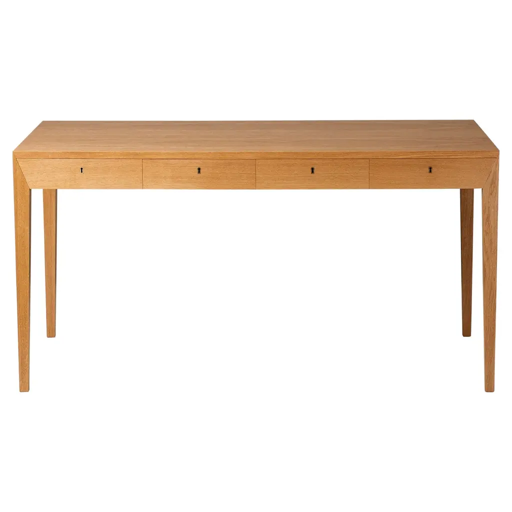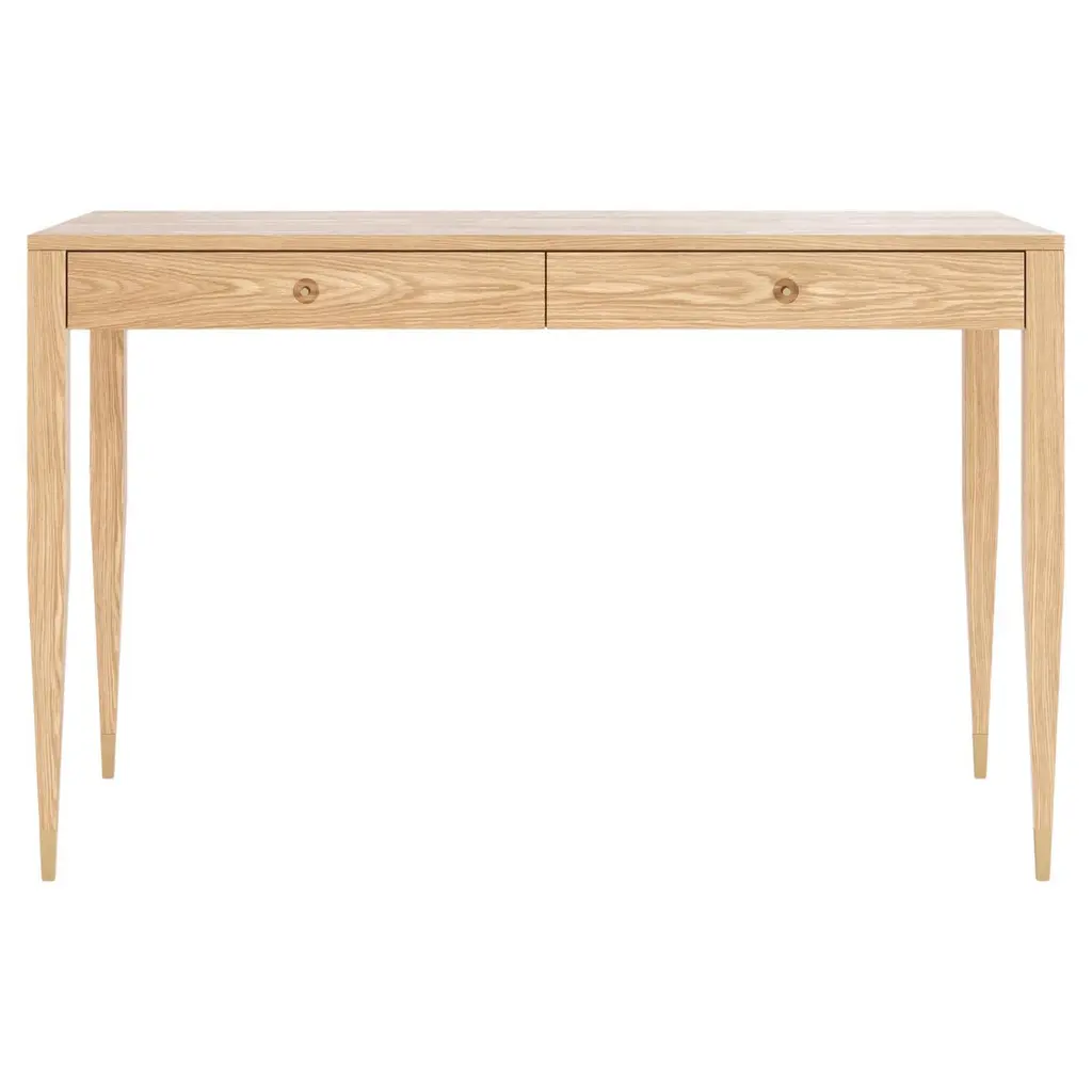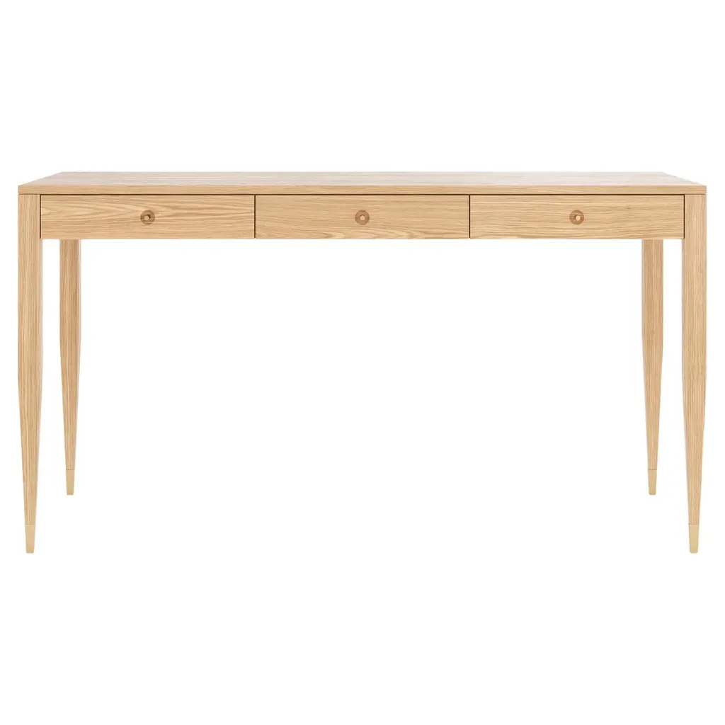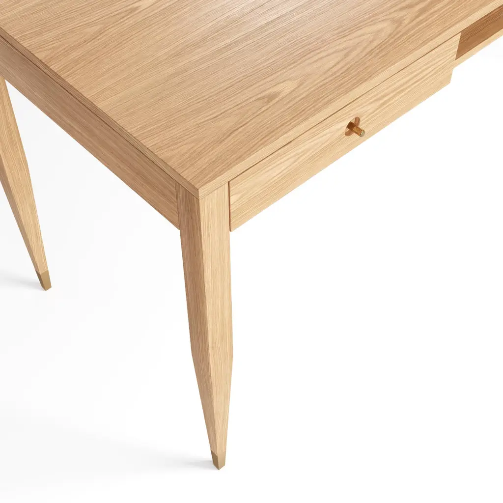 Desk in mid-century style with two drawers, shelf and brass handles. The tapered legs are finished with brass plated aluminum feet. Desk made of solid oak wood and wood covered with natural oak veneer. Other wood on request. Perfect as office desk, study desk, writing desk.Handmade in Poland.Materials:-drawer fronts, sides, dividers, back: solid oak-drawer body: solid oak-legs: solid oak-top: blockboard overlaid with oak veneer-handles: solid brass-feet: brass plated aluminum-matte varnishDimensions:width: 140 cm (55,1")depth: 60 cm (23,6")height: 75 cm (29,5")Also available in 160cm x 70cm version.You can change the size, material, surface treatment after prior contact and setting prices.