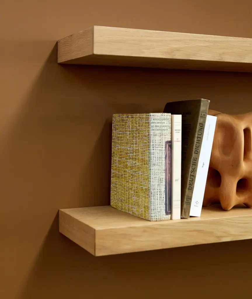 This elegant wall shelf, crafted from European Oak, is the perfect solution for extra shelving needs. Featuring simple, clean lines, they can be aligned or stacked on the wall in your preferred combinations. Comes with a flush-mounted stainless steel keyhole bracket for easy installation.