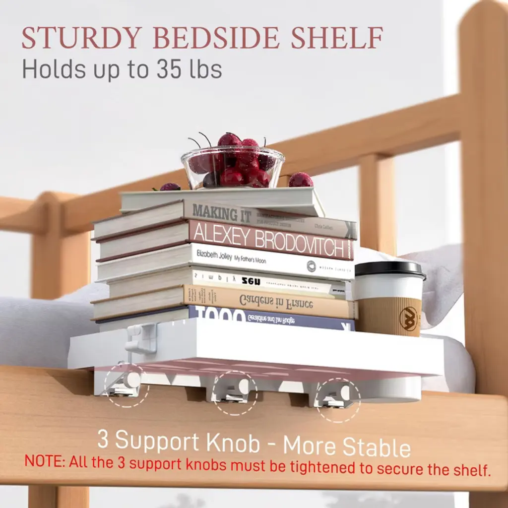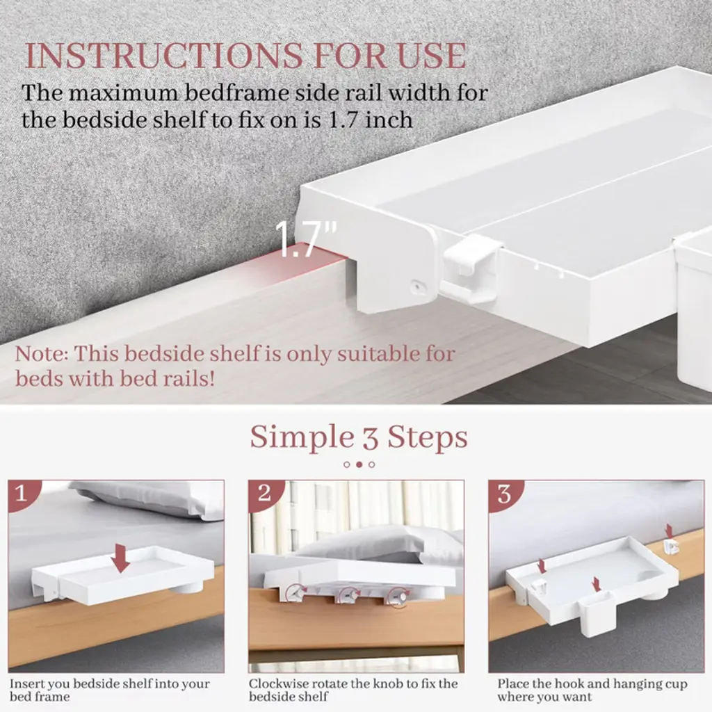 Multi-purpose Use: This bedside shelf is suitable for the bed rail width of 0.6"-1.7" and depth of 1.6" or more. It is not only suitable for beds with bed rails, but also can be attached to other furniture pieces such as baby bed, loft bed, and even bunk beds, etc. Please confirm if your bed is compatible with this bedside shelf before purchasing, and measure the width and depth of bed frame to ensure that it is suitable for. Material: Plastic (Polypropylene)