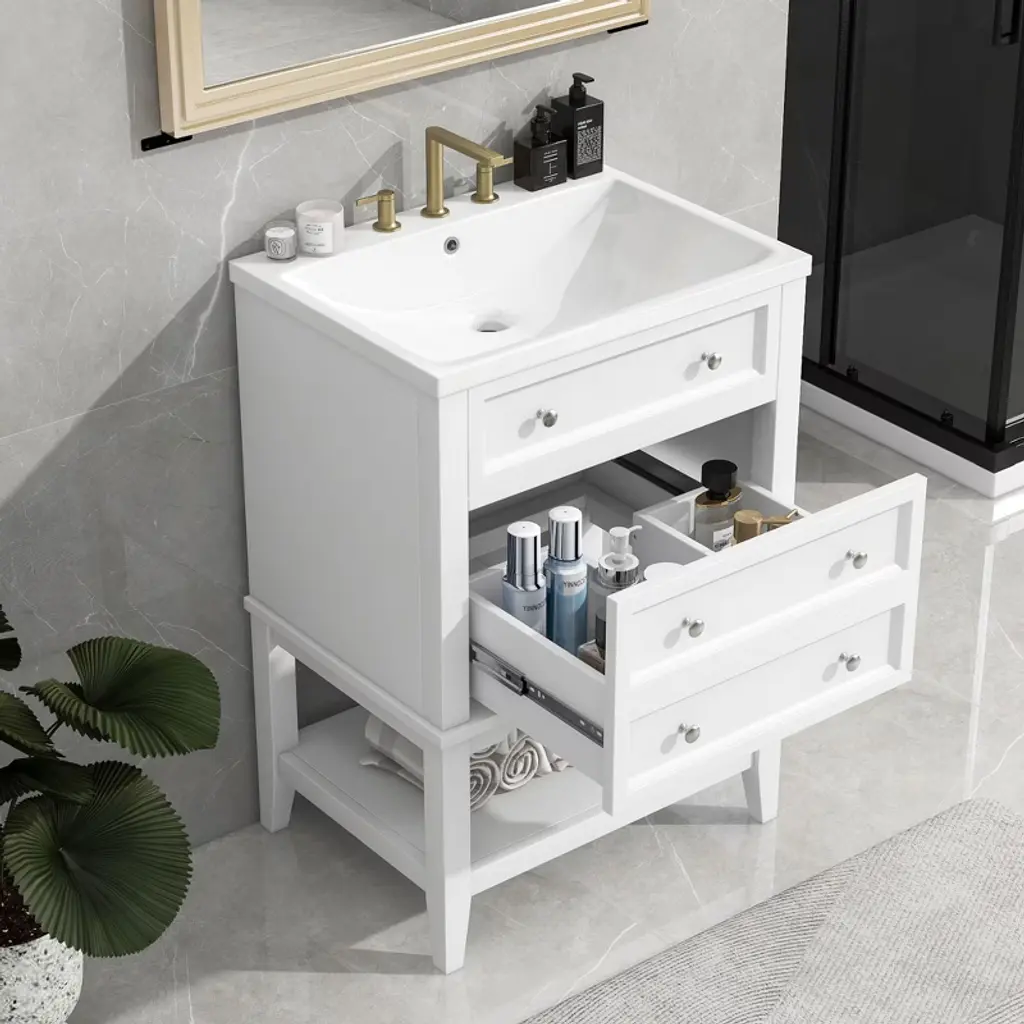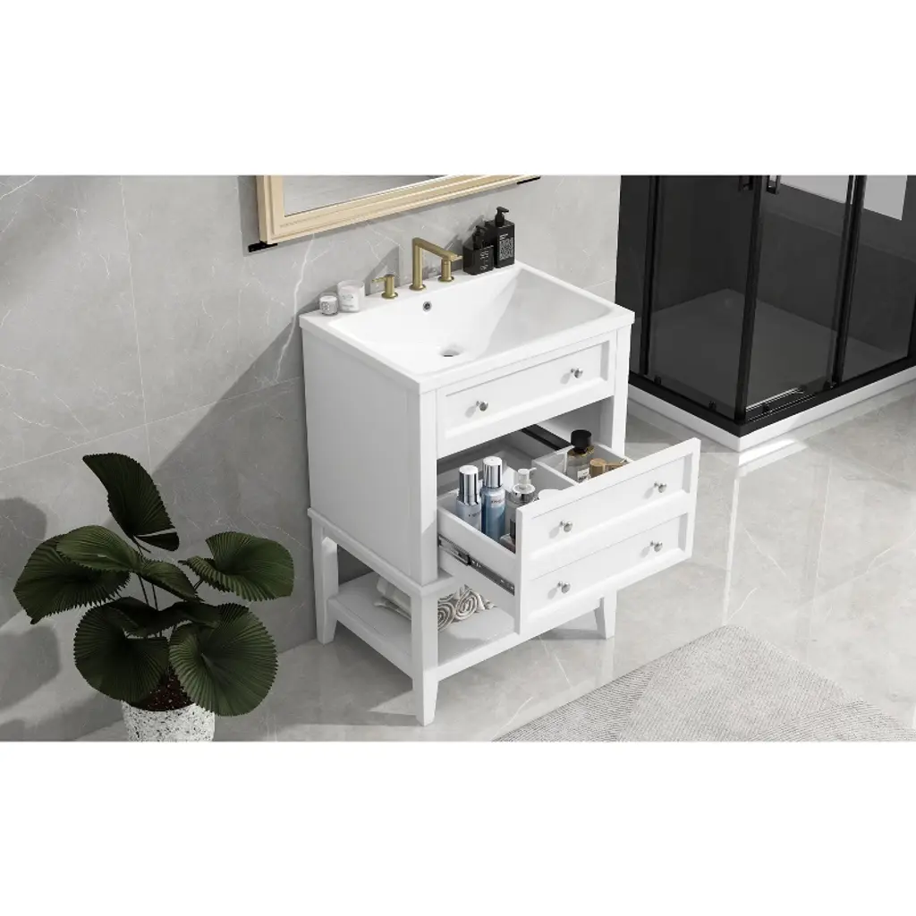 Okak 24" Bathroom Vanity With Ceramic Sink Combo,freestanding Single Vanity With Drawer & Open Shelf,solid Wood Frame Bathroom Storage Cabinet, White