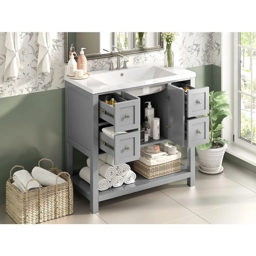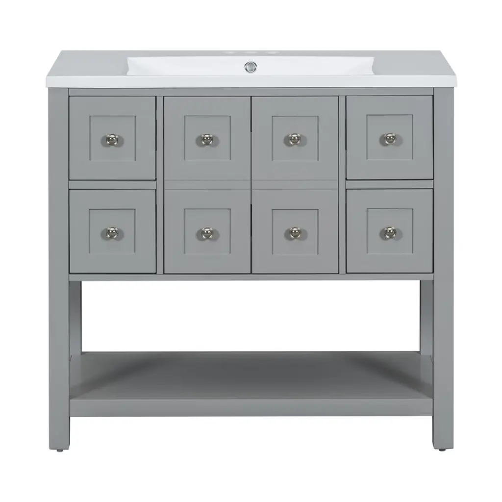 Okak Modern 36" Bathroom Vanity With Sink Multi-function Solid Wood Bathroom Cabinet With Soft Closing Doors & 4 Drawers Open Shelf, Gray