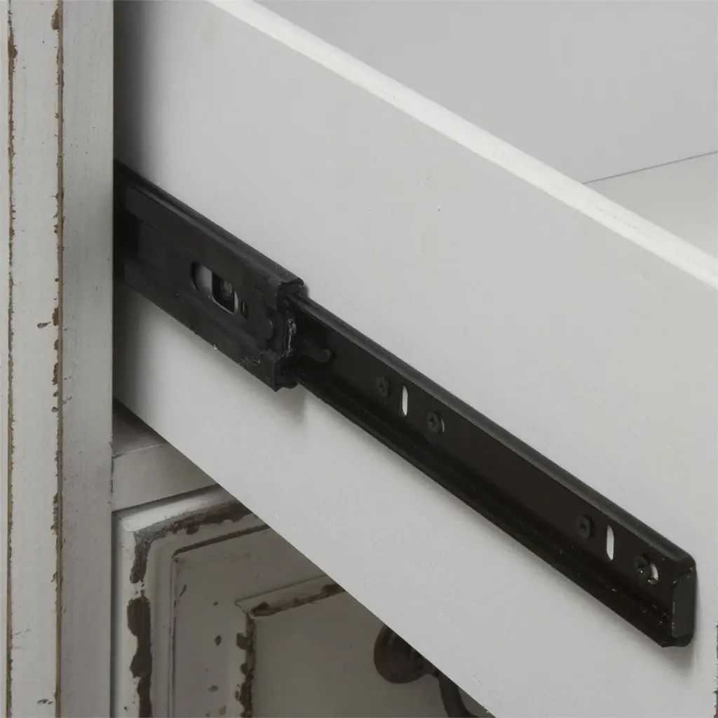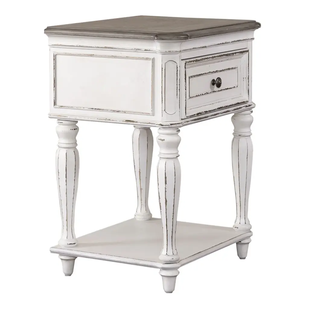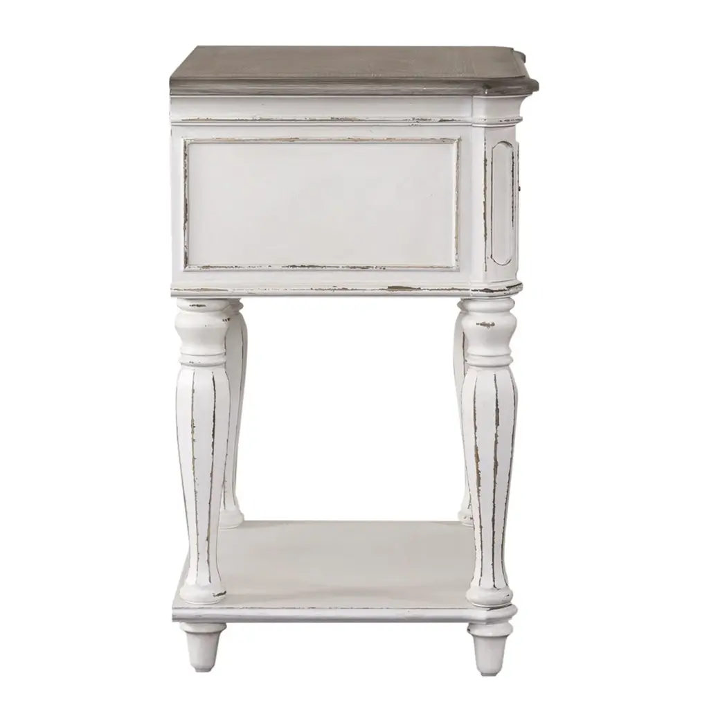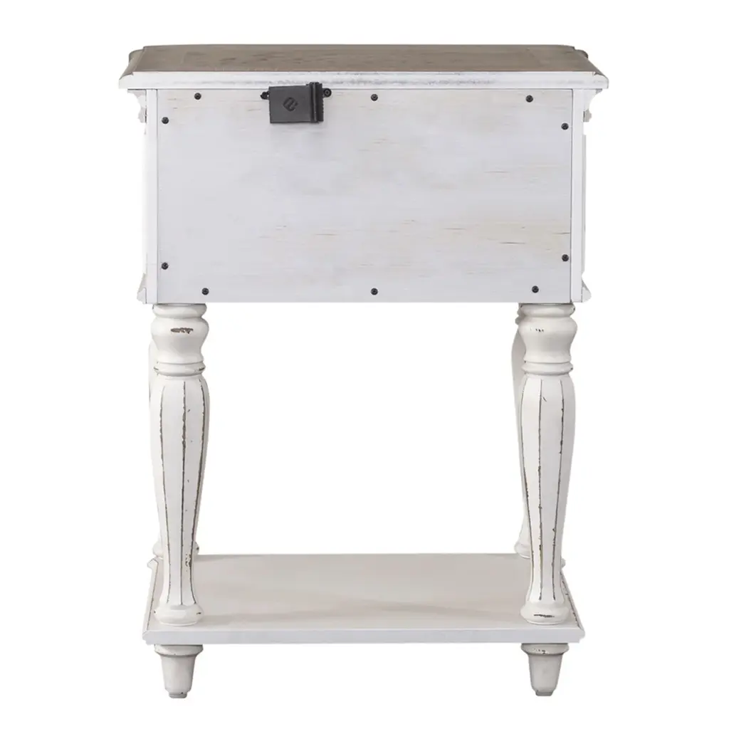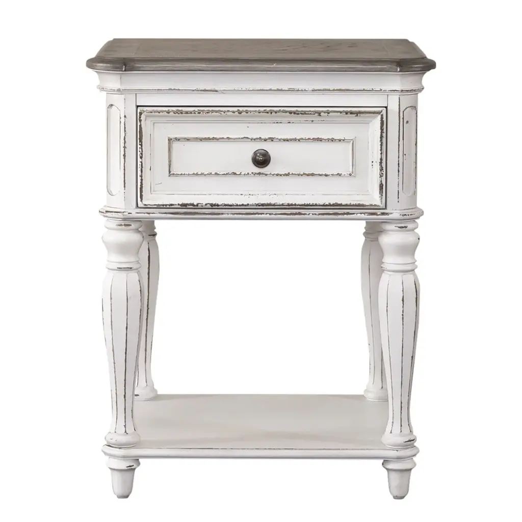 Highlighted by vintage and rustic style accents, this beautiful nightstand adds accommodating design to your bedside. Featuring one fully finished dovetail drawer with metal full extension glides, this piece also includes a bottom shelf for more easy access storage. Completed with antique brass knob and bail hardware with an antique white finish, this piece presents formal elegance for your home.