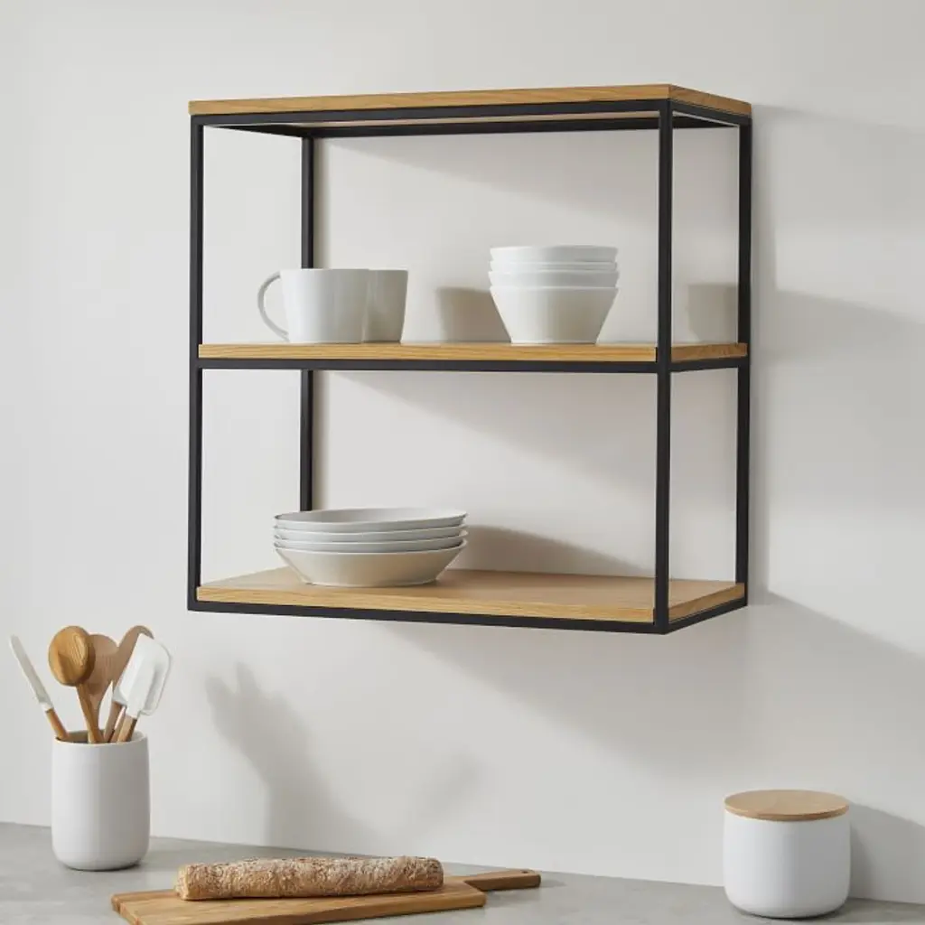 COPY Open Box items may show light scratches on legs, fabric pulls and slight fabric wear, and furniture pieces may require tightening or leveling. Items do not come in their original packaging. Sold at a deep discount. All sales are final. 23.6"w x 11.8"d x 23.8"h. 105 lbs. per shelf. Mild steel frame in a Dark Bronze finish. Engineered wood shelves in an Oak/Mahogany veneer. Hanging hardware included. Sold individually. Made in Indonesia.