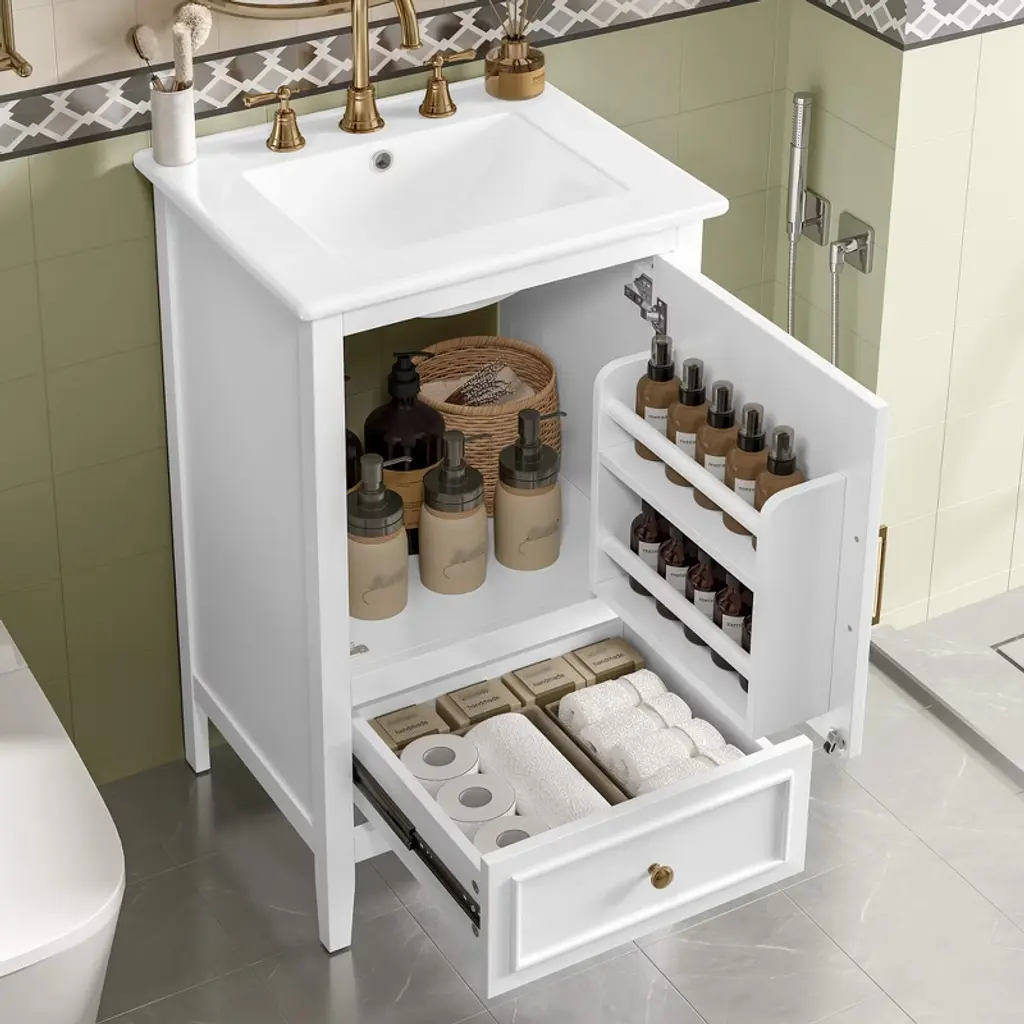 The ORRD 20" Bathroom Vanity with Sink offers a compact and functional solution for small bathrooms and powder rooms. Featuring a sleek white finish, this vanity includes a cabinet with a door and internal shelf for organized storage, plus a smooth-gliding drawer for toiletries and essentials. The integrated ceramic sink adds a clean, modern look, while the adjustable foot pads ensure stability on uneven floors. Its space-saving design makes it ideal for maximizing storage without compromising style.