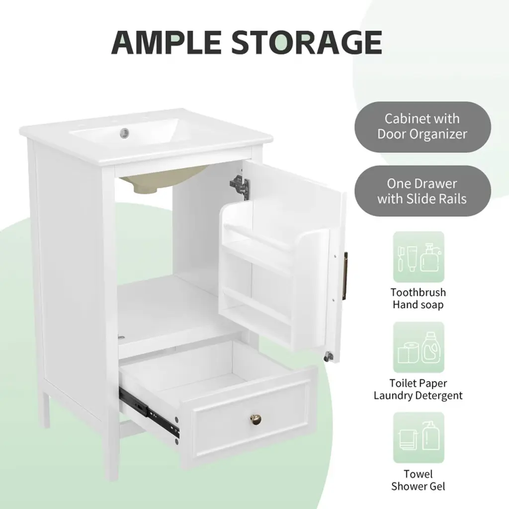 Orrd 20" White Bathroom Vanity With Sink, Cabinet With Door & Shelf, Drawer, Adjustable Feet For Small Bathroom Storage