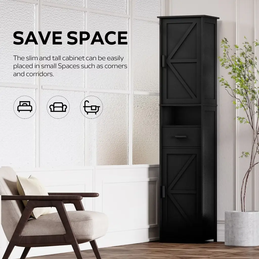 Orrd 69" Tall Bathroom Storage Cabinet With 2 Barn Doors & Drawer, Narrow Adjustable Shelf Floor Cabinet For Small Spaces, Kitchen, Entryway(black)