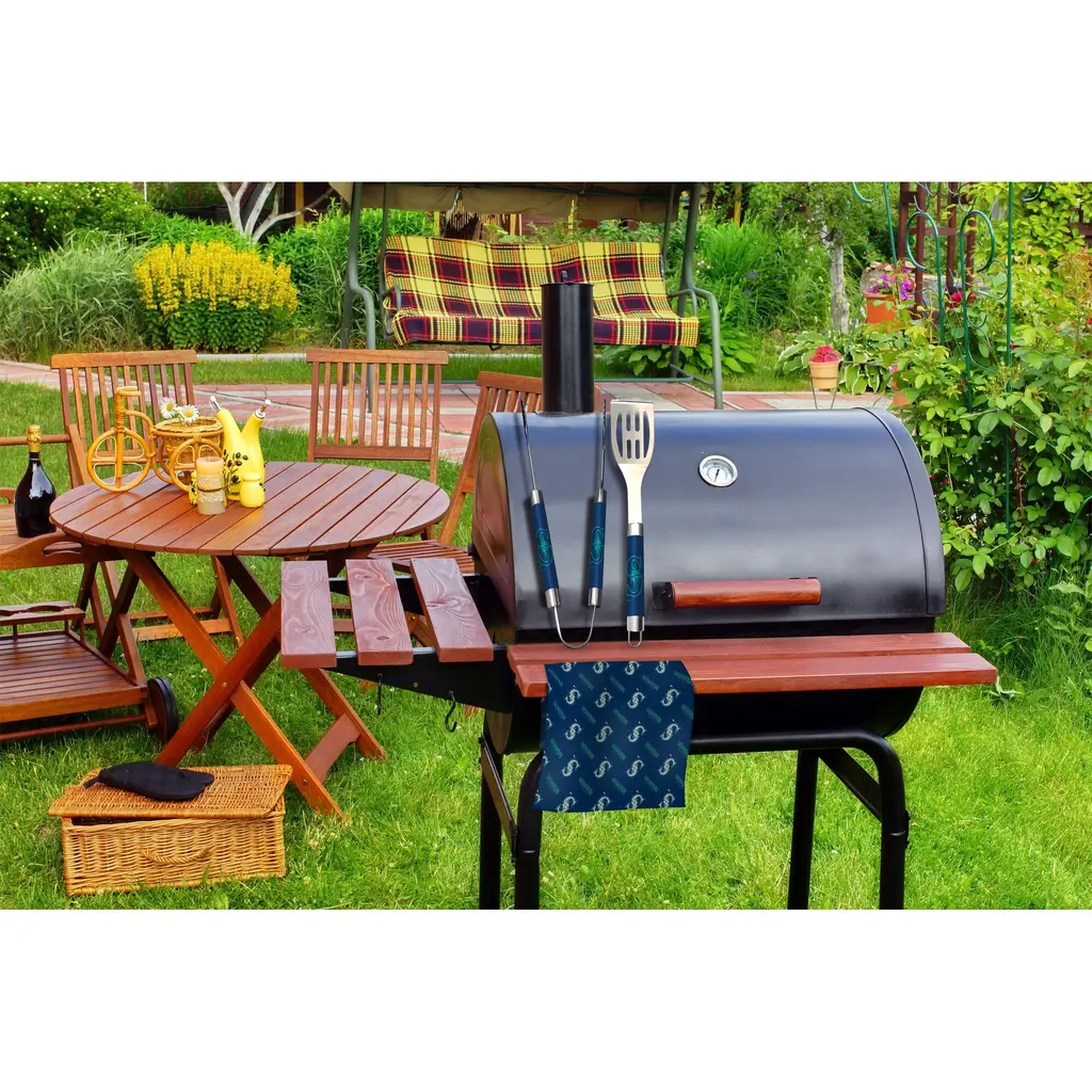 SpecificationsDescription:This outdoor BBQ grill features durable black coated steel construction, offering long-lasting reliability and rust resistance for outdoor cooking. The grill includes a built-in thermometer on the top lid for easy temperature monitoring, while the wooden handles ensure safe handling and prevent burns. A convenient front wood shelf provides space for storing grilling tools, spices, or accessories, making everything within easy reach. With two rolling wheels, the grill can be easily moved, and a bottom shelf offers extra storage for added convenience. The attached steel firebox reduces smoke and ensures smooth airflow through the side vent, allowing for efficient use of coals. Easy to assemble with included hardware and a detailed manual, this grill is perfectly sized for all your outdoor grilling needs.Key Features: