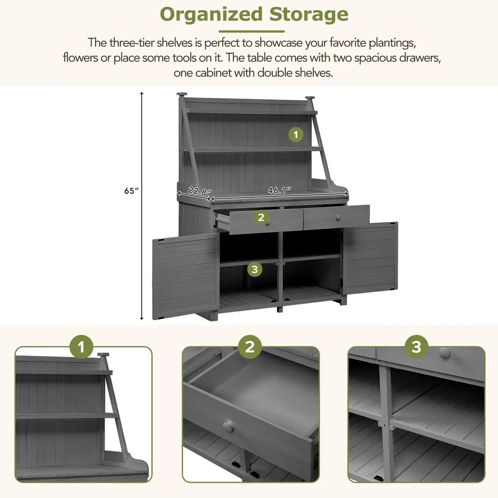 Description:Elevate your gardening experience with the 65-inch Garden Potting Bench Table, a perfect combination of durability, organization, and style. Crafted from 100% fir wood and featuring a sturdy construction with two triangle bars, this workstation is built to last, even under the weight of heavy pots and garden tools. The inclusion of two anti-falling devices enhances safety, ensuring that the bench remains stable during use. The cabinet door, equipped with a magnetic latch, provides a soft and silent closure, effectively keeping out dust and insects, and extending the lifespan of the door. The shelves offer an organized way to display your favorite plantings, and flowers, or store essential tools. With two spacious drawers and a cabinet with double shelves, you have ample storage space to separate and organize different types of items, keeping everything within easy reach. Features:【Durable Construction & Quality】- Constructed from 100% fir wood and reinforced with two triangle bars, this potting bench table ensures maximum stability, even when loaded with heavy pots and garden equipment. Two anti-falling devices enhance safety, and the magnetic cabinet door offers a soft, silent closure, preventing dust and insects from entering. 【Organized Storage Solutions】- Featuring three-tier shelves, this workstation is ideal for displaying your favorite plantings, flowers, or storing tools. It includes two spacious drawers and a cabinet with double shelves, providing ample storage space to keep all your gardening essentials well-organized and easily accessible. 【Perfect Gardening Workstation】- The rustic design and neutral color of this potting table blend seamlessly with any outdoor setting, adding warmth and functionality to your garden. The 34-inch height is ergonomically designed for comfortable working, reducing strain on your back and shoulders while you tend to your plants. 【Easy to Clean & Maintain】- With its straightforward design, this potting bench table is easy to assemble and maintain. Regular cleaning with a damp cloth keeps it looking sleek and new, making it a practical choice for gardeners who value convenience. 【Dimensions and Specifications】- Overall size: 47.2x22.8x65 inches (LxWxH); Tabletop size: 46.1x22.5 inches (LxW); Each drawer inner size: 17.9x19.6x3.3 inches (LxWxH). For more detailed dimensions, please refer to the size image. Feel free to contact us for any assistance.Weight & Dimensions & Specifications:Overall: 47.2x22.8x65 inch (LXWXH)Tabletop: 46.1x22.5 inch (LXW)Each drawer inner size: 17.9x19.6x3.3 inch (LXWXH)Overall Weight: 75.79lbs.Upper Shelf (above tabletop): 22 lbsMiddle Shelf (above tabletop): 44 lbsTabletop: 88 lbsEach Drawer: 44 lbsUpper Shelf (cabinet): 66 lbsBottom Shelf (cabinet): 88 lbsMaintenance & Notice: