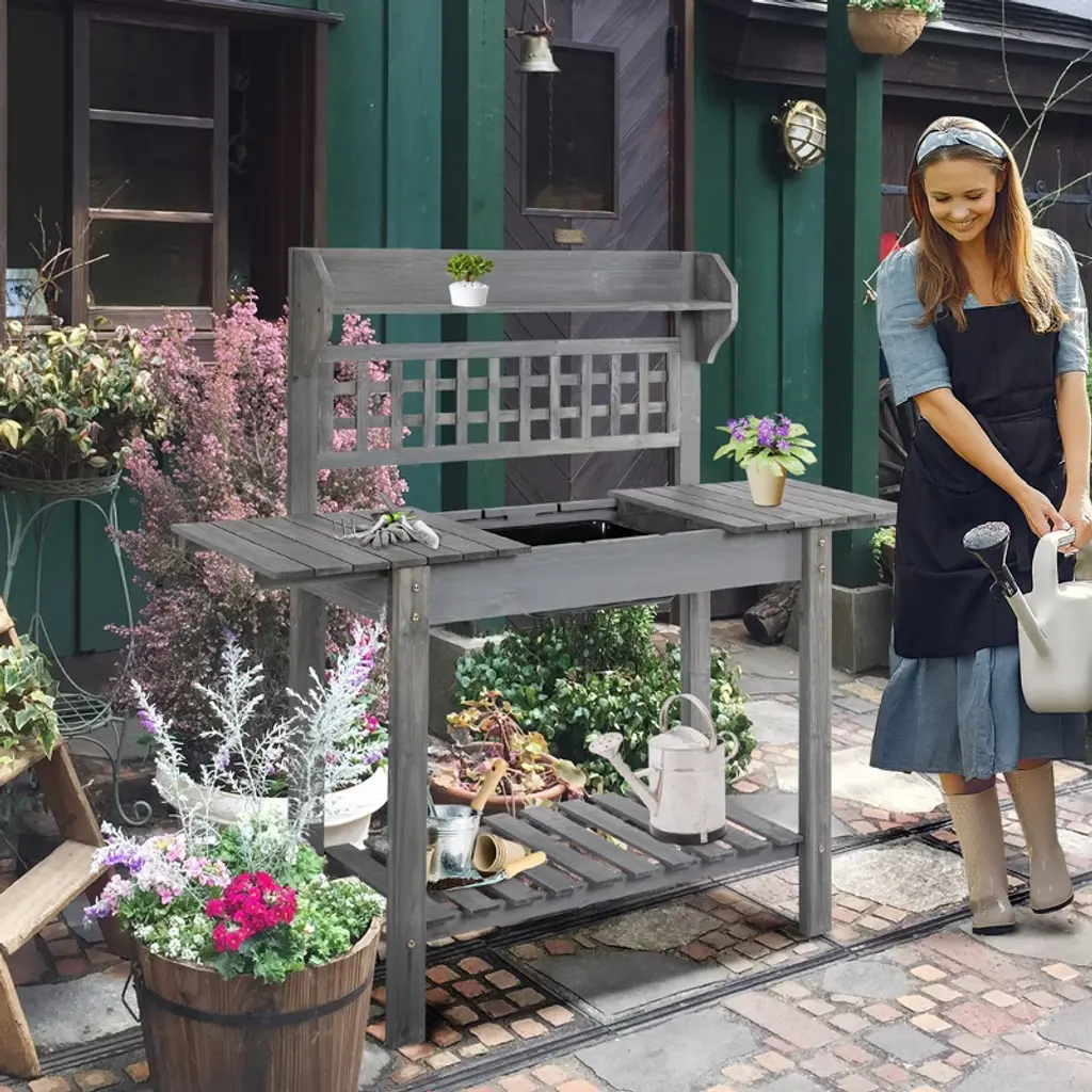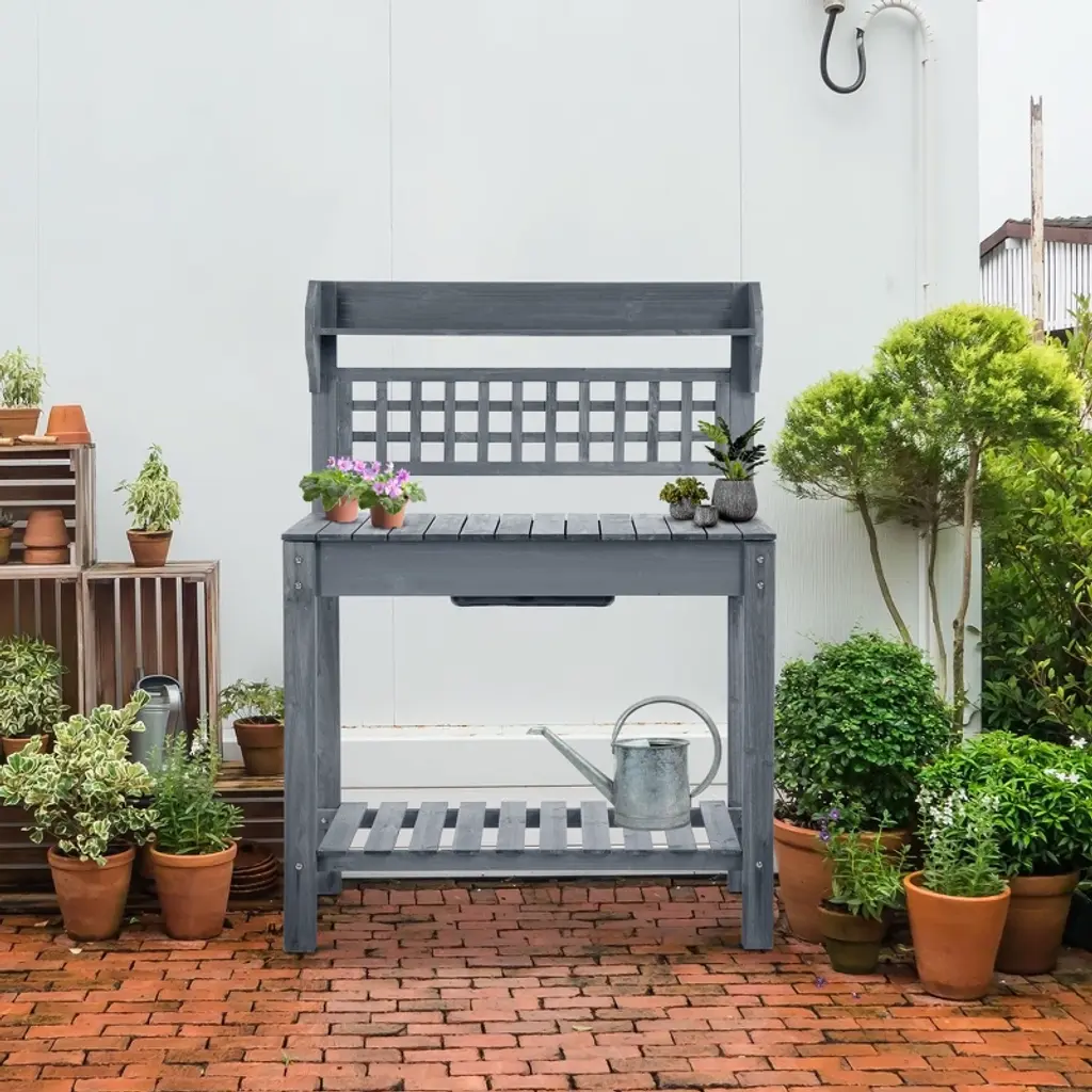 Outsunny 39'' Wooden Garden Potting Bench Work Table With Hidden Storage, Sliding Tabletop, Below Clapboard, Upper Shelf, Gray