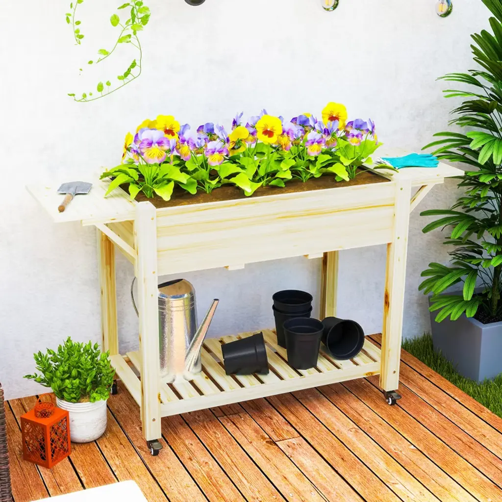 Outsunny Raised Garden Bed, Wood Elevated Planter Box With Lockable Wheels, Side Tables, Bottom Shelf, Bed Liner And Drainage Holes, Natural
