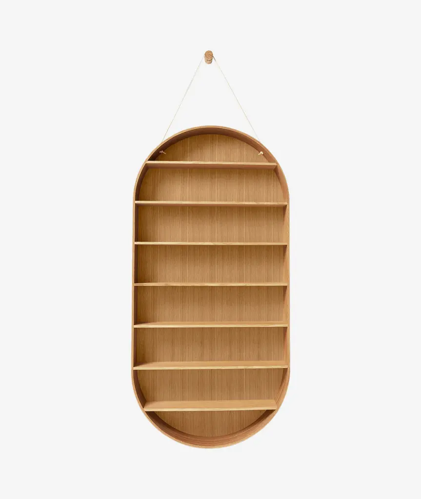 Crafted from solid oak and oak veneer, the Oval Dorm Shelf combines an oval shape with minimalist, clean lines to create an effortlessly modern look. This versatile shelf provides ample space for storing and displaying cherished items, from decorative objects such as plants and books to personalized mementoes and vintage treasures. The shelf also features a decorative leather string with an oak hook, lending a touch of crafted sophistication.