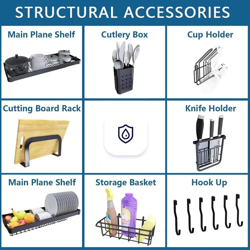 FULL 304 STAINLESS STEEL OVER SINK DISH RACK: this high grade stainless steel has excellent resistance to a wide range of atmospheric environments. That durability make it easy to protect, and therefore ideal for kitchen and food applications. The product passed a 24-hour salt test. You don't have to worry about your safety and health issues at all. Heavy-duty stainless steel shelf can hold up to 200 lbs. This is a real all-stainless steel over sink dish drying rack. 2 LAYERS LARGE CAPACITY EXPANDABLE DESIGN: the size of this over sink dish drying rack is 20.87'' to 37.6'' * 10.95" * 33.35". Longest dimension is 37.6 inches, the highest height of the faucet ≤ 16.93 inches. Scalable design, and added double dish drying rack. The top floor can also be used as a shelf for any kitchen items. Don't worry about buying the wrong size. A great gift choice for friends or family, such as Housewarming, Thanksgiving, Christmas and Holiday Gifts. ORGANIZE YOUR KITCHEN & EFFICIENT DRAINAGE: can meet the needs of any kitchenware. While the over the sink design enables it to drain water directly into the sink, effectively avoiding water pooling. Besides, the non-slip mat on the bottom effectively ensure the stability of the dish rack. All the accessories you need are complete, including knife holder, storage basket, cutlery holder, cutting board rack, cup hanging, hook up. (All accessories are made of stainless steel) SIMPLE ASSEMBLY & EASY CLEANING: the over sink dish drying rack is equipped with a hex key and a wrench, no extra tools needed, easy to install. Follow the instructions, assemble the corresponding module. All attachments can be easily detached to clean, wiping them with only a damp towel. Add to your cart now, then you will have a perfect over sink dish drainer for your kitchen. FIND THE RIGHT DISH RACK FOR YOU: please carefully measure 3 numerical values: The width of your kitchen sink, the height of the faucet and the height between the cabinet bottom to the countertop before buying.