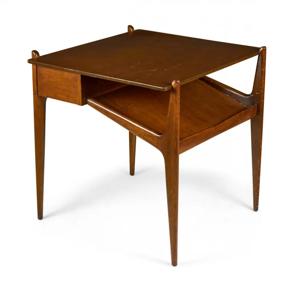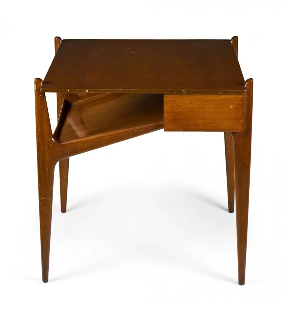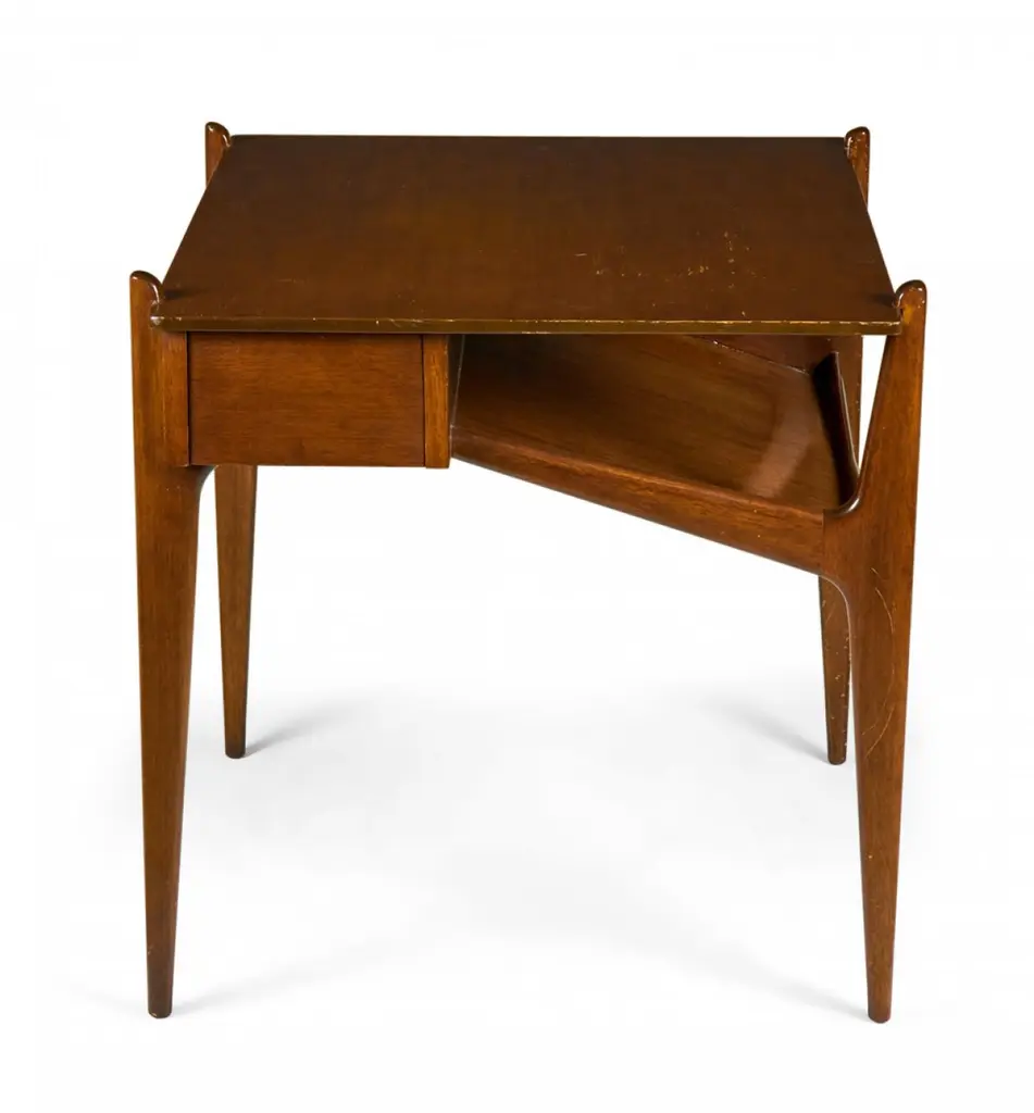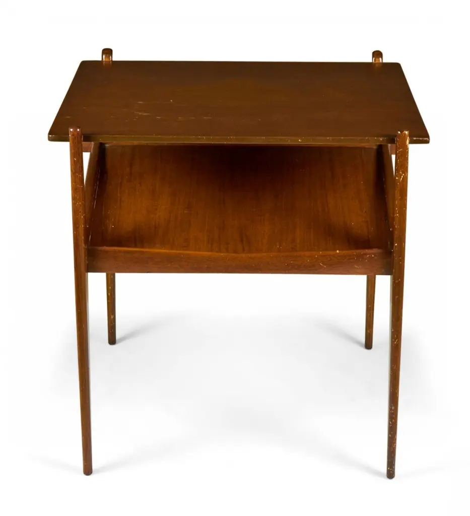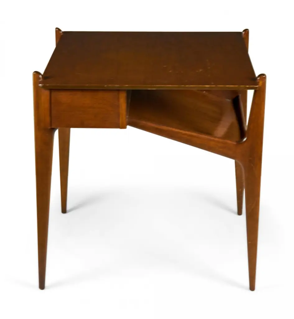 PAIR of American Mid-Century walnut end / side tables with a square top and magazine shelf attached to the top at an acute angle framed by four tapered walnut legs. (SINGER & SONS)(PRICED AS PAIR)