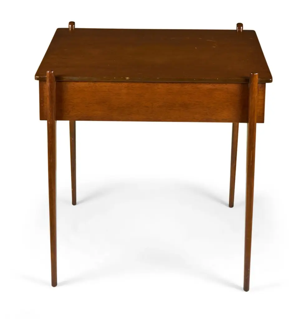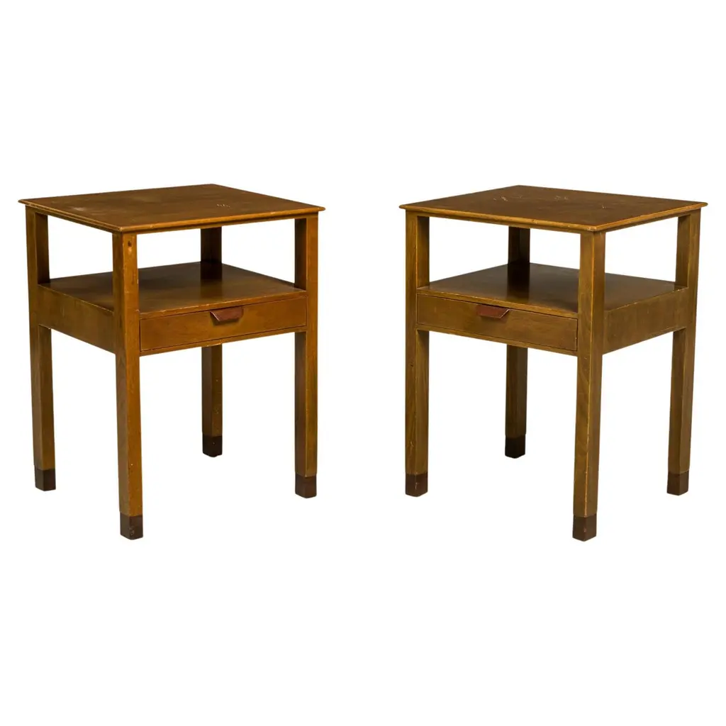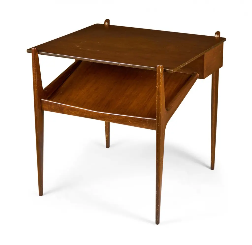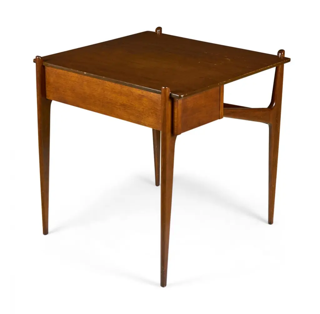 PAIR of American Mid-Century walnut end / side tables with a square top and magazine shelf attached to the top at an acute angle framed by four tapered walnut legs. (SINGER & SONS)(PRICED AS PAIR)