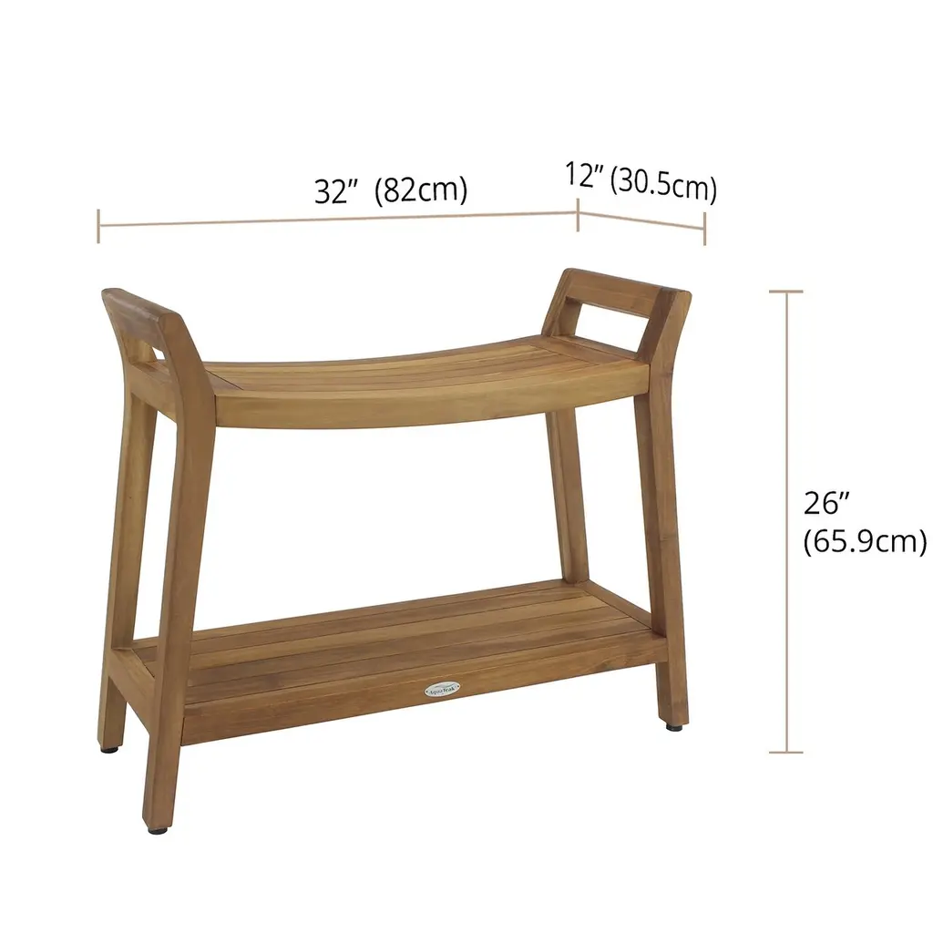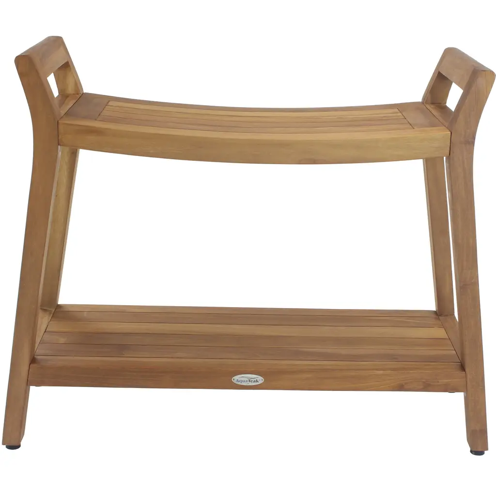 Accented with an additional shelf with storage, our Asia® Ascend teak shower bench, provides plenty of bath or spa storage and convenient seating. Great for both indoor and outdoor use, this model works beautifully as either a bath stool or additional patio seating for unexpected guests. Flared handles make it conveniently portable while providing personal stability when sitting or standing. with a stunning natural finish, the Ascend teak shower bench blends beautifully with any decor as its simple elegance is understated yet attractive. Asia® Ascend Teak Bench Features: • Flared handles • Rubber-padded feet for stability in wet environments • Beautiful natural finish The quality of the Asia® Ascend line of teak shower stools and benches is backed by our industry-leading 30-day customer satisfaction as well as our five-year limited warranty. Shop with confidence now and enjoy FREE SHIPPING on all orders delivered within the continental United States. (Some Assembly Required)