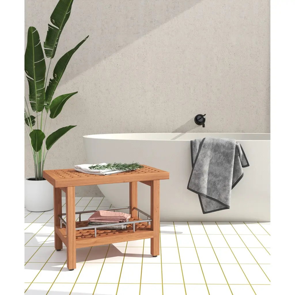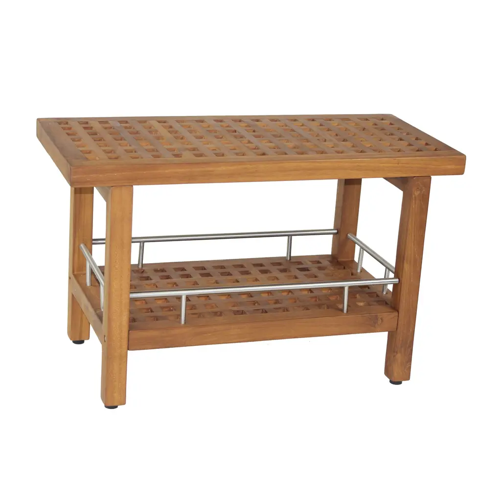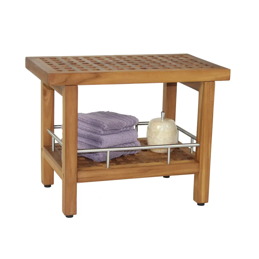 Teak Versatility and Elegance For Any Space This solid teak shower bench has amazing versatility and is elegant enough to be used indoors as a coffee table or teak shower seat. It is naturally water-resistant and built to last, whether you're using it indoors or outdoors. Indoor/outdoor use Functional versatility Water-resistant Our teak bath stool is made from durable, sustainably-harvested teak wood. Including a convenient extra shelf with stainless steel accents, this teak bath bench provides plenty of storage room, while the adjustable rubber-padded feet ensure safety and stability in any wet environment or location. 100% sustainably-harvested teak wood Contained extra button storage shelf Efficiently drains water We are so confident that you will love your teak shower bench, and offer a 30-day satisfaction guarantee and a five-year warranty on this teak stool and all of our teak furniture and accessories! (Some assembly required)
