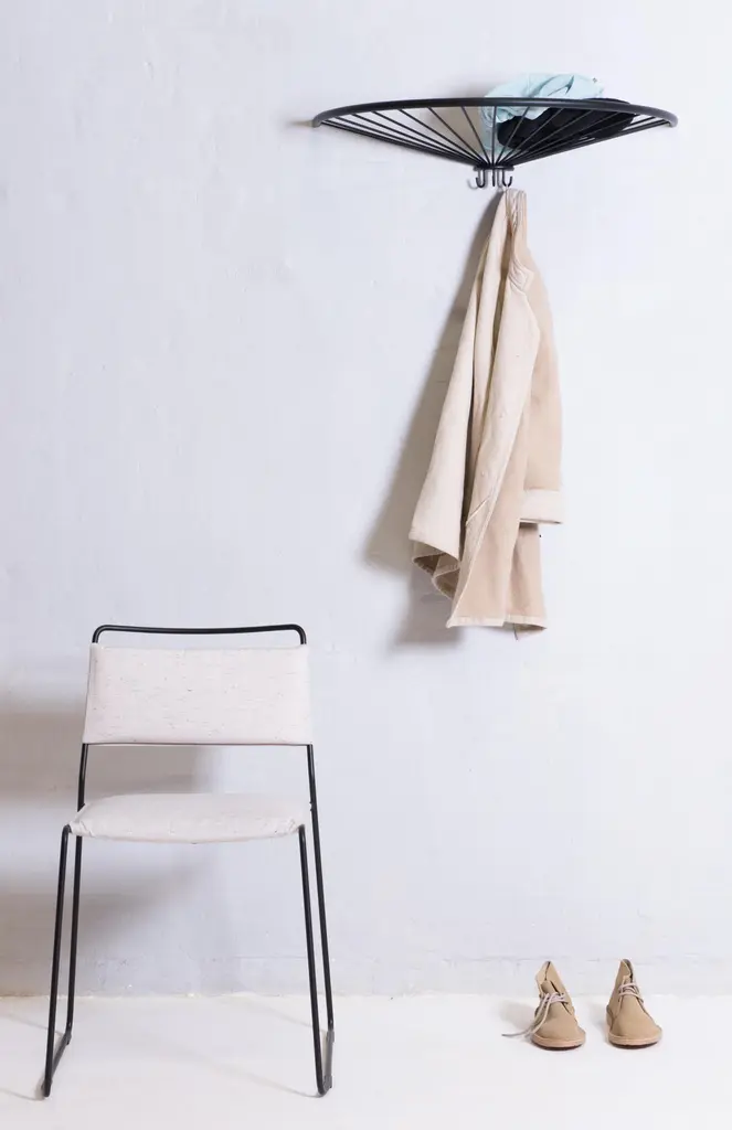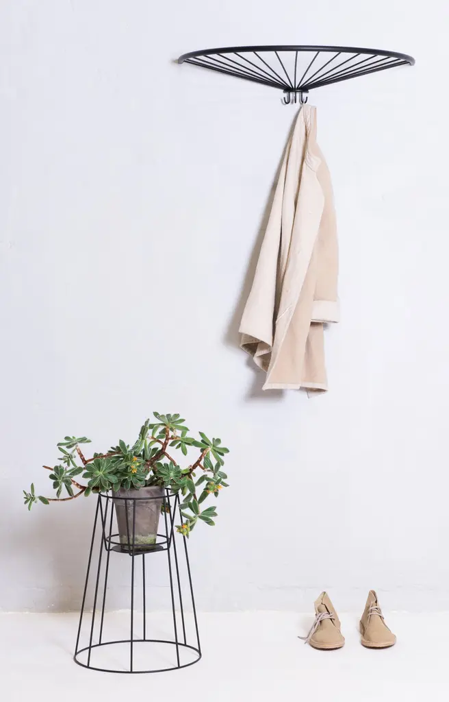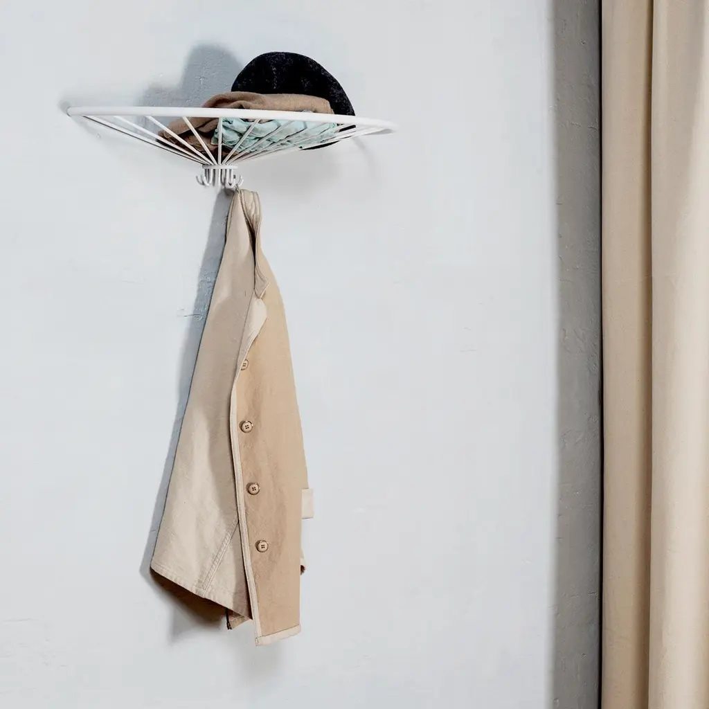 Pina Hat Shelf by OK DesignDimensions: D 35 x W 68 x H 13 cm.Materials: Powder-coated metal.Available in black, white, sea green, pigeon blue, or dusty peach. Please contact us.The Pinna Hat Shelf is a stylish and functional accessory for any home. Designed by Finnish designer Anni Pitkäjärvi, this hat shelf and coat rack features a simple yet powerful design that is highly decorative in the hallway and entrance. The shelf is made of powder-coated metal and comes with a shelf and 5 hooks to store your hats, coats, and other accessories.Pinna picks up on OK Design’s tradition for shapes and silhouettes. Its sleek and minimalist design makes it suitable for any modern interior. This shelf is perfect for small spaces and can be easily mounted on the wall.OK Design was founded by the Danish couple: Jacob Fasting and Kirsten Krogh. Jacob began his entrepreneurial life by founding the first bicycle courier company in Mexico City. Later his adventurous spirit led him down a new, creative path together with the architect Kirsten Krogh.Kirsten and Jacob initiated their success in Europe by introducing the traditional woven furniture from Mexico. Today they create in-house furniture as well as work in collaboration with international designers.OK Design is based in Copenhagen, the environmentally friendly production takes place in the EU, and the designs are sold in more than 40 countries worldwide.Their latest endeavour is Stella Atlántico in Isla de la Palma. A 4 floor building reaching towards the stars and located on the rim of the world’s largest erosion crater. Stella Atlántico functions as a combined visual showroom and holiday home.