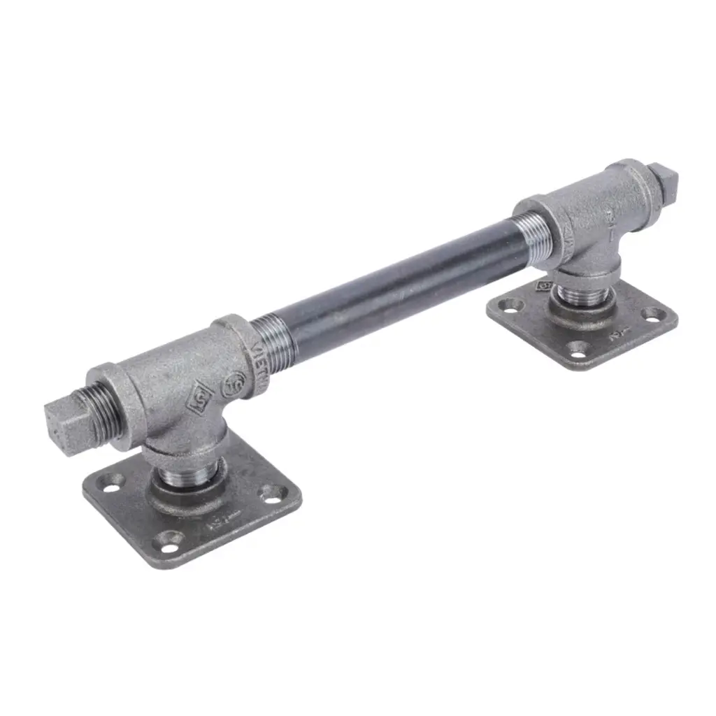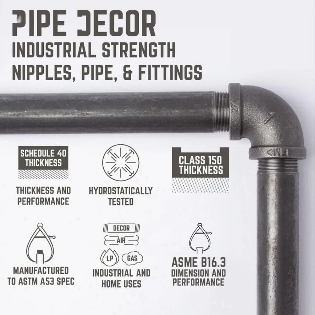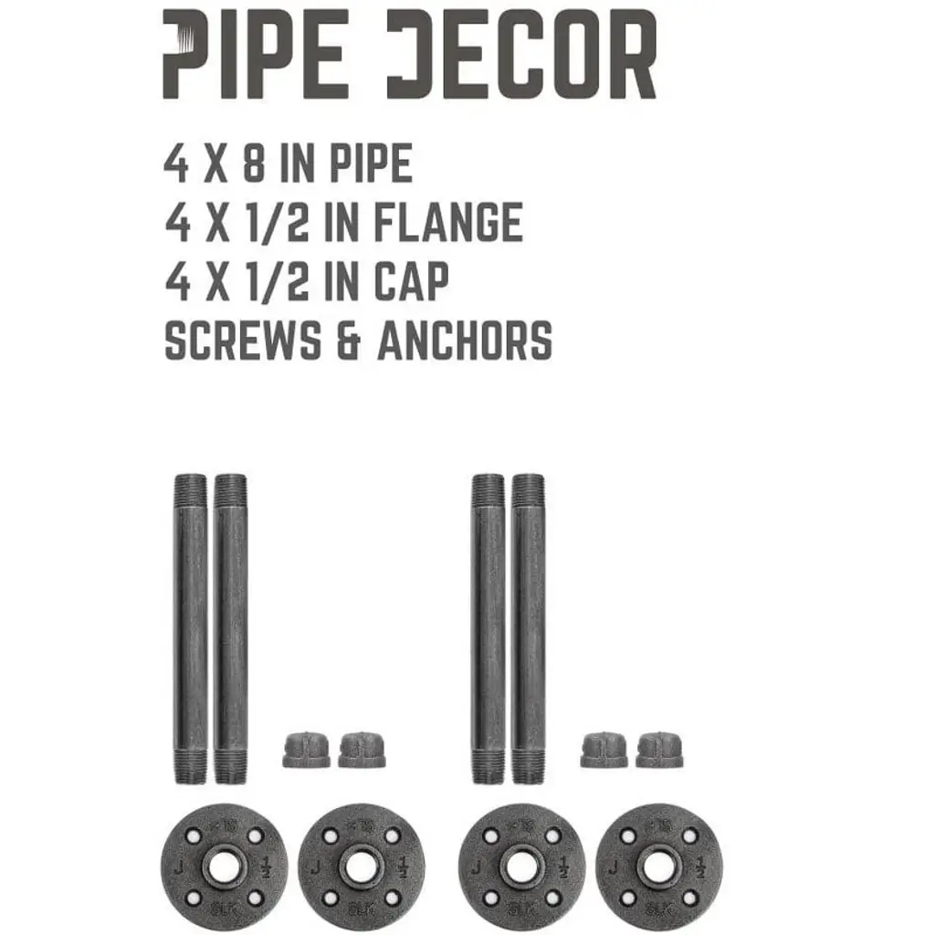 Pipe Decor 8 in. straight industrial shelf brackets come in a set of four, adding eye-catching style and sturdy support to your shelves. Crafted from heavy-duty iron fittings and black steel pipe, these brackets pair beautifully with woods of various colors and sizes. They highlight your sense of style and attention to detail while fitting a wide range of aesthetics, including steampunk lighting, industrial, factory, French country farmhouse, vintage, retro reclamation, and DIY. You will know Pipe Decor parts and accessories when you hold them. Beauty and beast. Strength and style. This is real industrial pipe for your creative design needs—accept no substitutes. All Pipe Decor pipe and fittings come coated in a light industrial grease to prevent rusting. Clean and seal each piece before assembly to keep them rust-free, then apply polyurethane spray to protect the surface from rust and scratches. The kit includes all materials necessary to make four brackets. Each assembled bracket will hold a shelf up to 7.25 in. deep and is weight-tested to support up to 50 lbs. with anchors and screws in drywall. For maximum stability, we recommend securing the flanges into at least one wood stud. The pipe is made from welded schedule 40 steel, and the final color varies from dark grey to black.