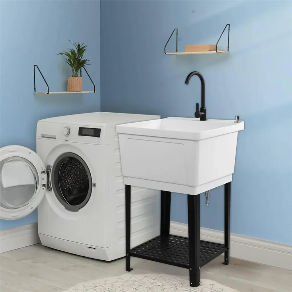 DescriptionDesigned for versatility and convenience, this freestanding sink is crafted from durable plastic, making it lightweight yet highly resistant to impacts.The freestanding design allows for easy installation and placement in any room, whether it's a utility room, garage, workshop, or laundry area. The compact size fits neatly into tight spaces, making it an ideal choice for areas where space is at a premium.The sink itself is deep and spacious, providing ample room for washing larger items such as pots, pans, or even small pets. The smooth surface is easy to clean and maintain, resisting stains and odors. The included faucet and drain assembly are simple to install and operate, ensuring a hassle-free user experience.FeaturesEfficient Cleaning Experience: The spacious interior of the sink can easily accommodate a large amount of clothing or pet supplies, making it convenient for deep cleaning. At the same time, the black faucet design is unique, not only beautiful but also practical, providing stable water flow control to meet various cleaning needs.Convenient Drainage System: equipped with large diameter drainage outlets, stretchable drainage pipes, and convenient press drainage buttons for quick drainage with a gentle press, making it less likely to clog. Whether it's washing the mop, soaking clothes, or handling other cleaning tasks, it can be easily handled.Humanized Detail Design: The soap press bottle is convenient for you to easily access dishwashing detergent or laundry detergent, and the black grid tray can be used to store laundry products or drain items, increasing convenience of use. In addition, the product also considers the convenience of installation, simple assembly can be used without the need for professional personnel to operate.Multi-functional Applicable Scenarios: This multifunctional practical sink is not only suitable for laundry rooms, but can also easily integrate into various scenarios such as basements, garages, and utility rooms, making it an ideal choice for home cleaning, pet care, and daily miscellaneous tasks.