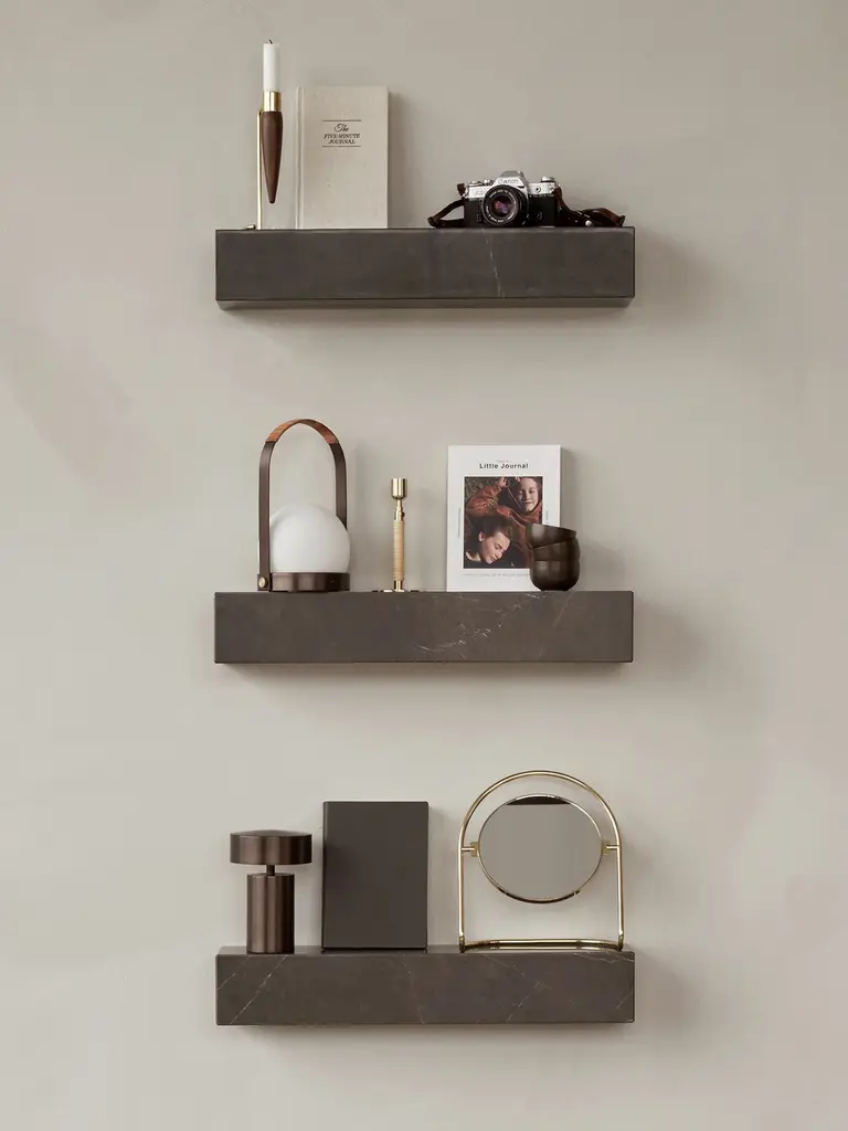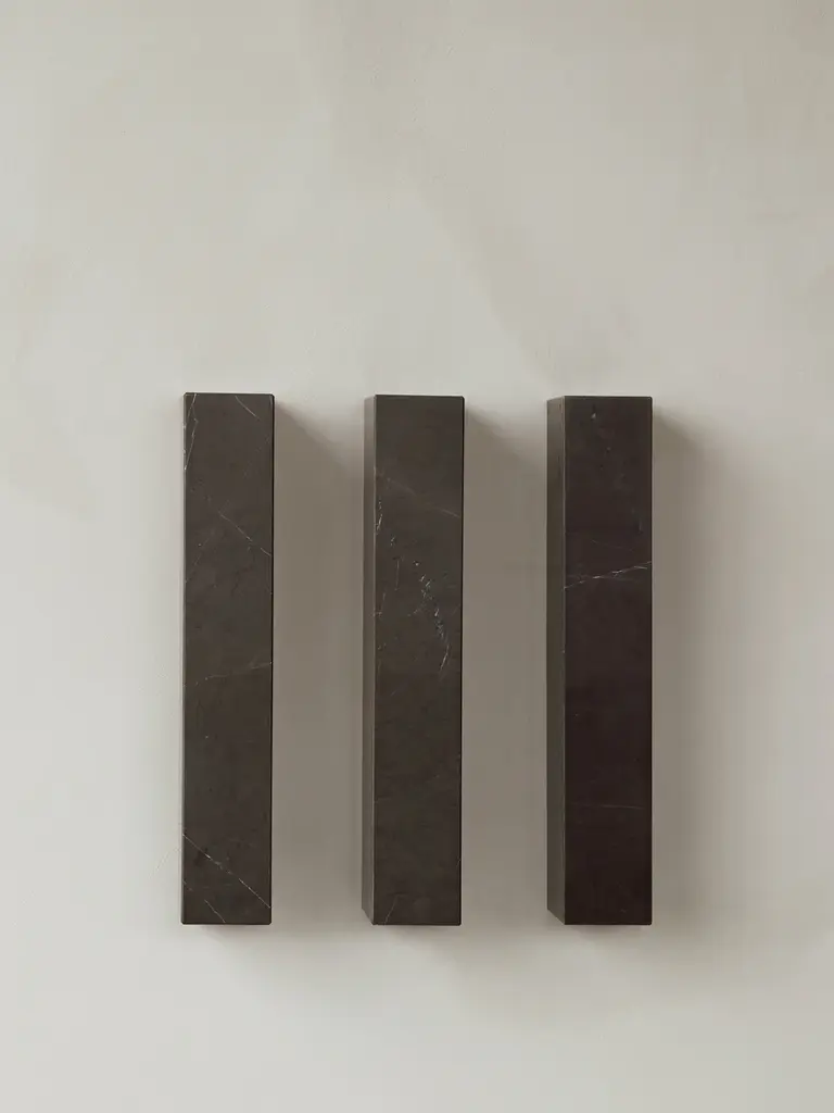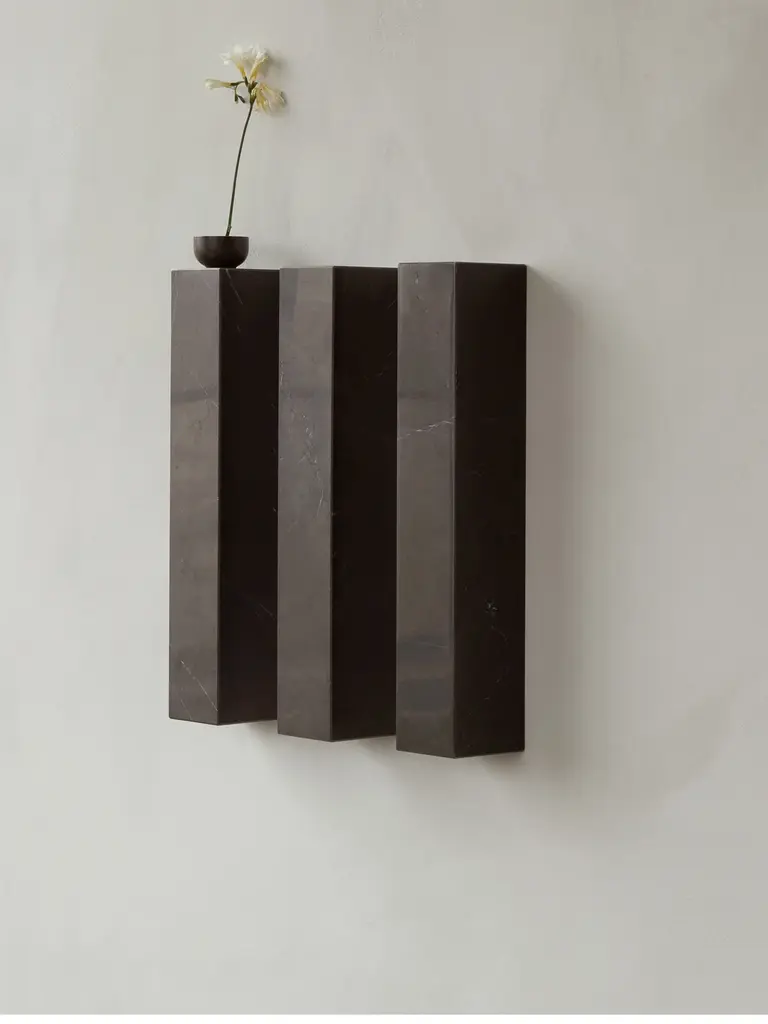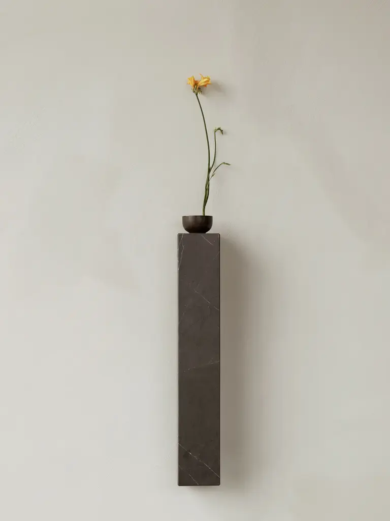 The minimalist profile of the Plinth Shelf is shaped from Grey Kendzo or Kunis Breccia, a rich, brilliant white veined marble, carefully selected for its inherent beauty and light-reflecting qualities. Equal parts elegant and purposeful, the 60 cm long shelf can be attached horizontally to a wall for use as a display ledge or bookshelf, or vertically as a wall-mounted podium on which to showcase a favorite object.