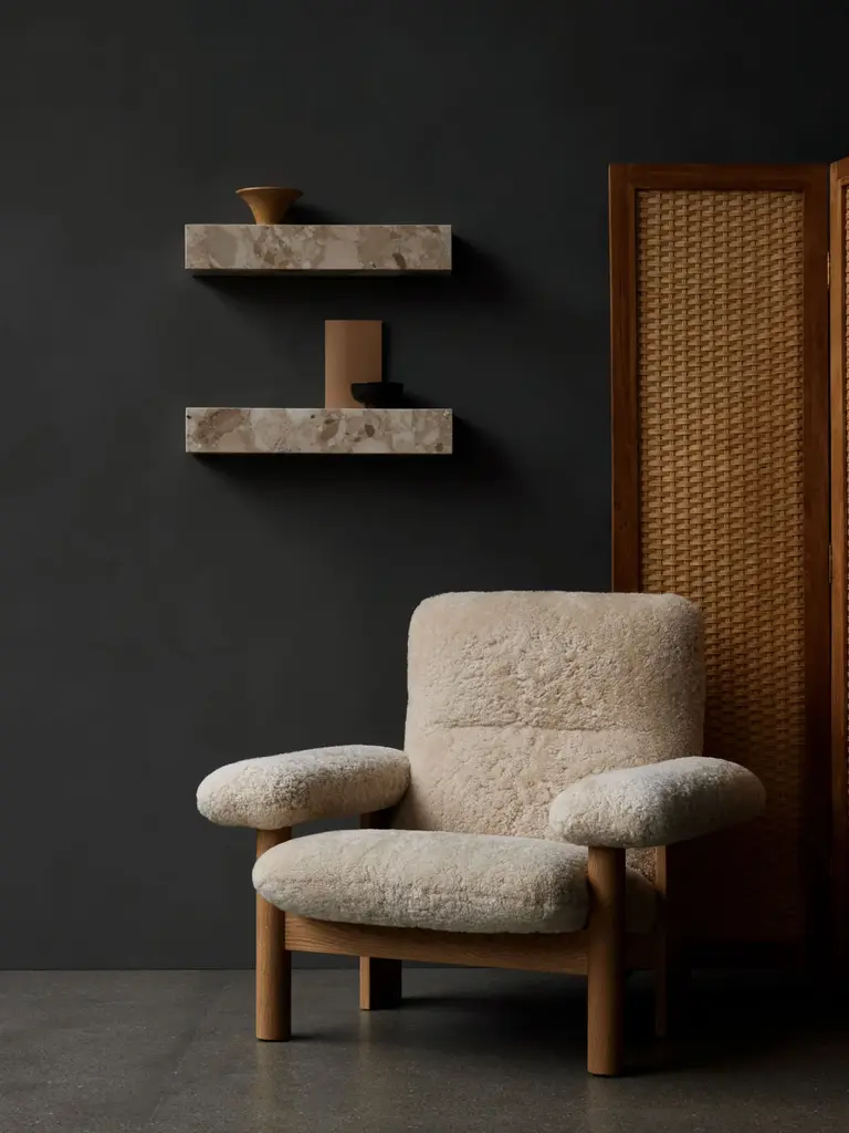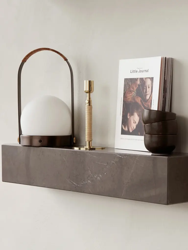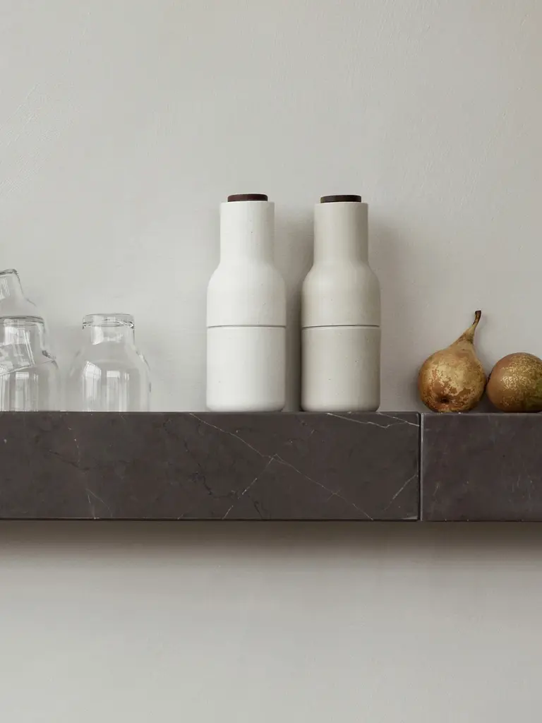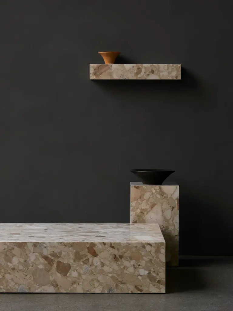 The minimalist profile of the Plinth Shelf is shaped from Grey Kendzo or Kunis Breccia, a rich, brilliant white veined marble, carefully selected for its inherent beauty and light-reflecting qualities. Equal parts elegant and purposeful, the 60 cm long shelf can be attached horizontally to a wall for use as a display ledge or bookshelf, or vertically as a wall-mounted podium on which to showcase a favorite object.