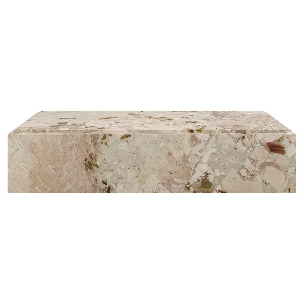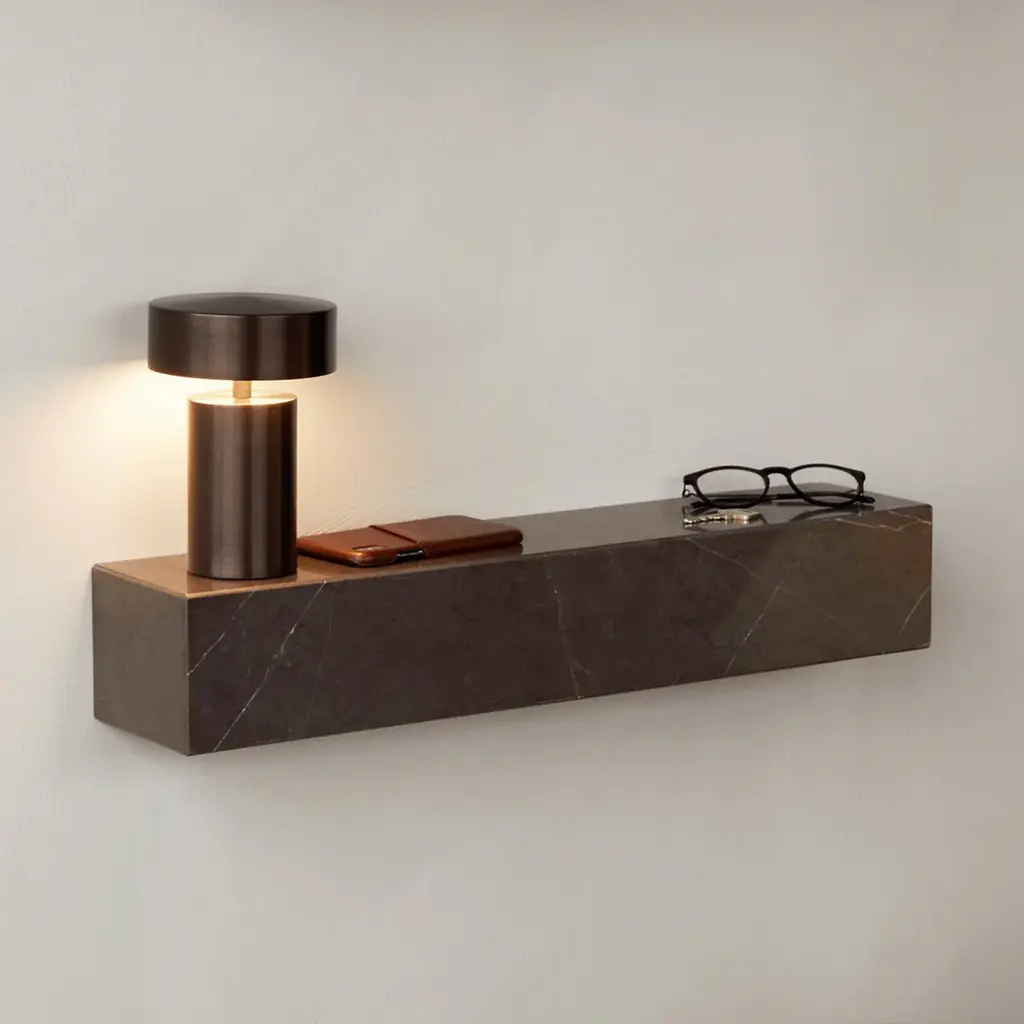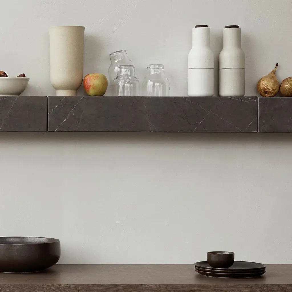 The minimalist profile of the Plinth Shelf is shaped from Grey Kendzo, a rich, brilliant white veined marble, carefully selected for its inherent beauty and light-reflecting qualities. Equal parts elegant and purposeful, the 60 cm long shelf can be attached horizontally to a wall for use as a display ledge or bookshelf, or vertically as a wall-mounted podium on which to showcase a favourite object.