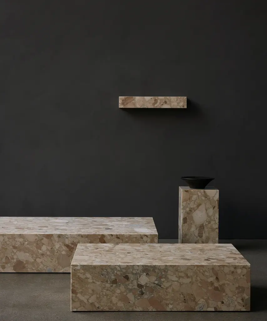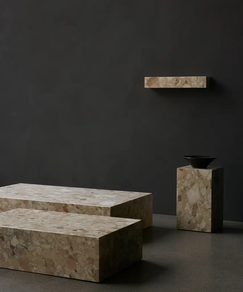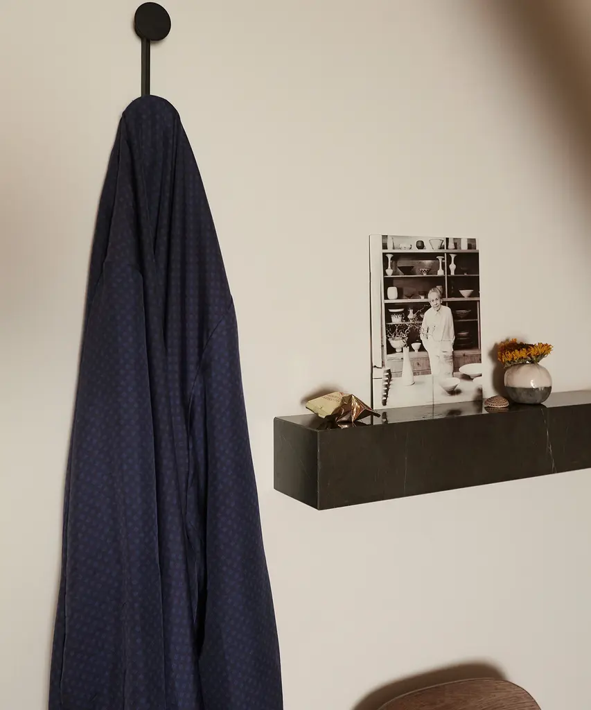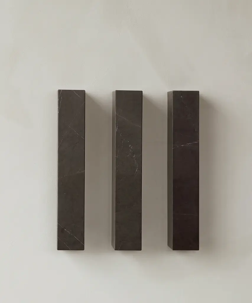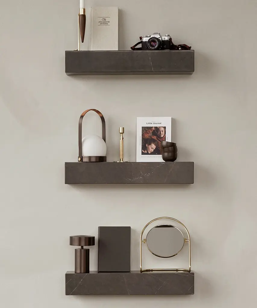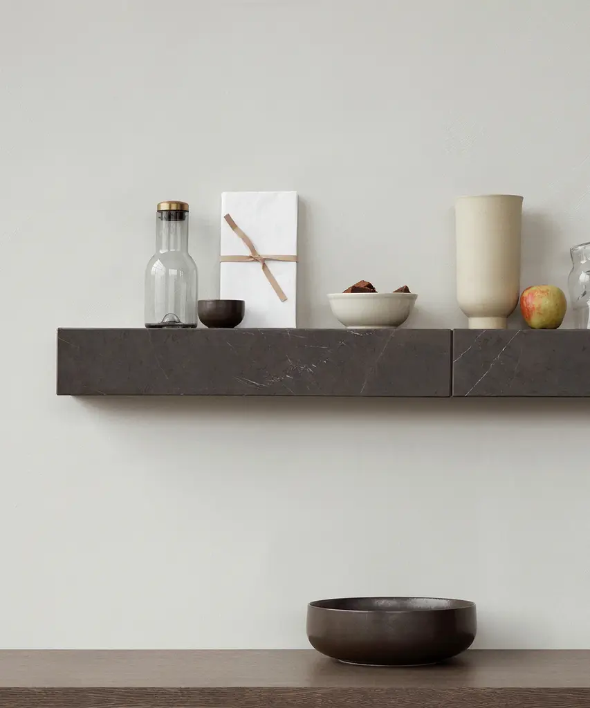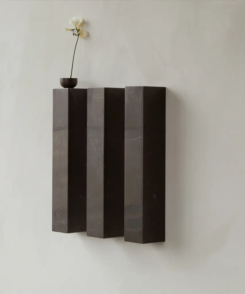 The minimalist profile of the Plinth Shelf is shaped from Grey Kendzo, a rich, brilliant white veined marble, carefully selected for its inherent beauty and light-reflecting qualities. Equal parts elegant and purposeful, the 60 cm long shelf can be attached horizontally to a wall for use as a display ledge or bookshelf, or vertically as a wall-mounted podium on which to showcase a favourite object. Designed by Norm Architects for the Danish design company, Audo Copenhagen.